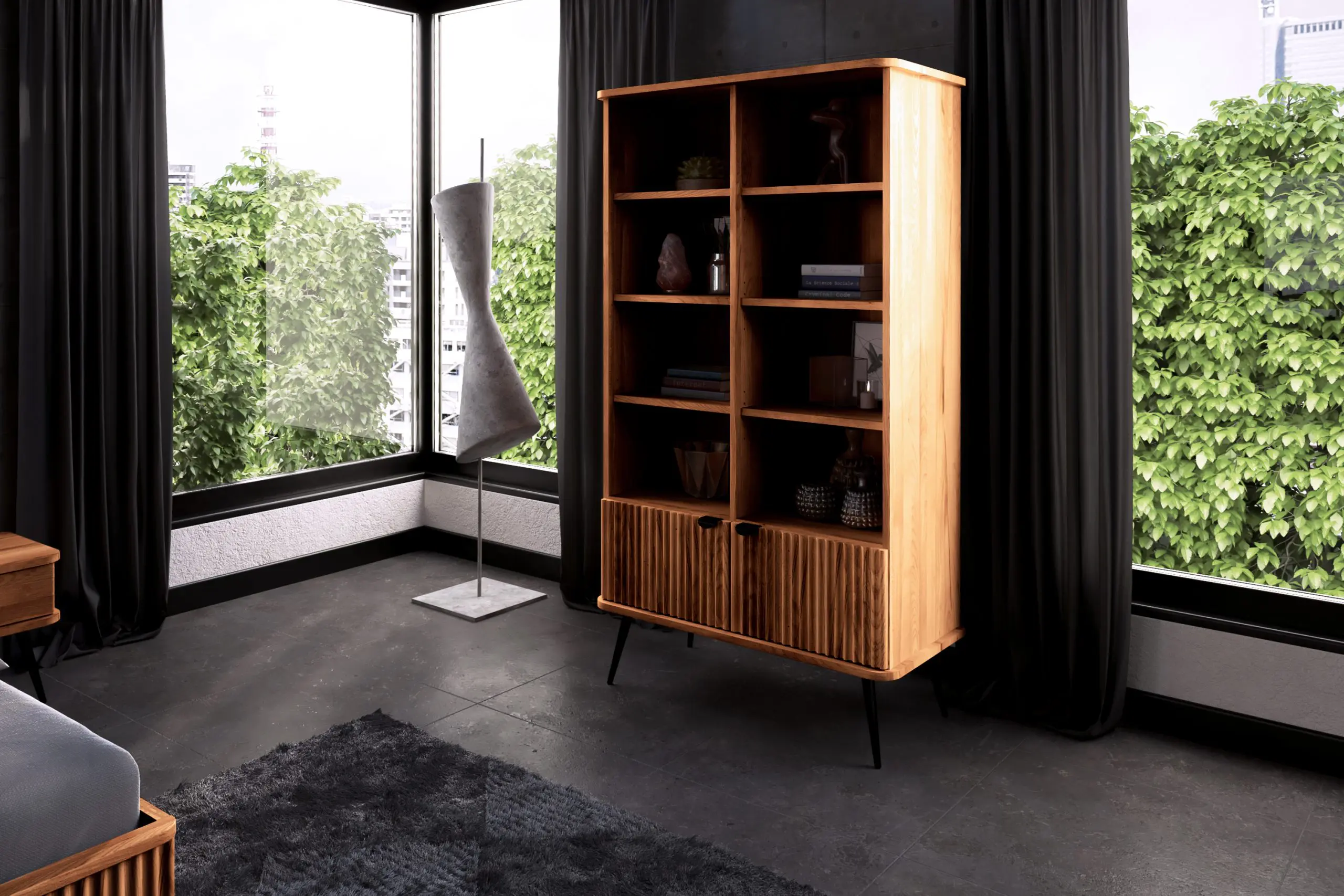 Skapet er laget i massivt tre, eik eller bøk, og leveres i flere oljede varianter som fremhever materialets naturlige skjønnhet og varme. De riflede frontene tilfører visuell rytme og dybde, men uten å virke dominerende.