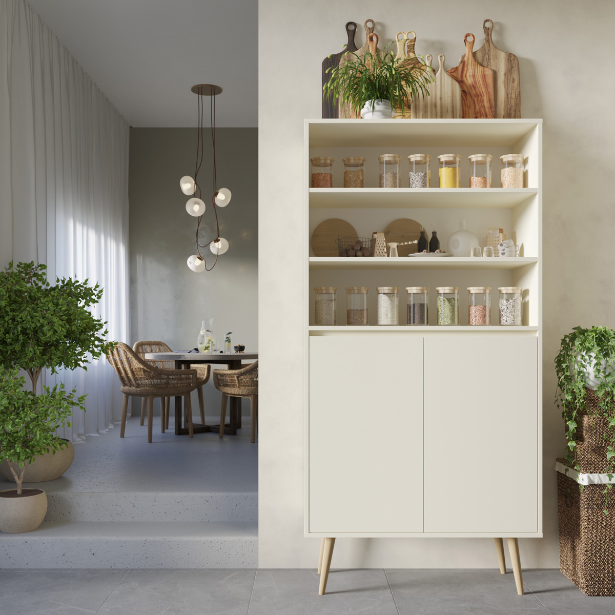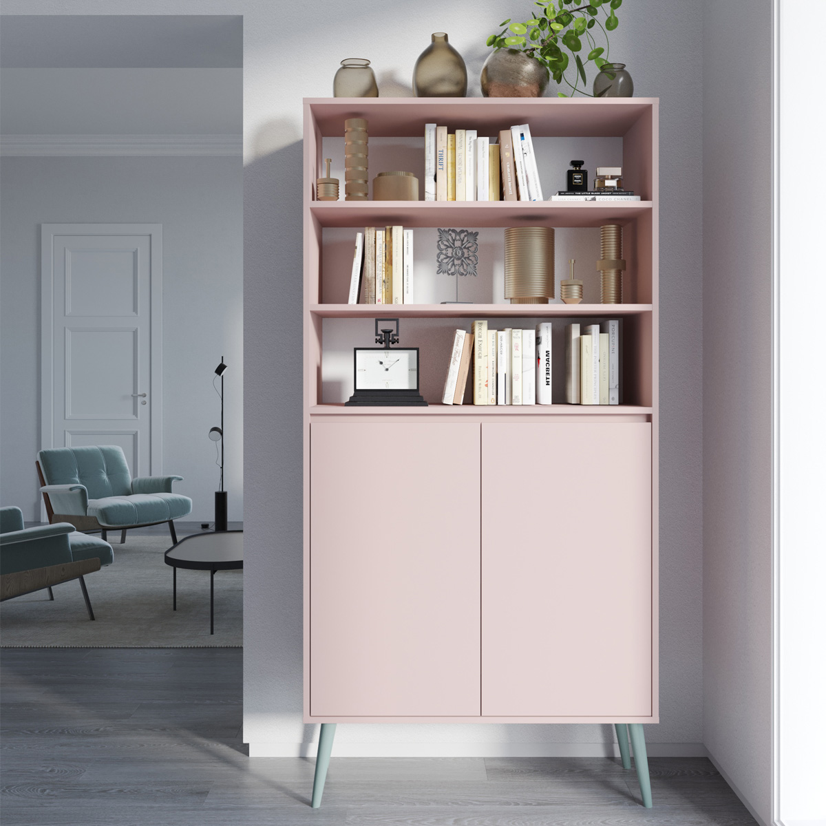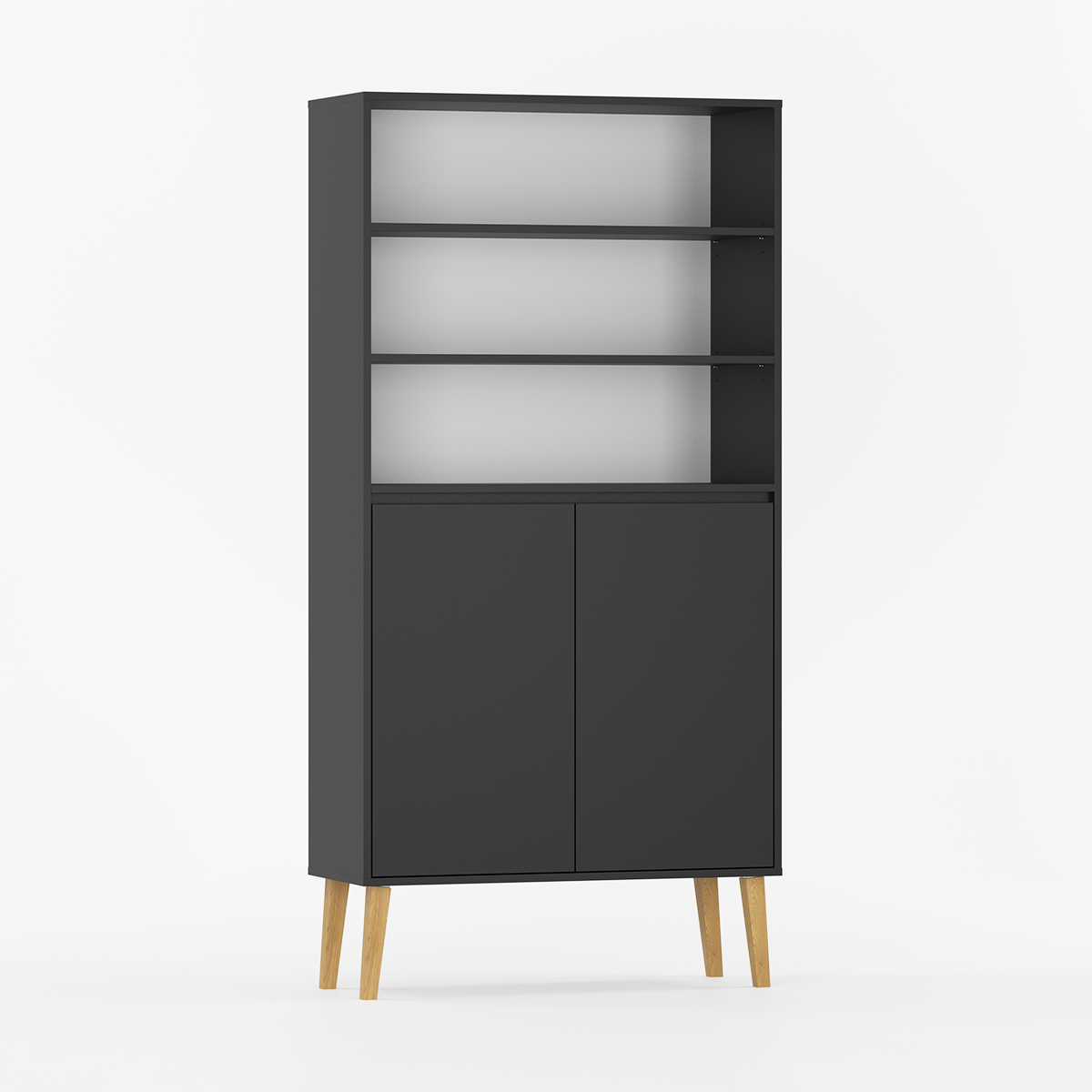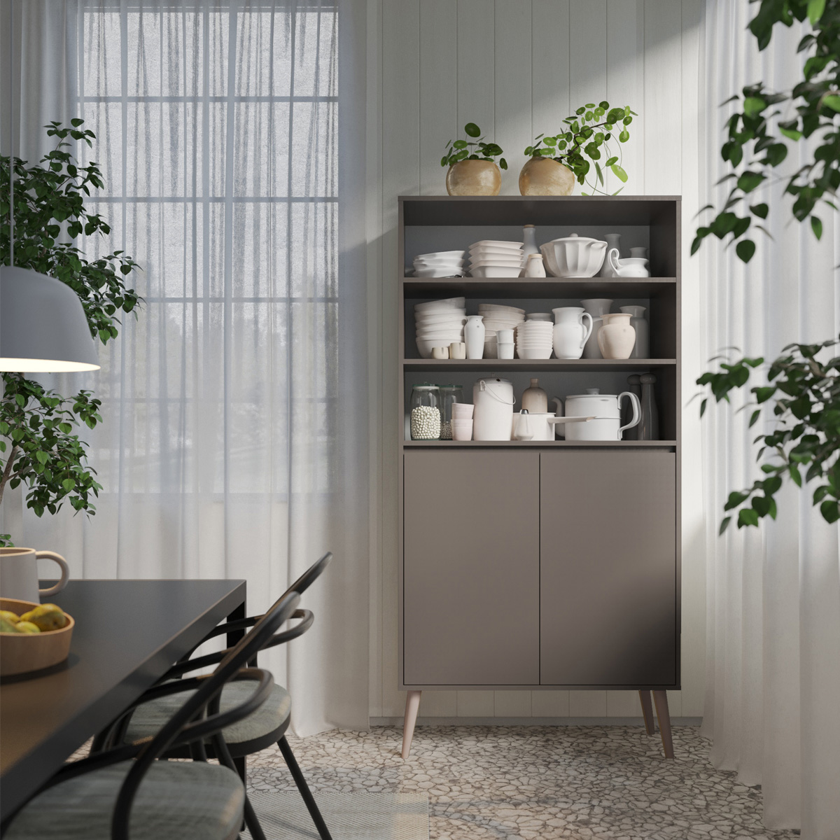 De åpne hyllene gir plass til bøker og dekor, mens det grepsfrie skapet under skjuler det du vil ha unna synet. Høye ben gir luft og gjør rengjøring enkelt. Størrelse, farge og ben tilpasser du selv.