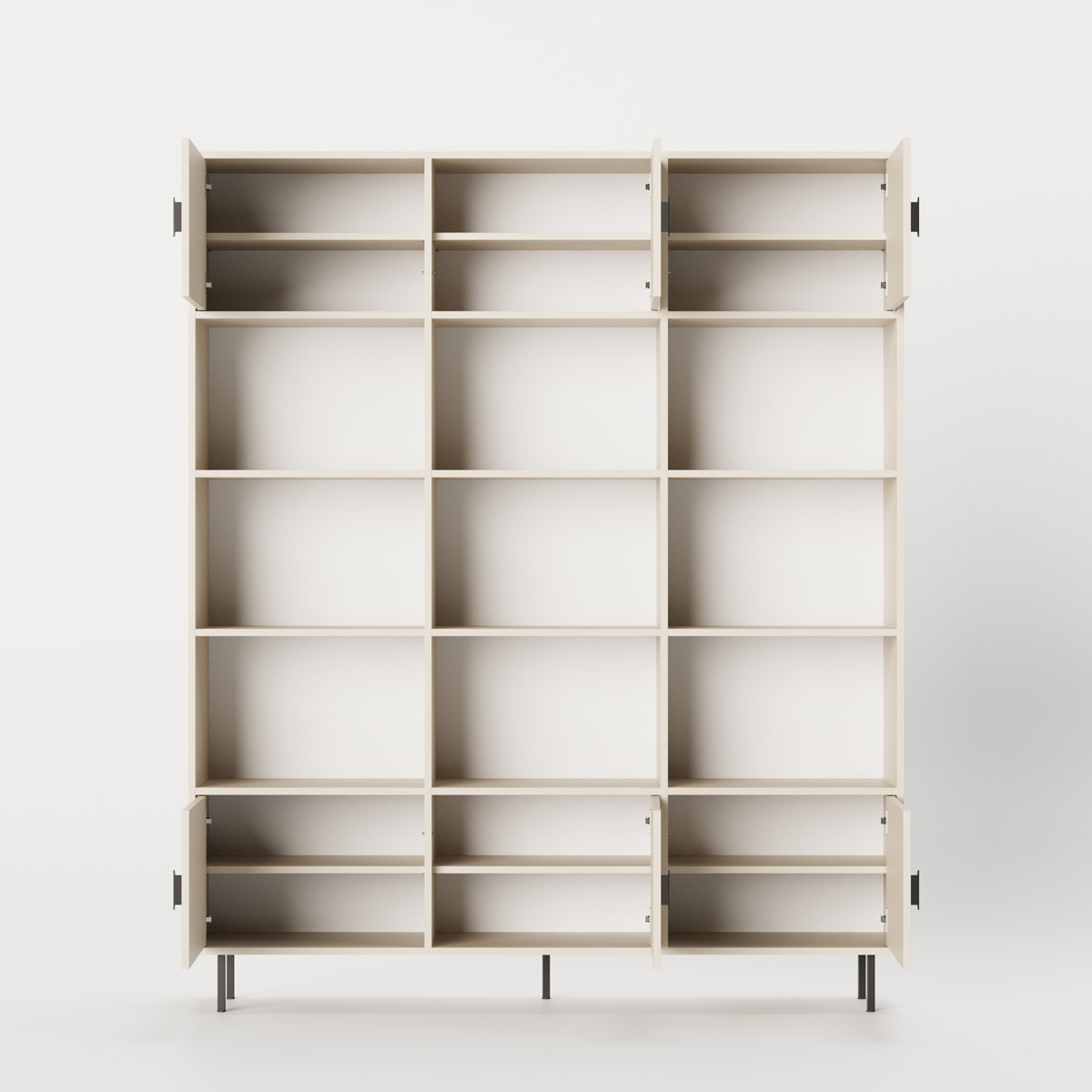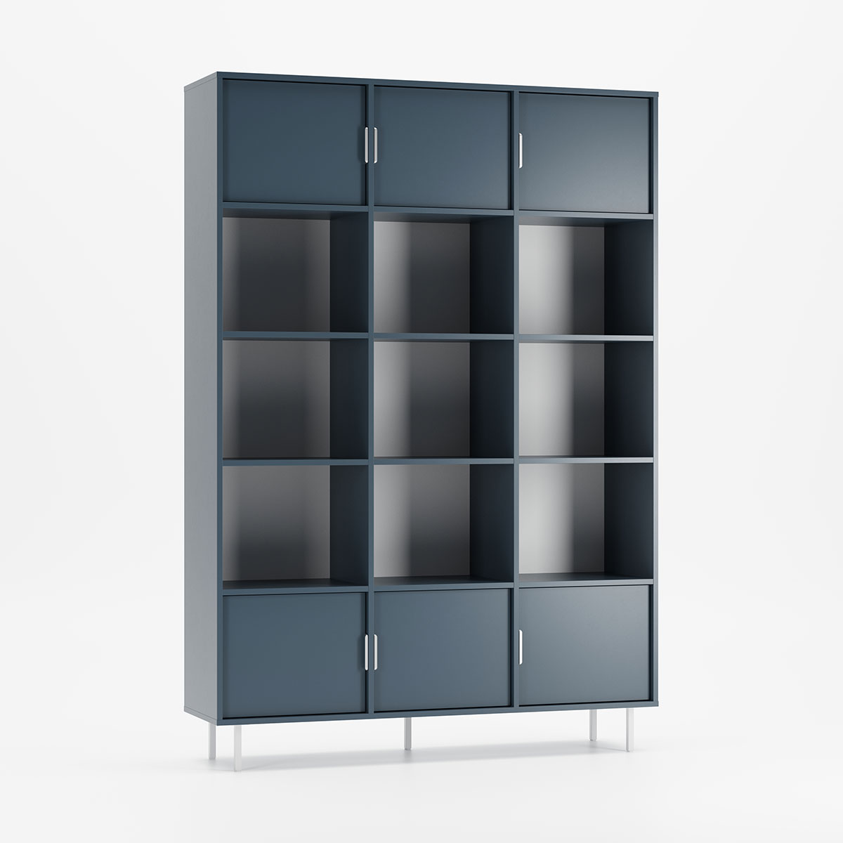 Tre seksjoner med seks flyttbare hyller gir fleksibel innredning. Sidehengte dører skjuler det du vil ha skjult. De karakteristiske frontene er trukket diskret tilbake. Fem solide stålben gjør rengjøring enkelt.