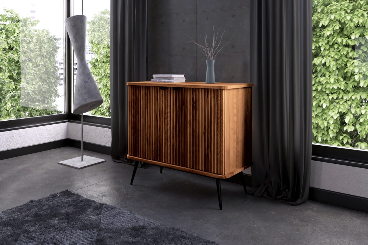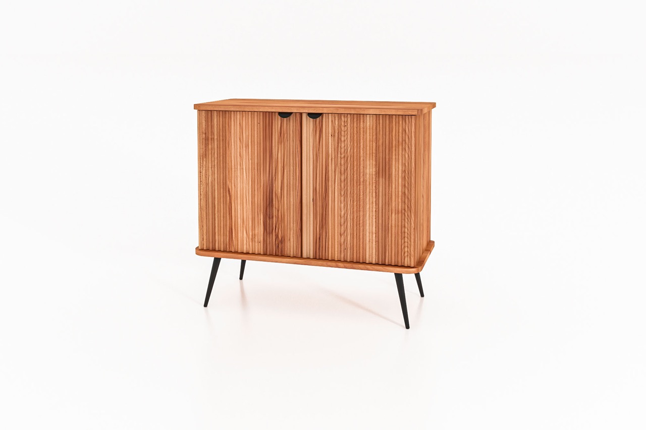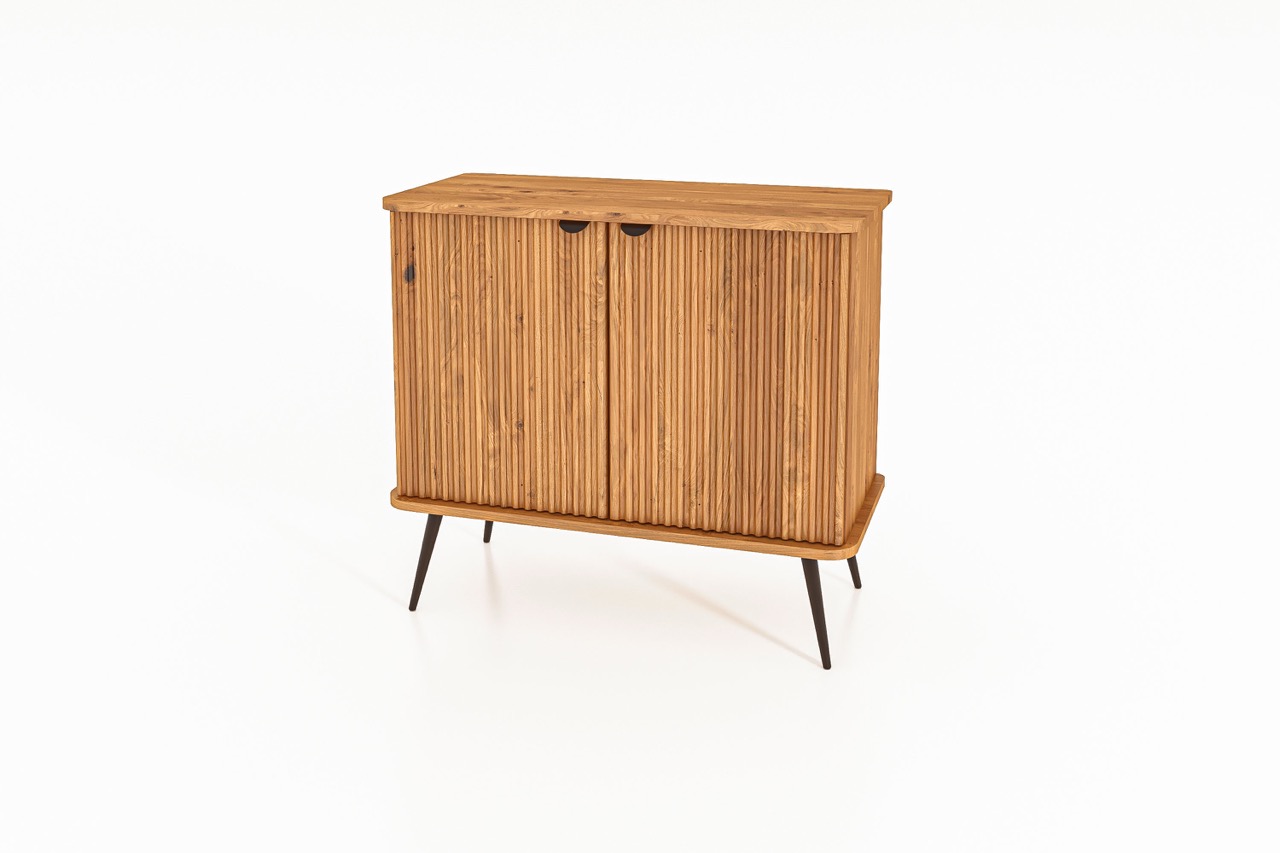 Utført i massivt tre – eik eller bøk – og tilgjengelig i flere oljede varianter, fremheves materialets naturlige spill og varme. De sorte metallgrepene og de slanke bena gir en moderne kontrast og understreker det skandinaviske uttrykket som kjennetegner serien.