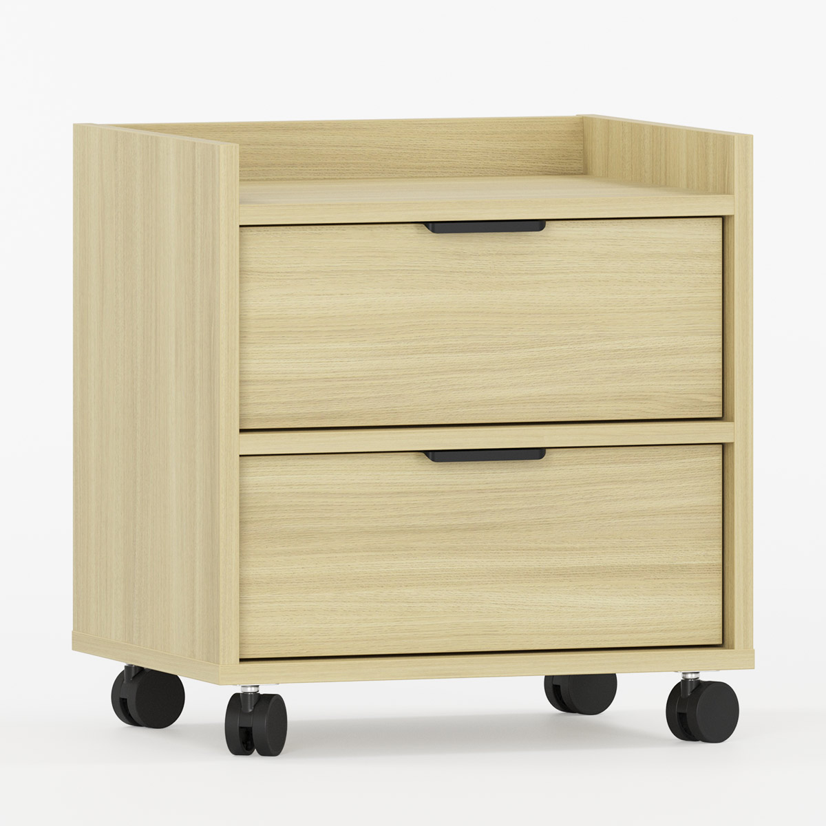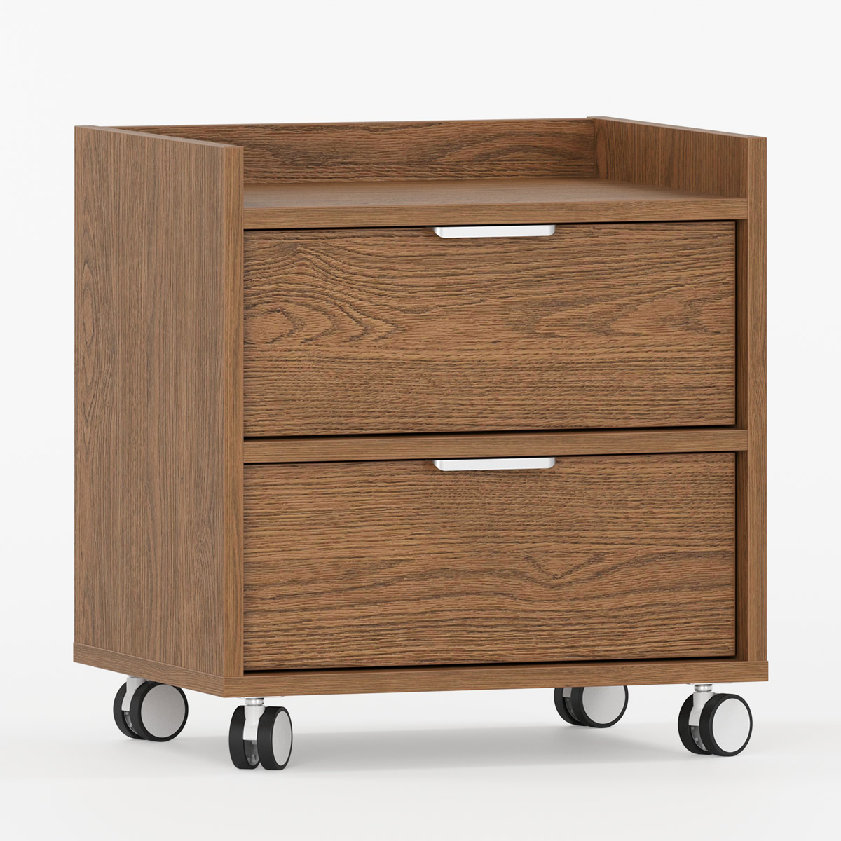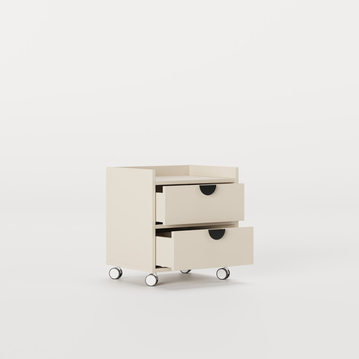To lettkjørende skuffer glir lydløst og tar vare på dokumenter og arbeidsverktøy med diskret omsorg. Bordplaten med beskyttende kant blir ditt lille arbeidsterrasse, mens fire stabile hjul gir deg frihet til å forme arbeidsplassen etter dagens behov. Fronter som trekker seg tilbake skaper ro i formspråket.