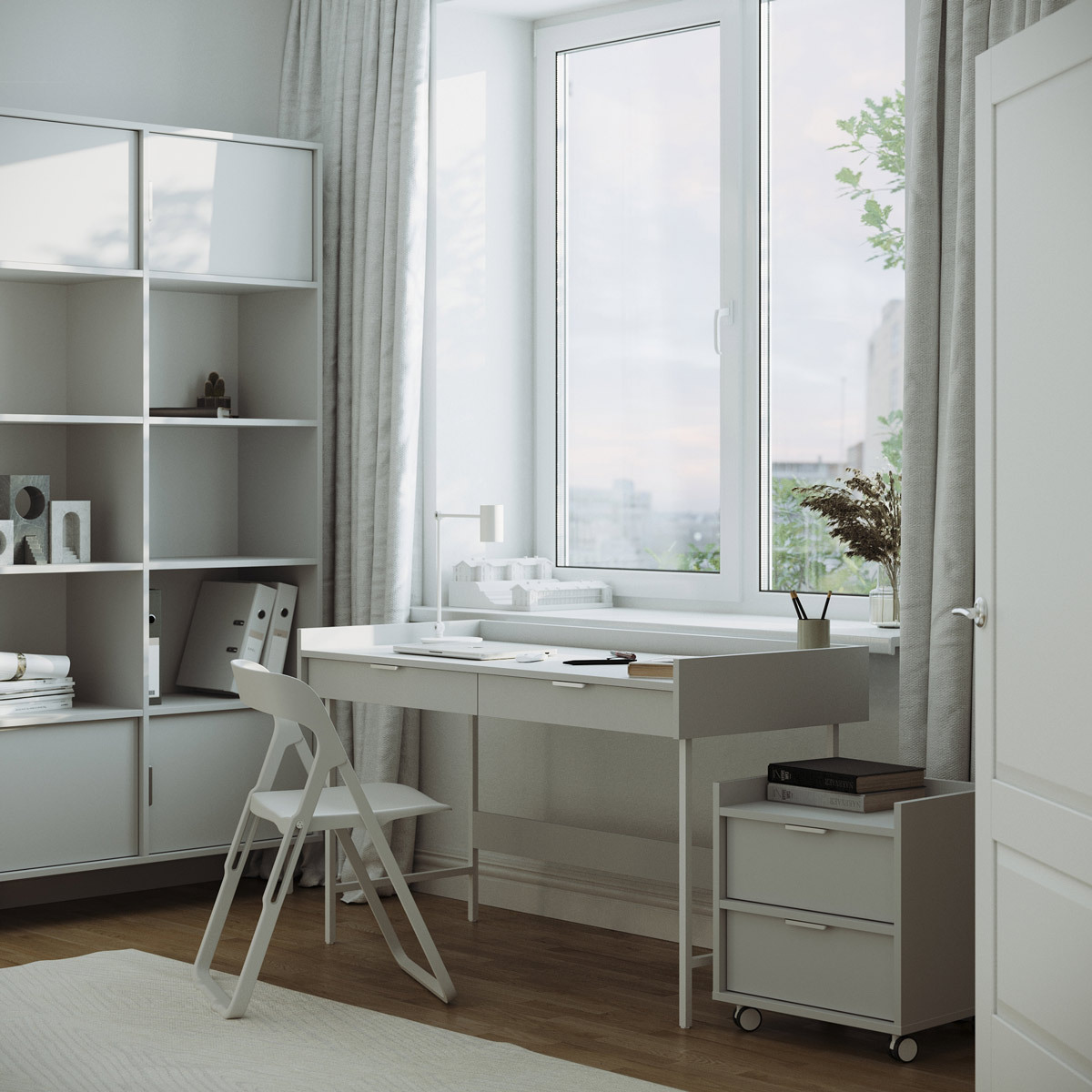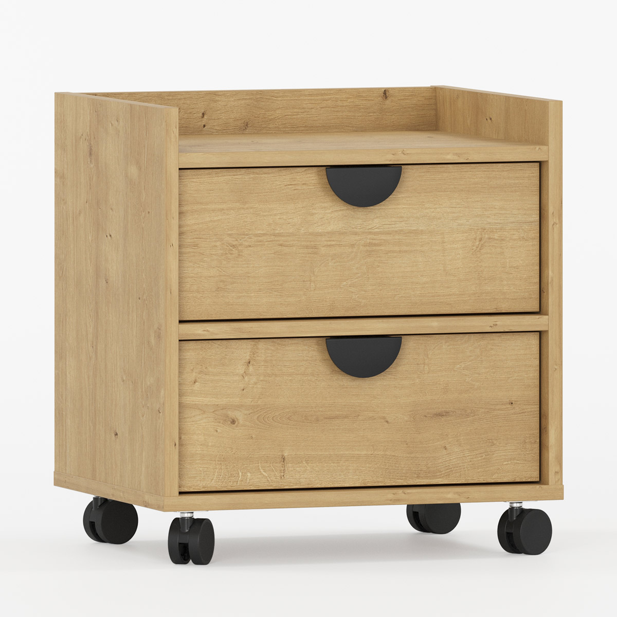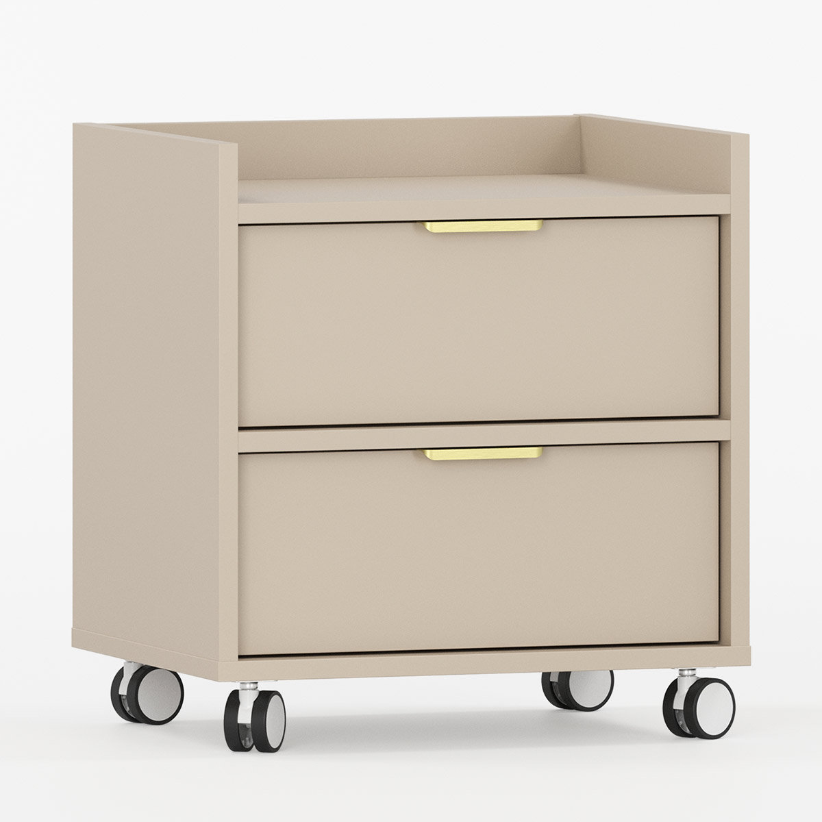 To lettkjørende skuffer glir lydløst og tar vare på dokumenter og arbeidsverktøy med diskret omsorg. Bordplaten med beskyttende kant blir ditt lille arbeidsterrasse, mens fire stabile hjul gir deg frihet til å forme arbeidsplassen etter dagens behov. Fronter som trekker seg tilbake skaper ro i formspråket.