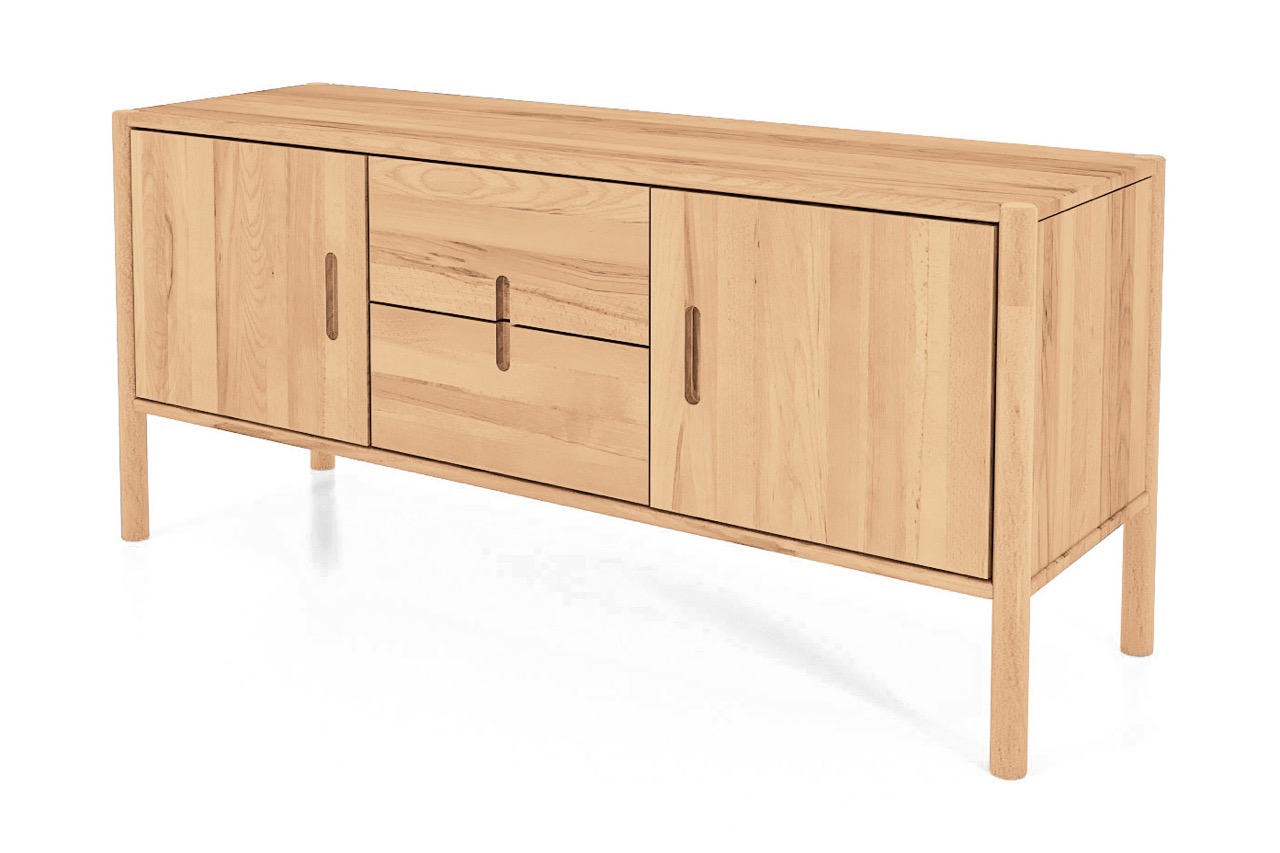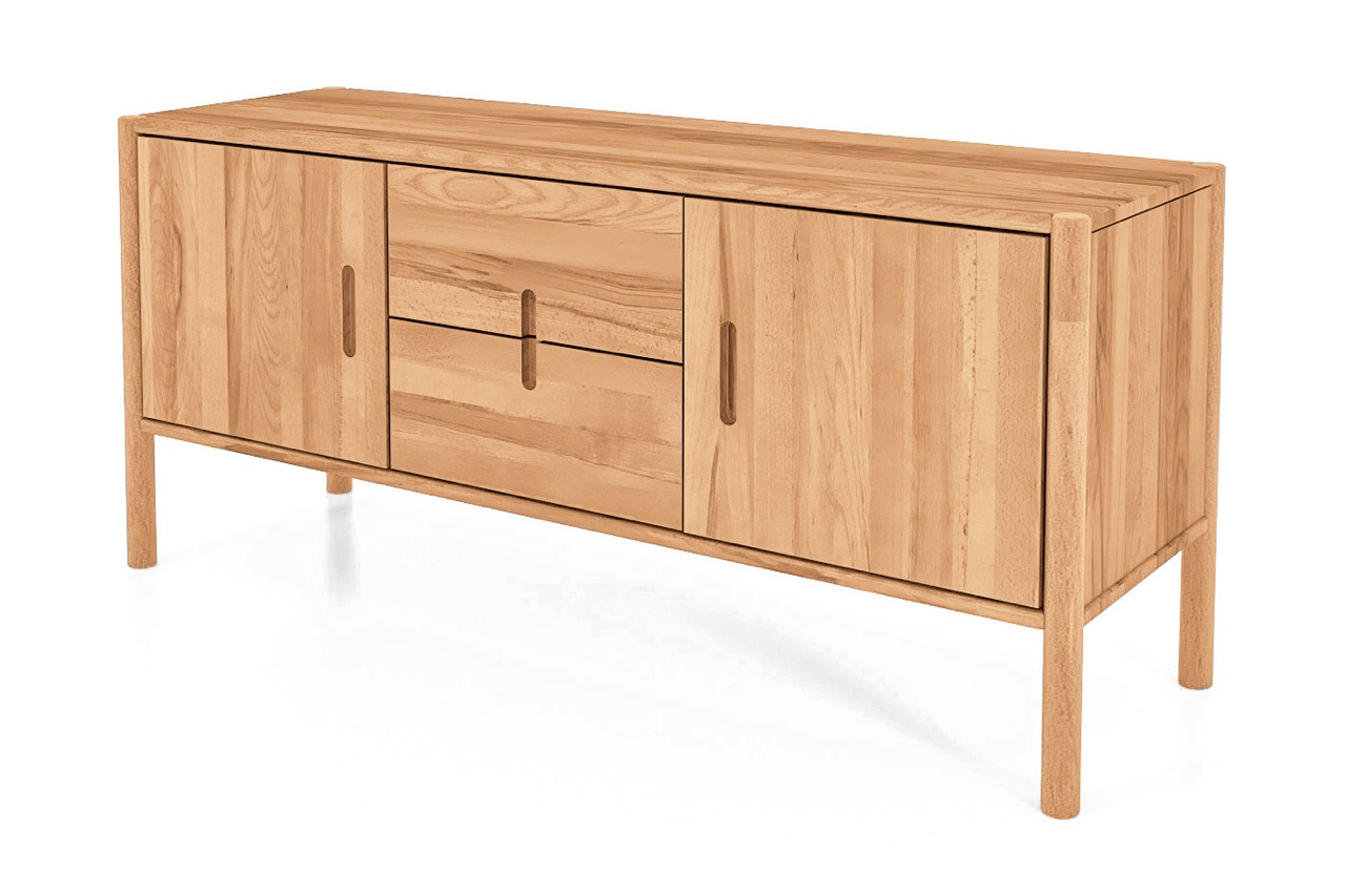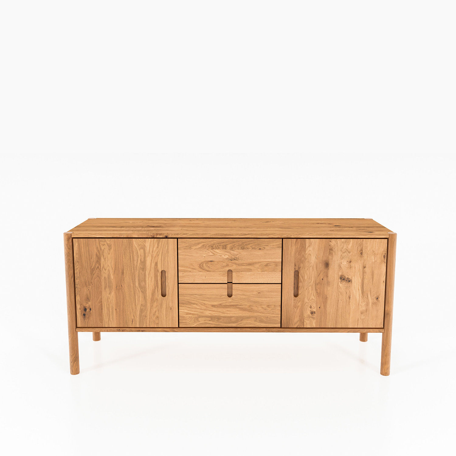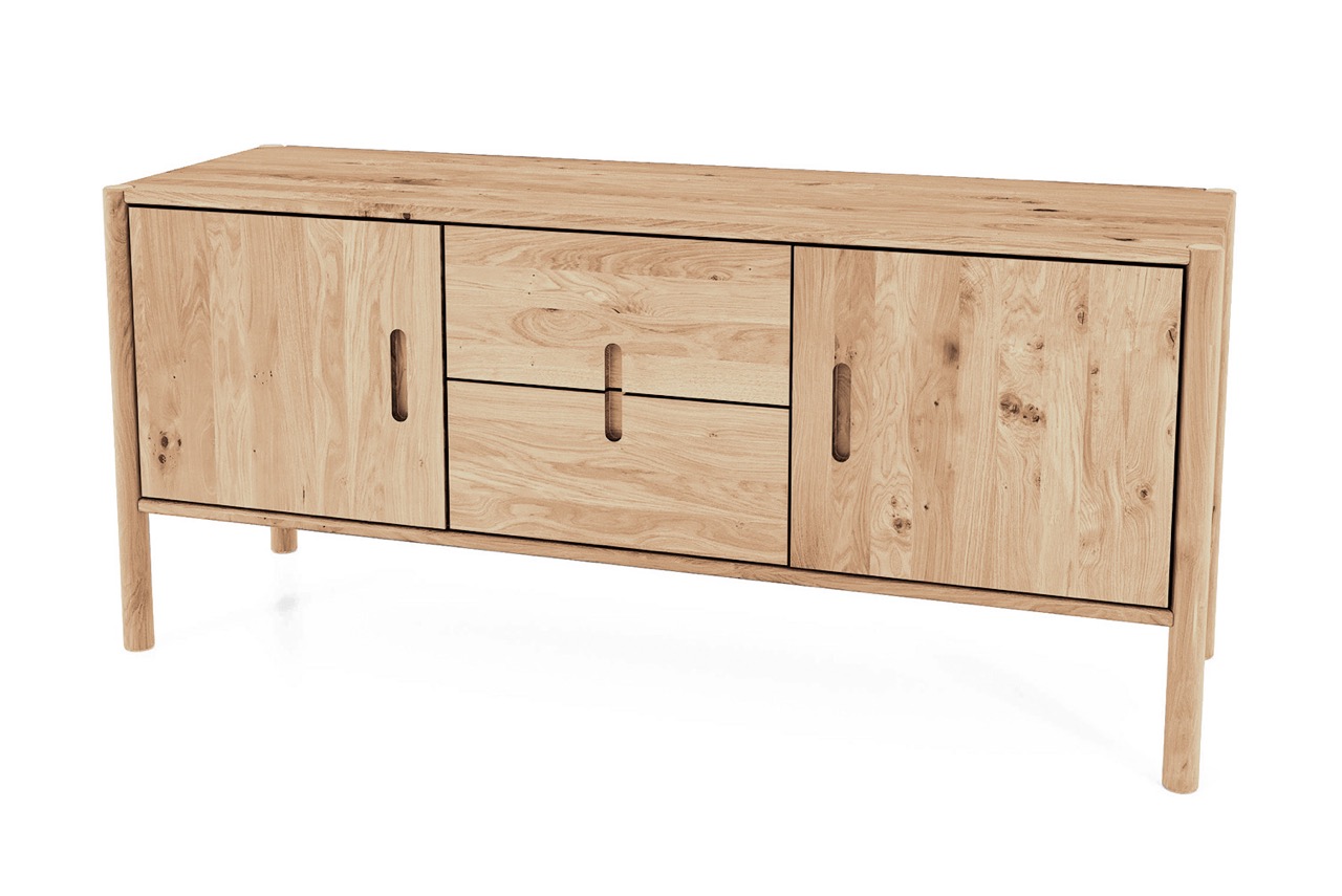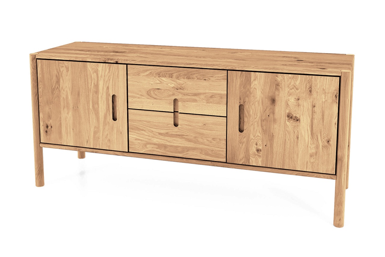 POLA forener massivt eik eller bøk med rene linjer og fresede grep som føles naturlige i hånden. To dører og to skuffer skaper orden med skandinavisk ro, mens de slanke benene gir møbelet en lett og luftig eleganse.