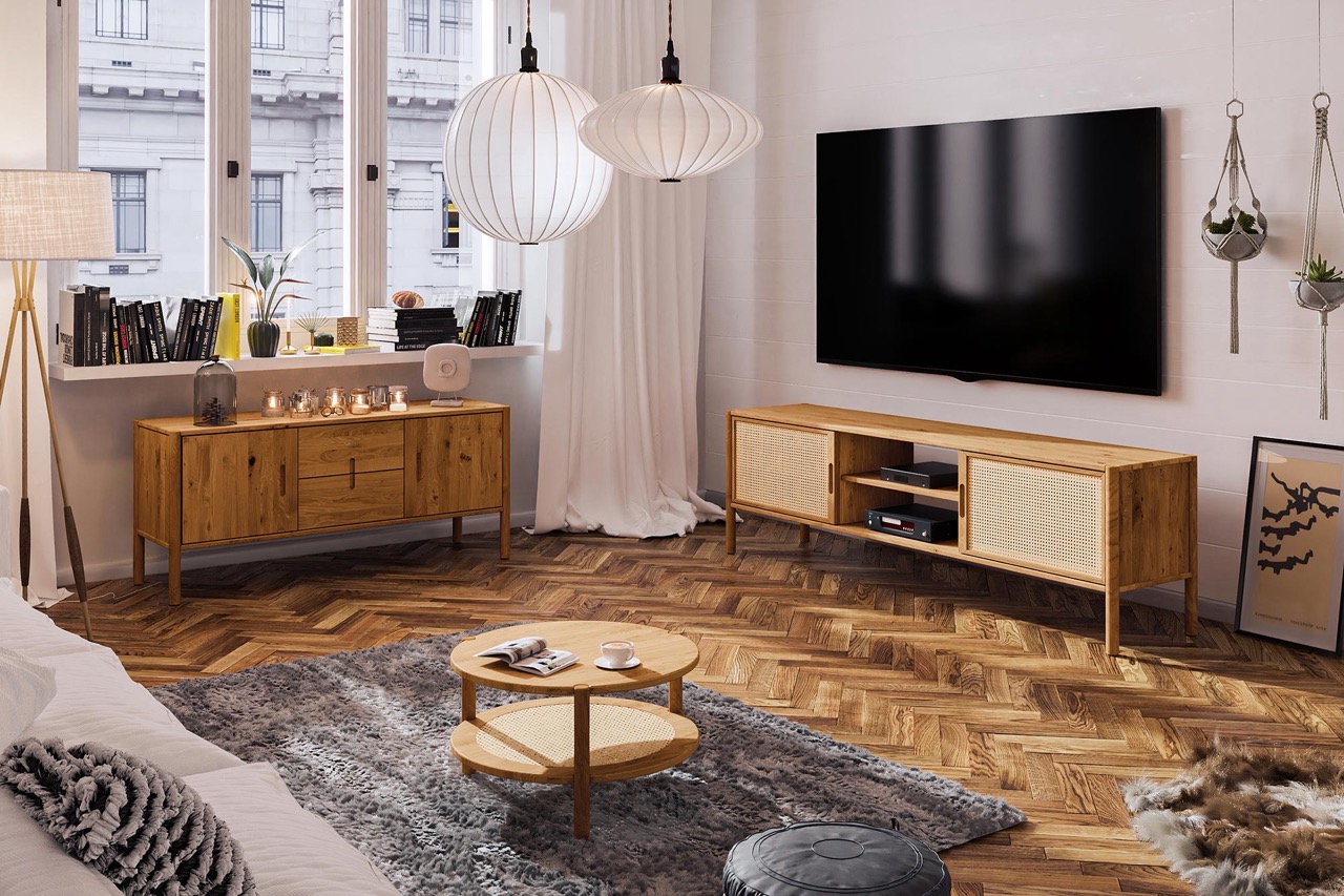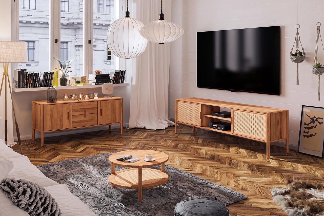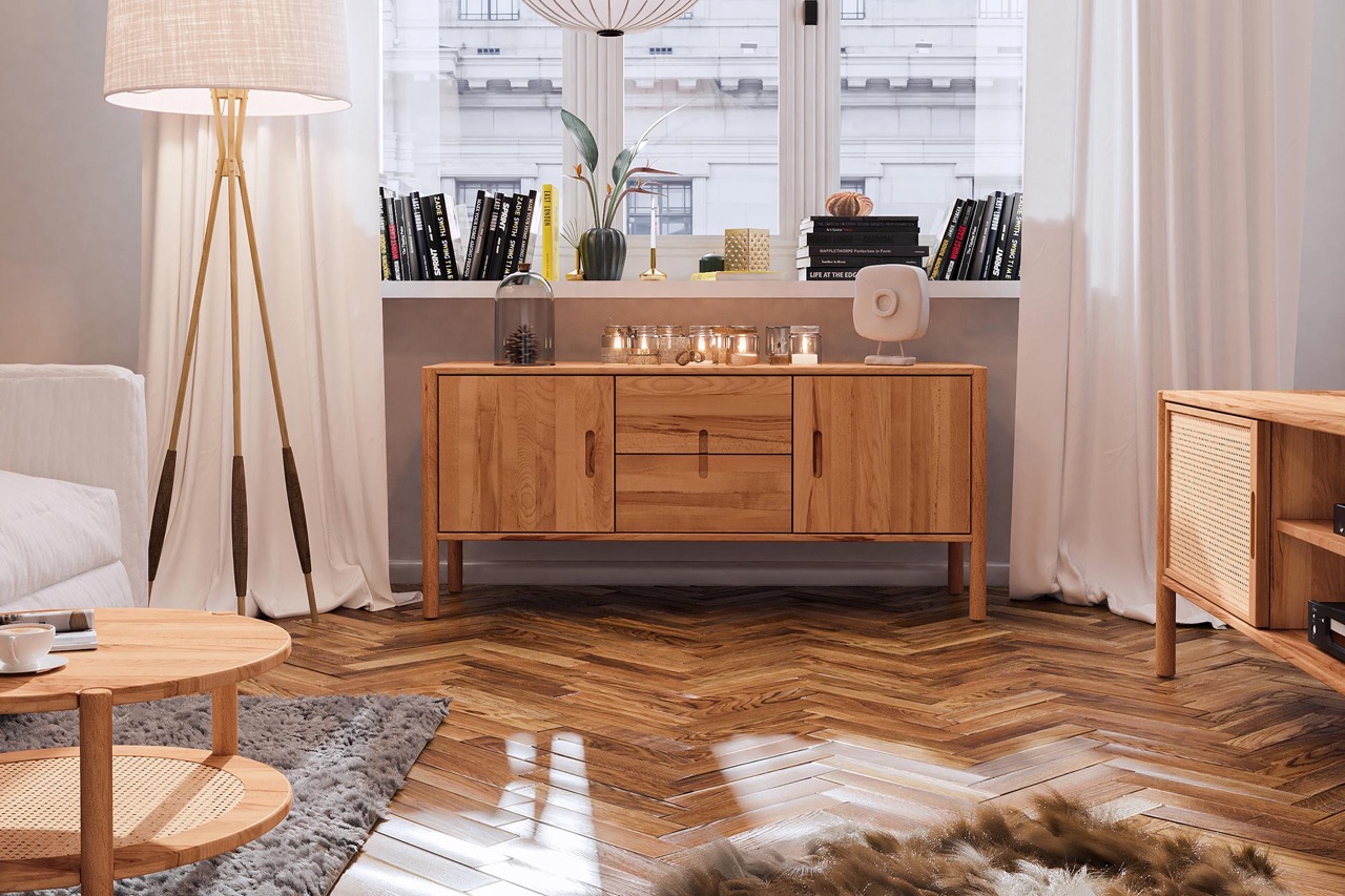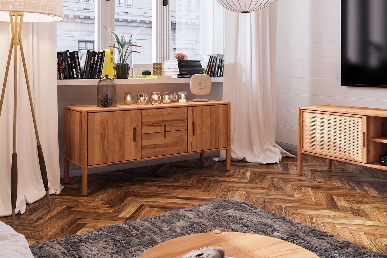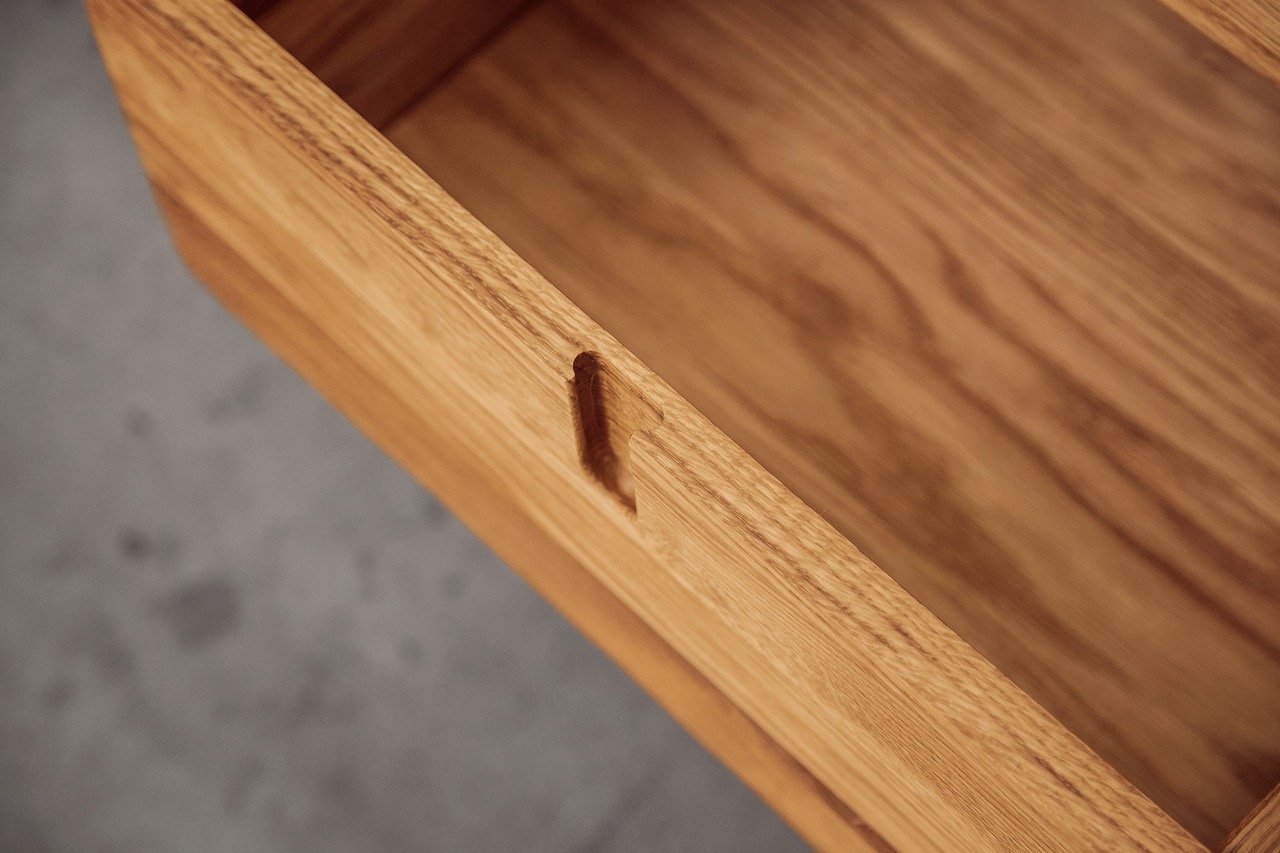 POLA forener massivt eik eller bøk med rene linjer og fresede grep som føles naturlige i hånden. To dører og to skuffer skaper orden med skandinavisk ro, mens de slanke benene gir møbelet en lett og luftig eleganse.
