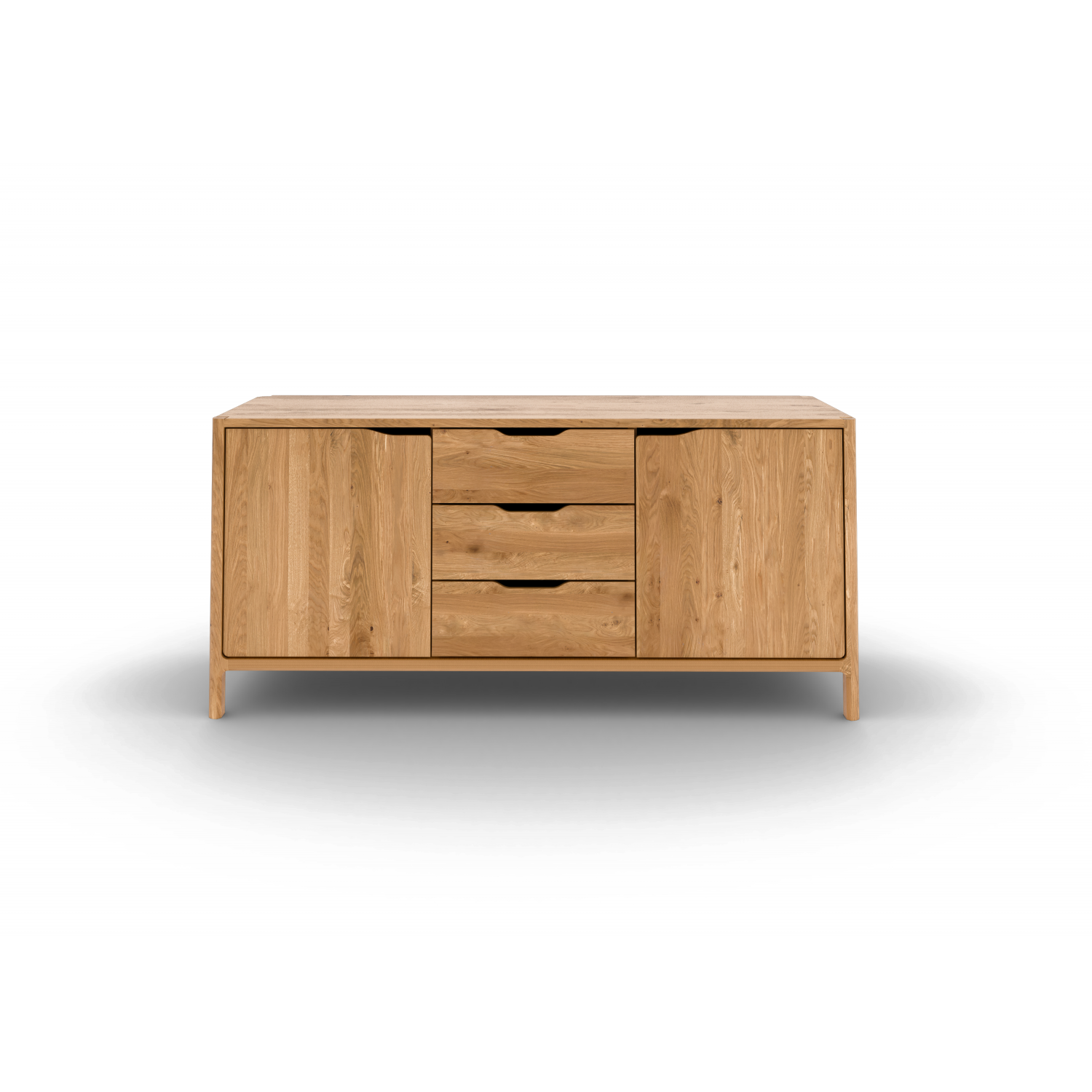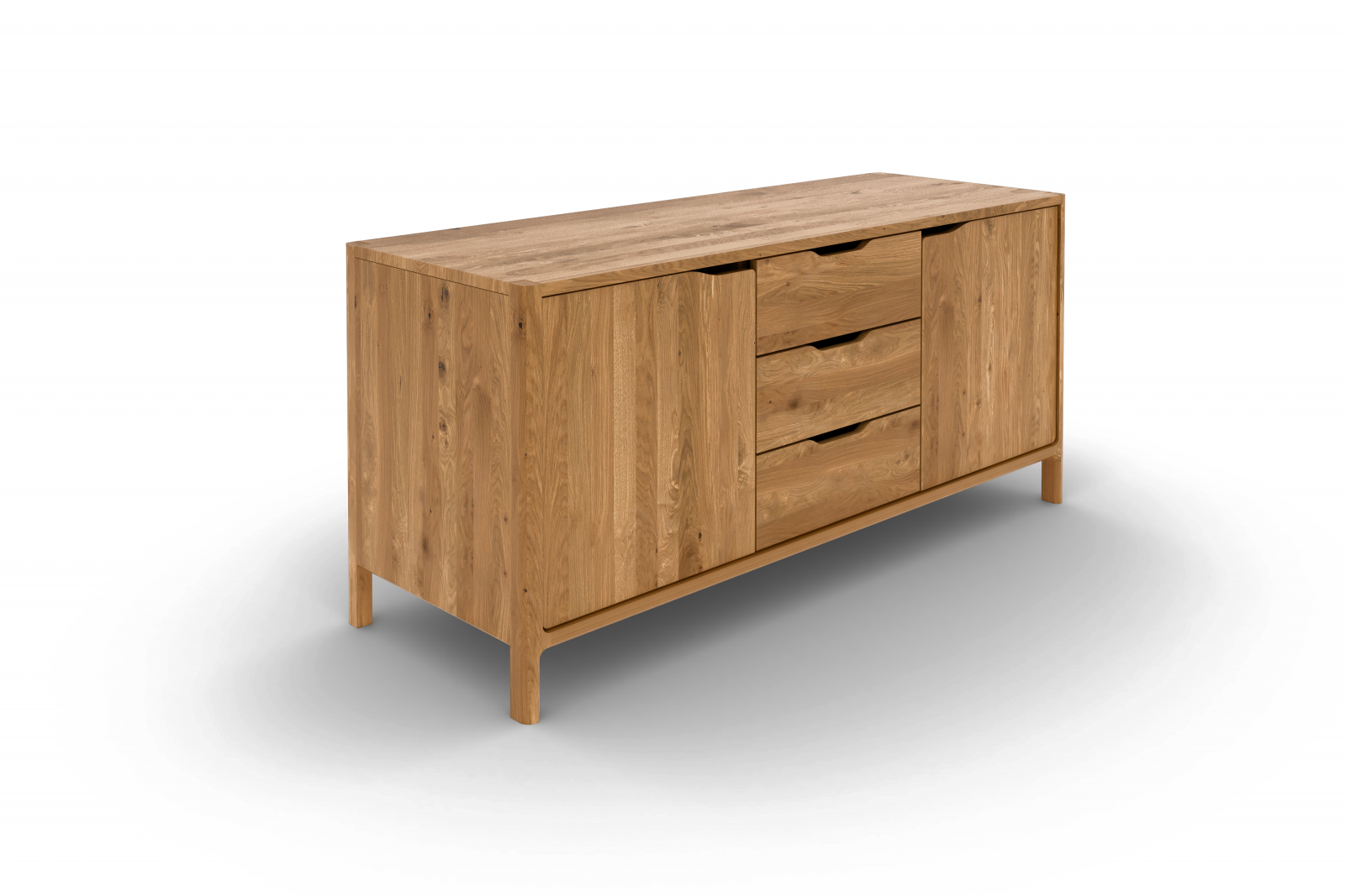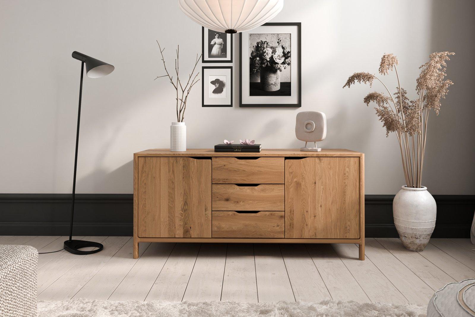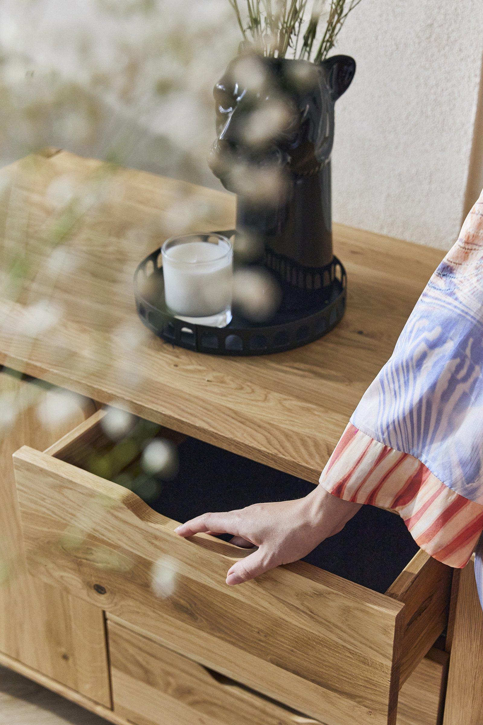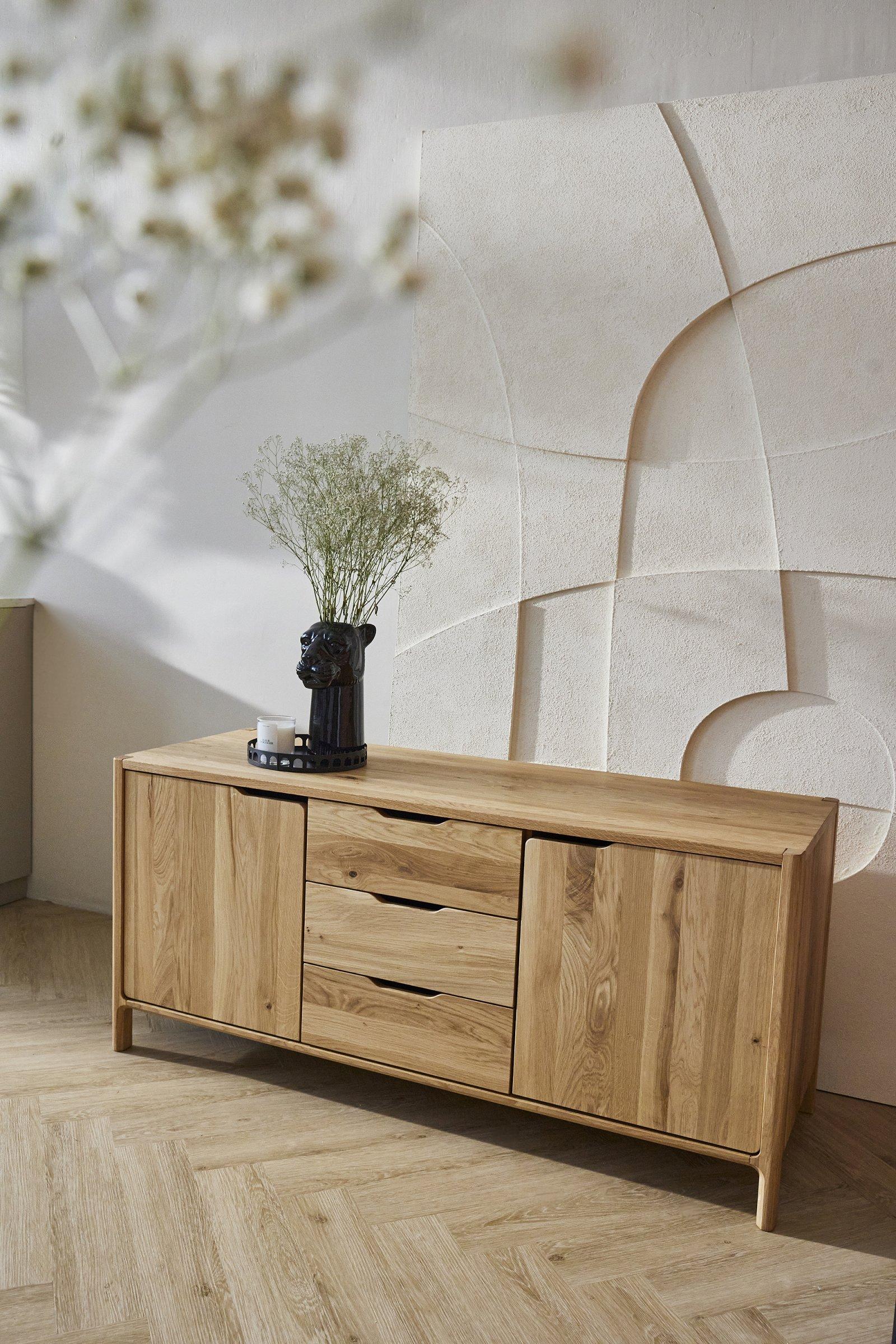 To dører og tre sentralt plasserte skuffer tilbyr masse oppbevaringsplass, mens formspråket er rolig og harmonisk. Laget i massivt, oliert tre hvor de synlige årene og den varme tonen i materialet gir en følelse av autentisitet.