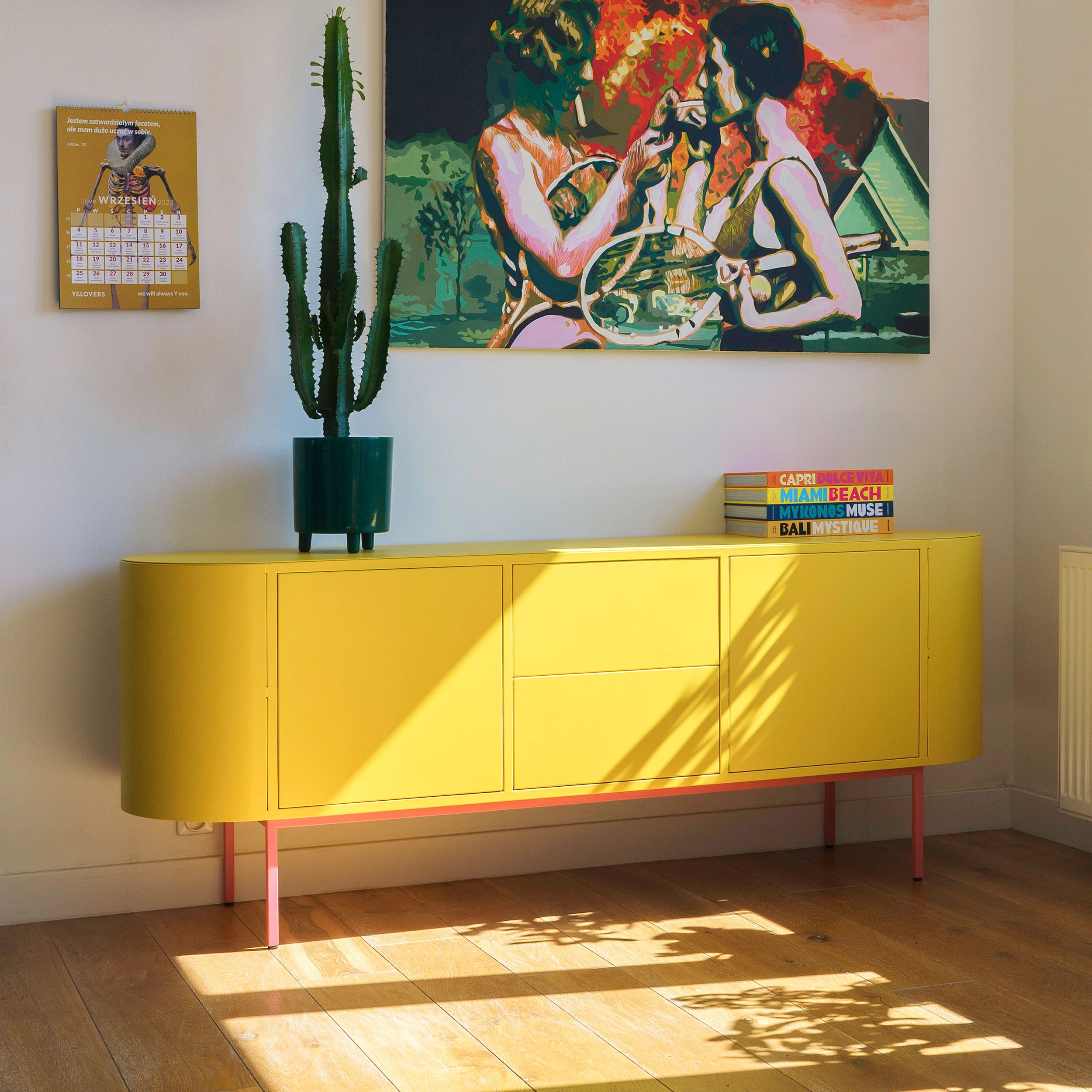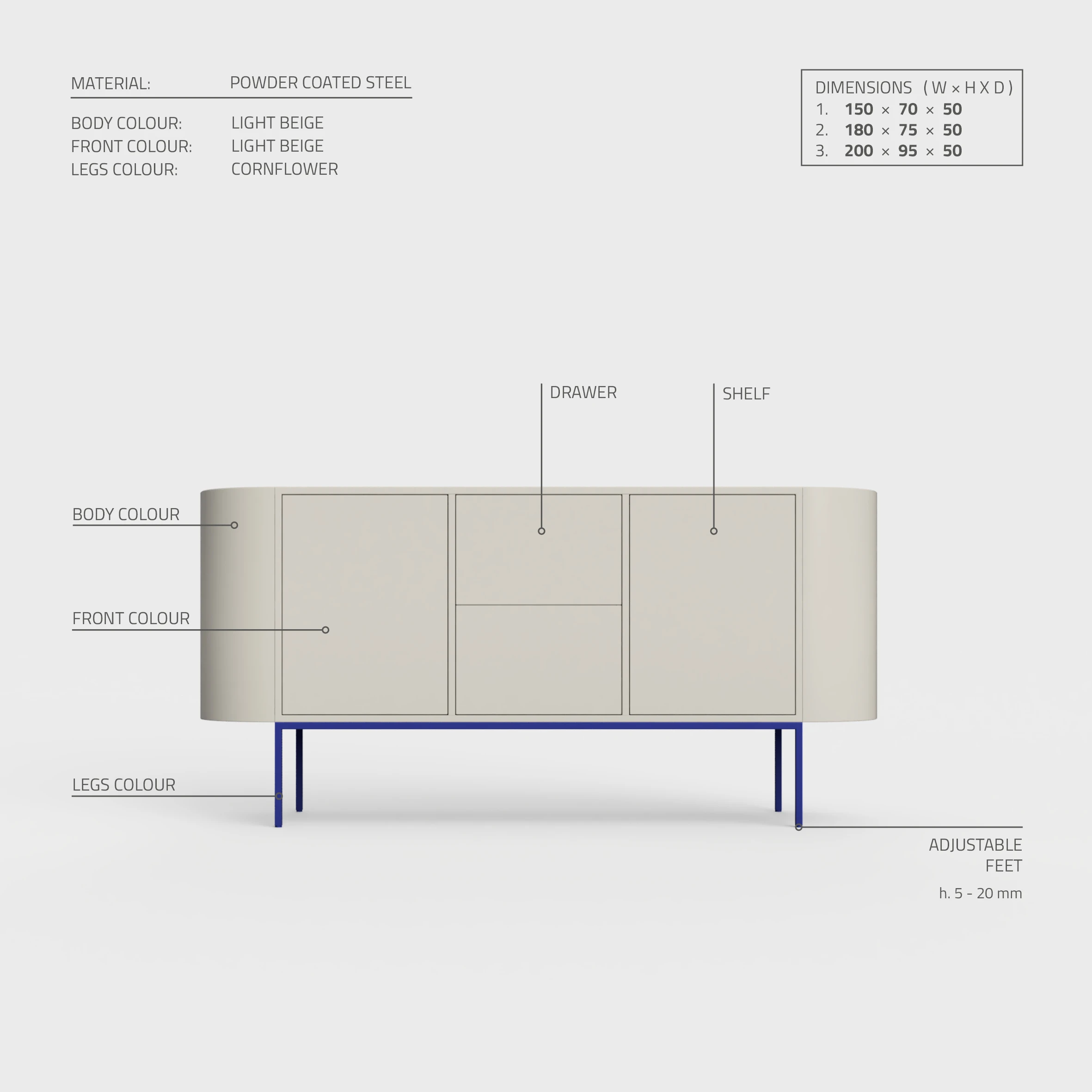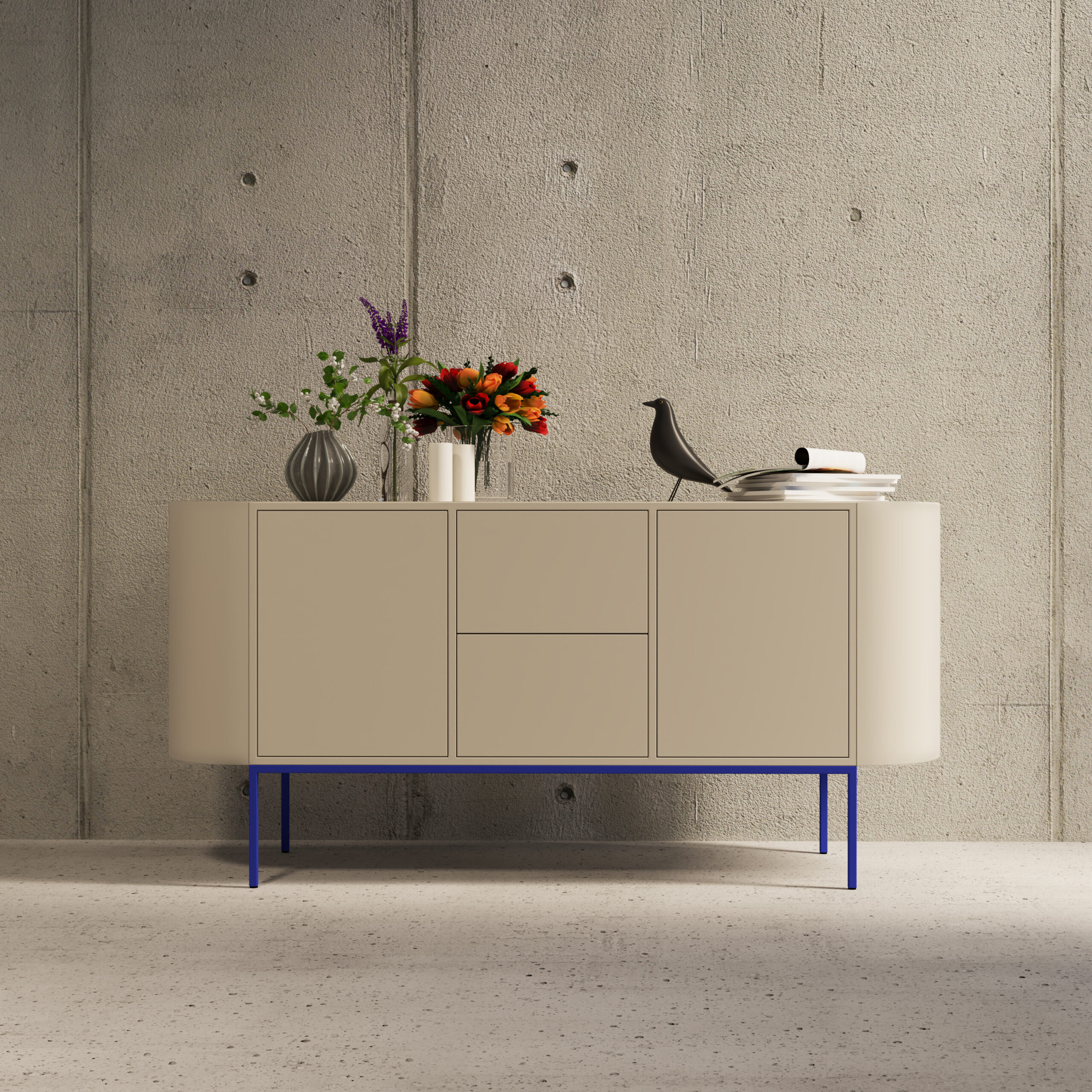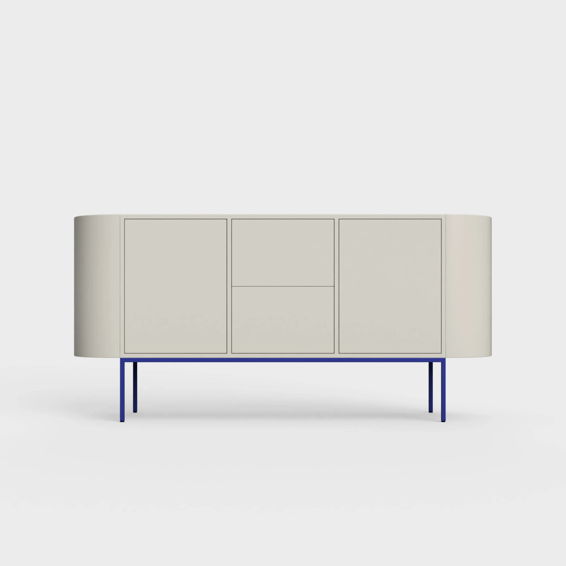 LUMIA 01 er en lett og moderne skjenk med myke kanter og et fint metallunderstel. Uten grep og med rene linjer gir den rommet et rolig og strømlinjet uttrykk – perfekt til både stue og spisestue.