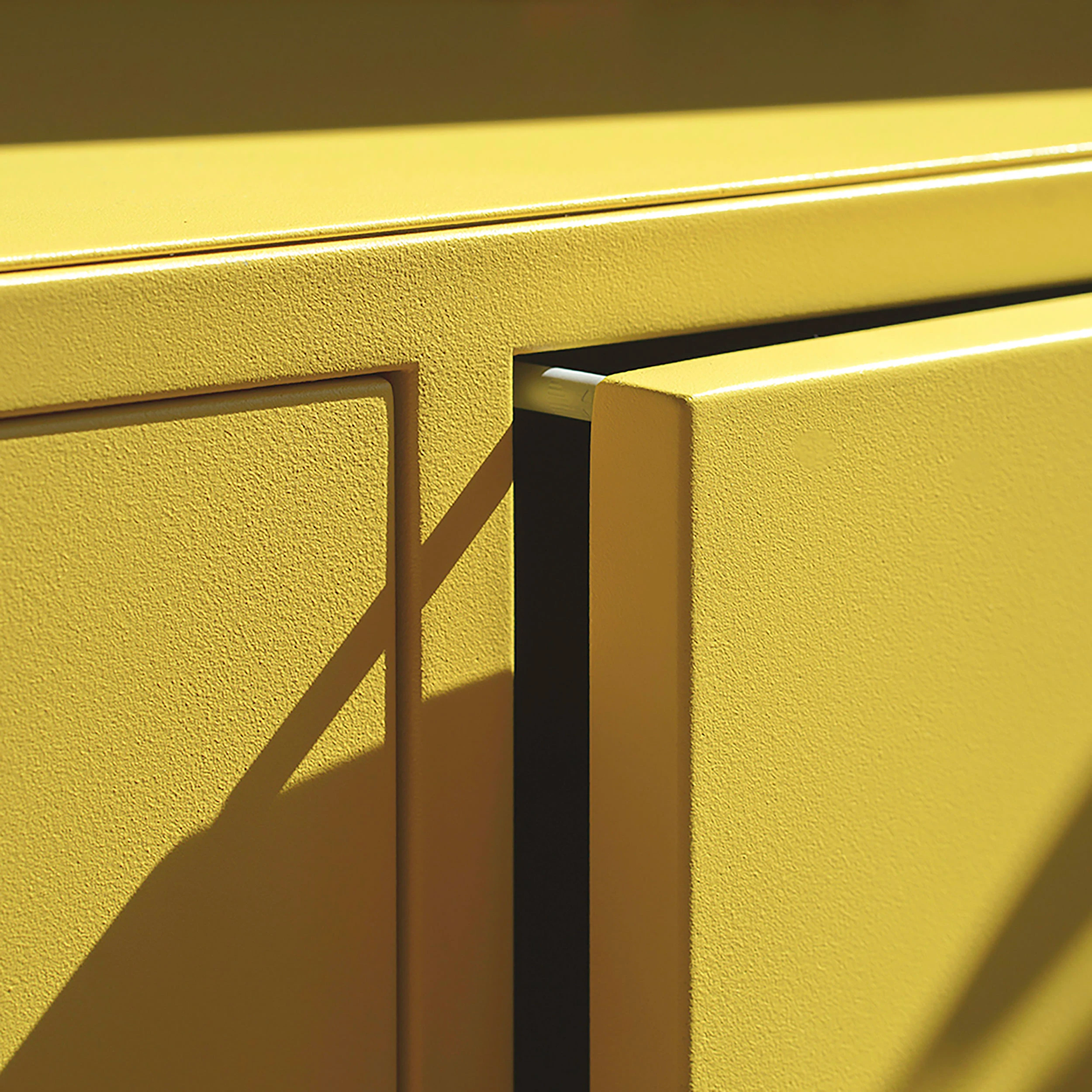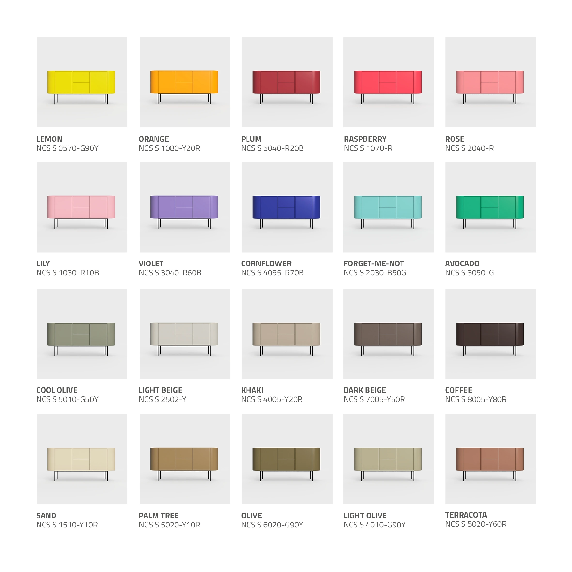 Hos DESIVA får du full frihet til å skape et møbel som passer din stil. Velg blant over 40 pulverlakkerte farger – slitesterk kvalitetslakk fra Hellas. Overflaten er matt, sterk og motstandsdyktig mot både fukt, sollys og fingermerker. Alle møbler er laget i heltrukket stål – ramme, fronter og topp – og herdes i ovn for et varig og behagelig uttrykk. Du kan også velge fargen på innsiden: 10 nyanser på de glatte, innvendige platene gjør at skapet føles riktig – hver gang du åpner det.