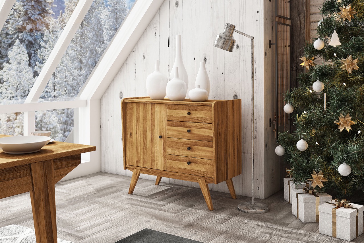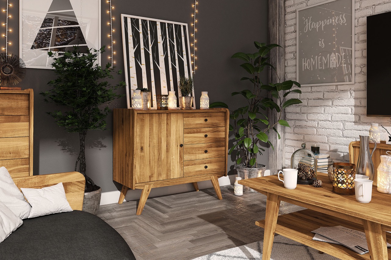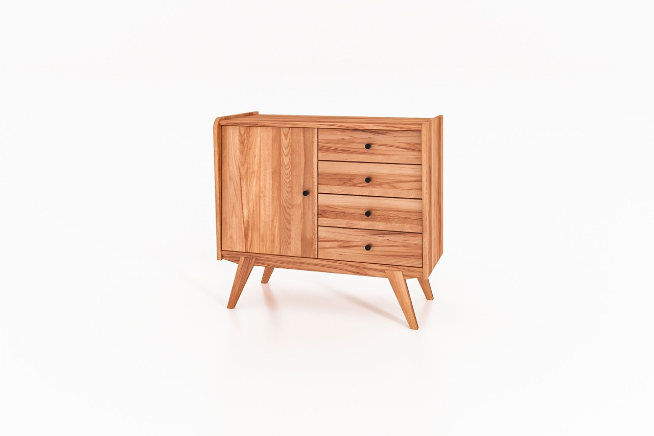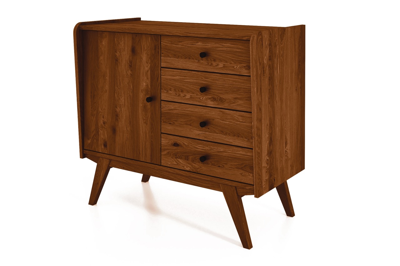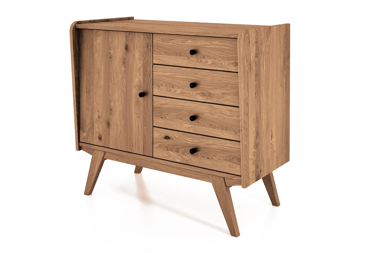 Denne skjenken fra RETRO-serien kombinerer asymmetri med balanse. Den ene døren og fire skuffene skaper en spennende oppdeling mellom oppbevaring og organisering, samtidig som formspråket forblir rolig og naturlig.