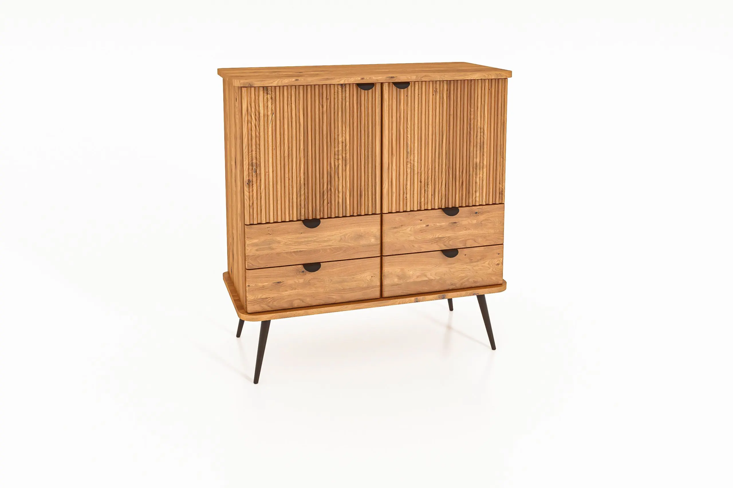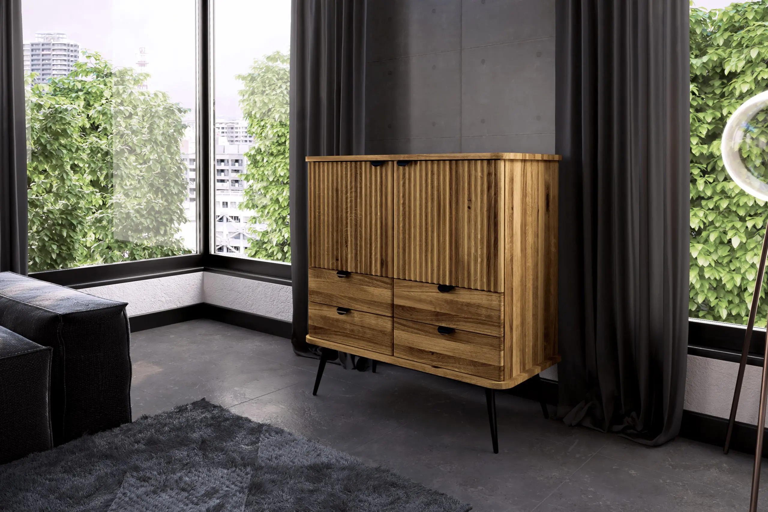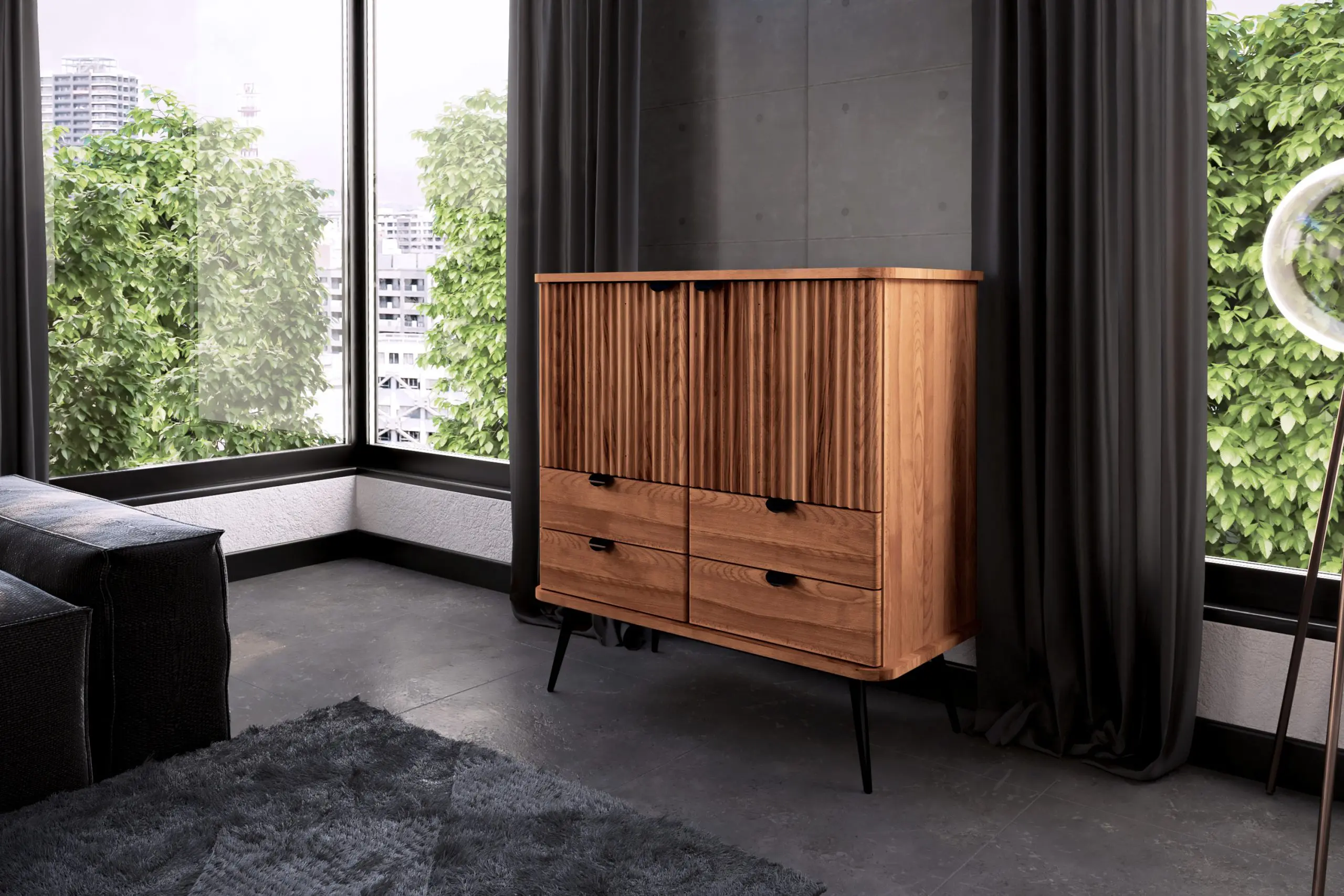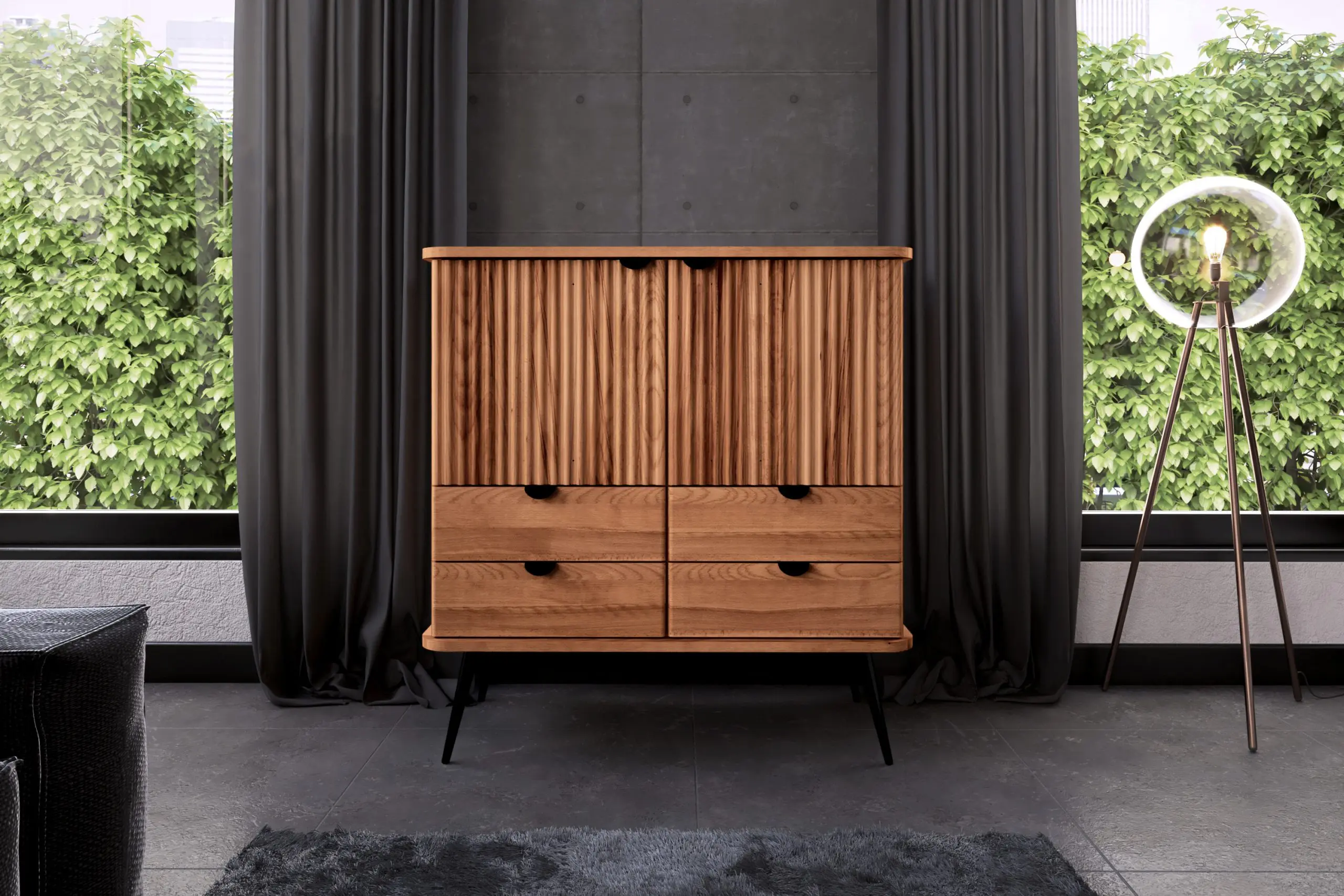 Denne romslige skjenken fra KULA-serien kombinerer visuell rytme med praktisk oppbevaring. Øverst to dører med riflede fronter, nederst fire skuffer med sorte grep – samlet i en harmonisk helhet som balanserer funksjon og estetikk.