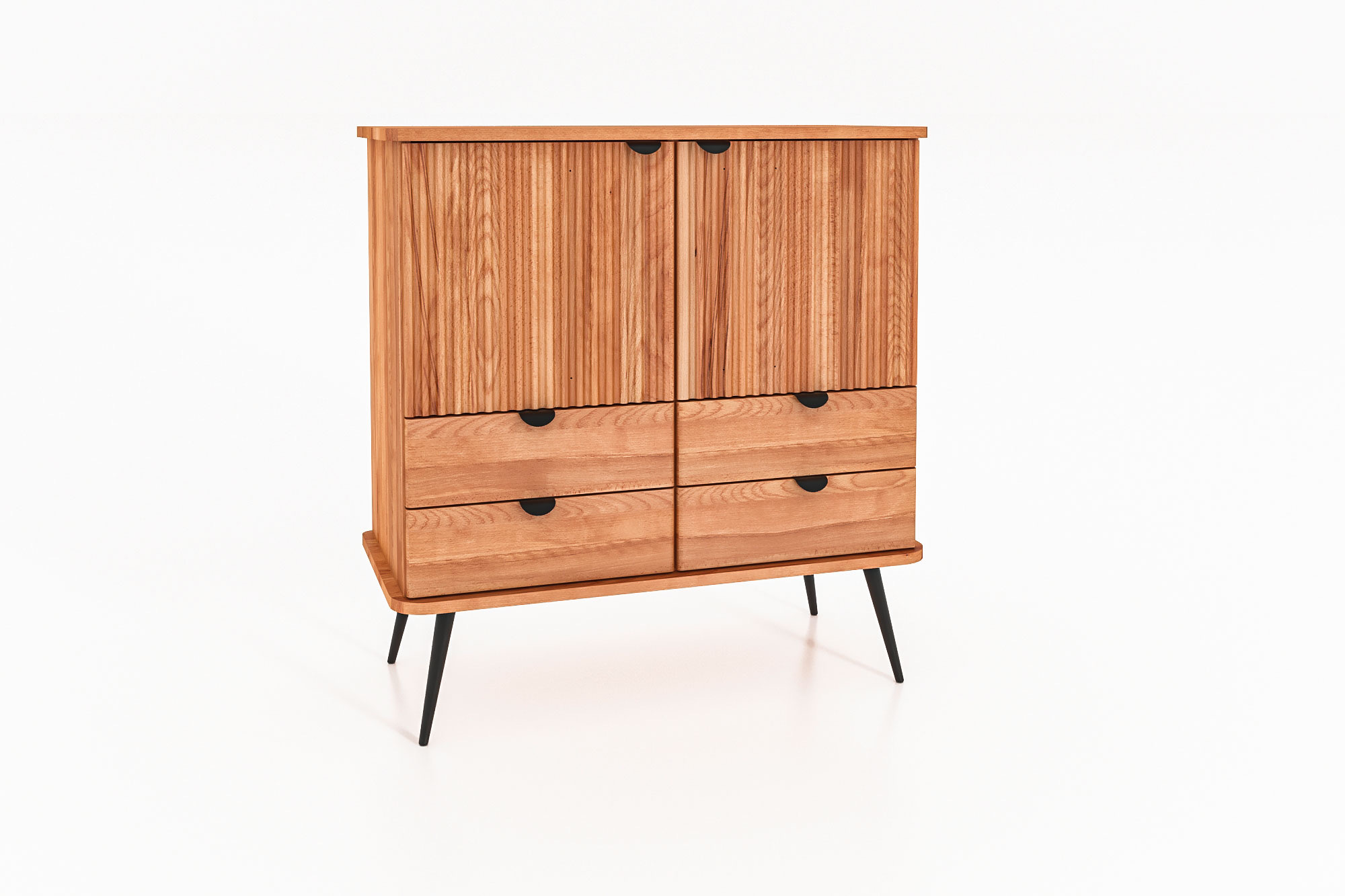 Møbelet er laget i massivt eik eller bøk og leveres i flere oljede varianter som fremhever treets naturlige karakter og varme. De slanke sorte metallbenene gir letthet og løfter møbelet fra gulvet, noe som gjør uttrykket både tidløst og moderne.