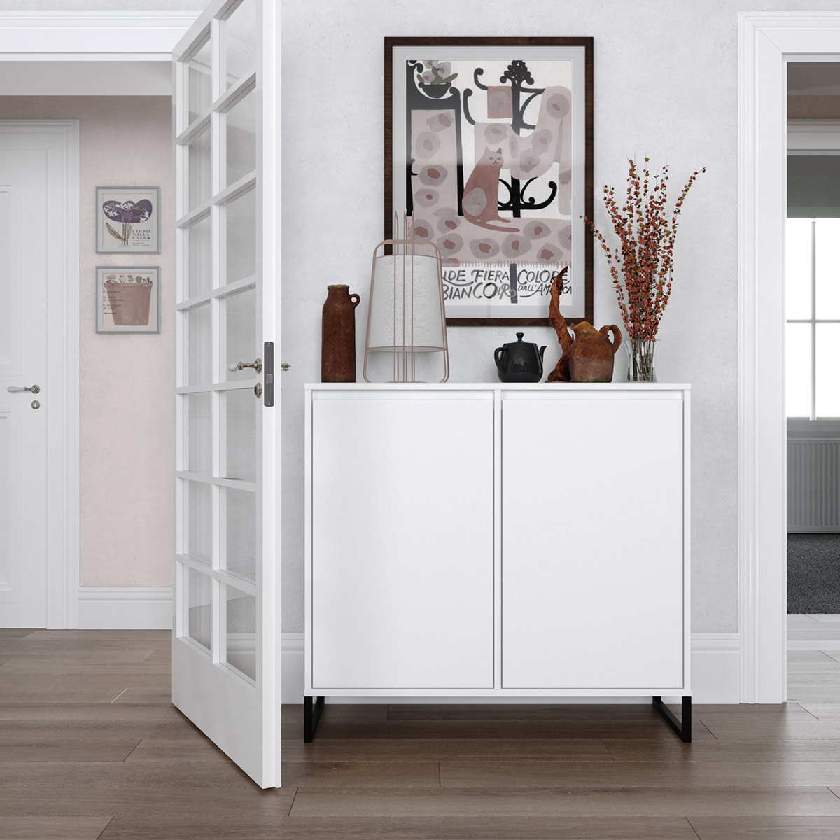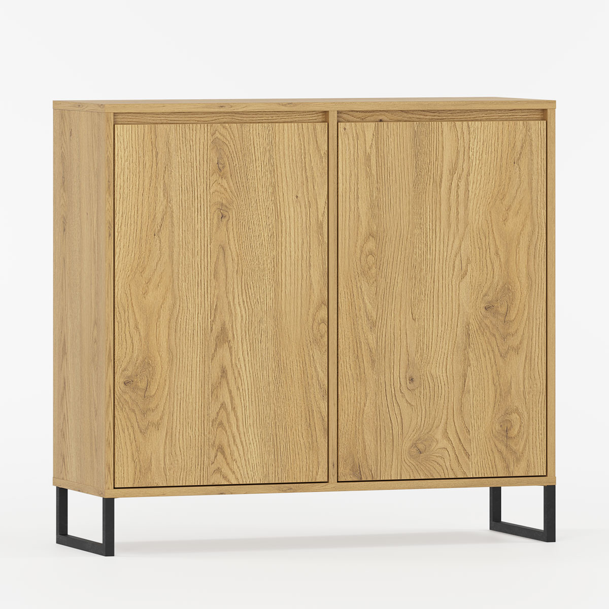 Bak de rene frontene finner du to store rom med flyttbare hyller som gir fleksibel oppbevaring. Den brede topplaten gir plass til dekor eller personlige ting, og møbelet fungerer både som oppbevaringsløsning og et naturlig blikkfang i rommet.