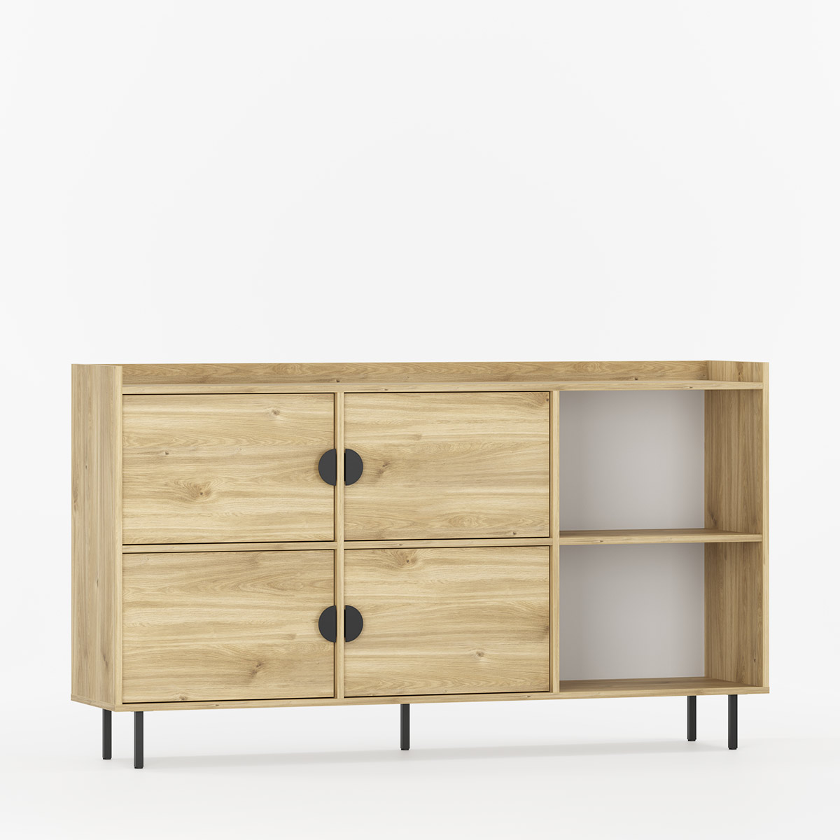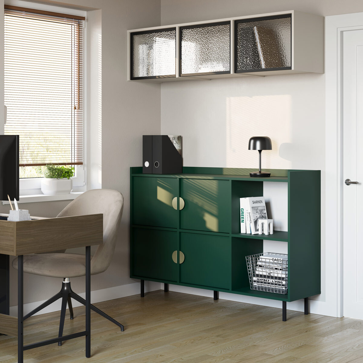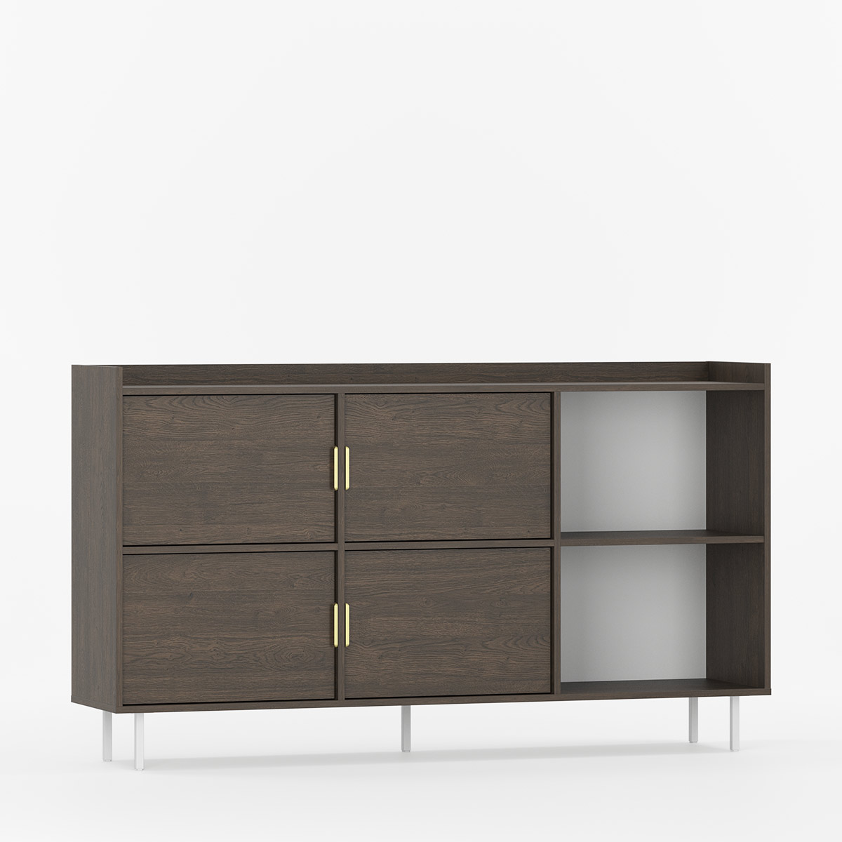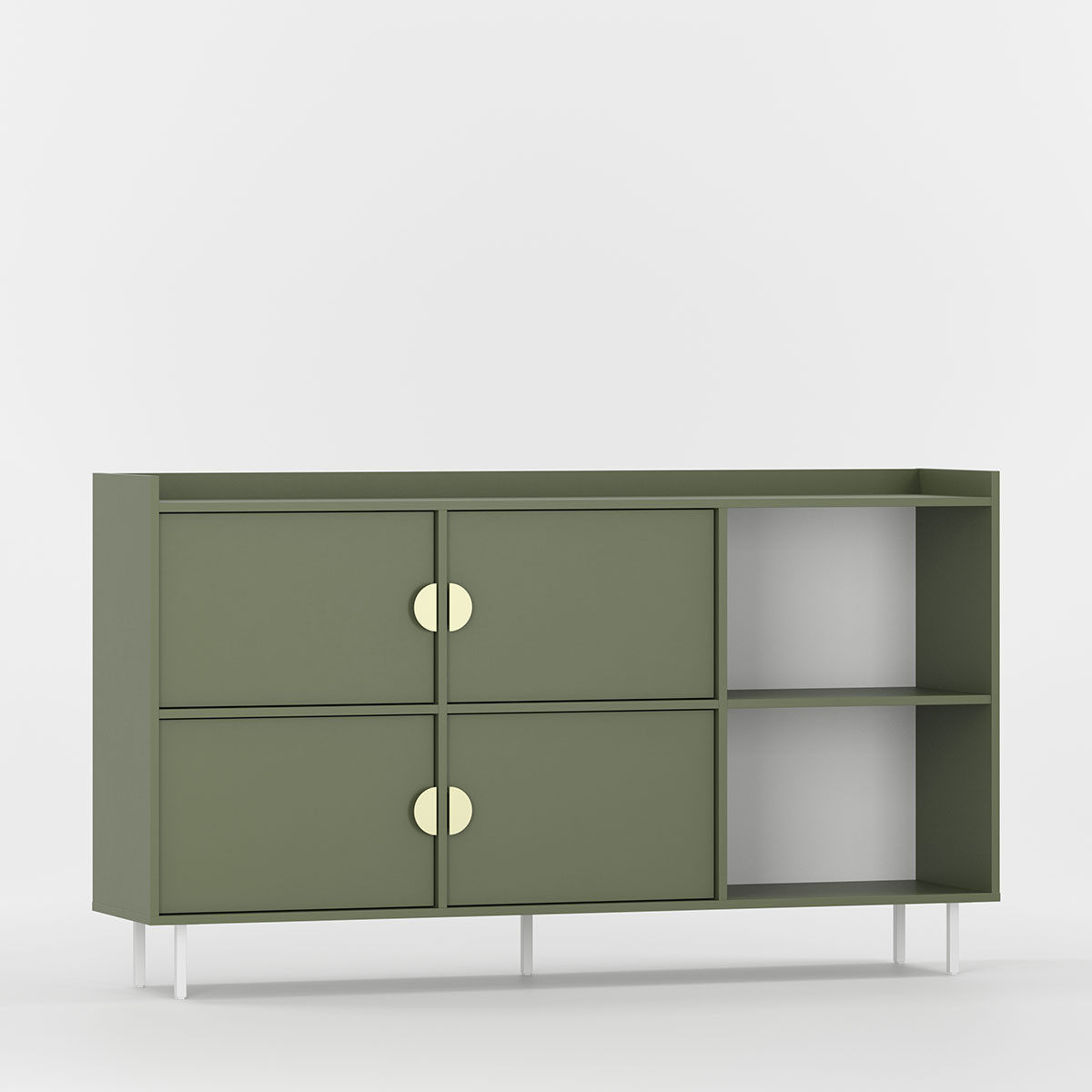 SIGI SRPRO2 er et større oppbevaringsmøbel skapt til rom med behov for systematisk orden og fleksibel inndeling. Halvåpen 3-seksjons konstruksjon kombinerer åpne hyller og lukkede rom bak dører.