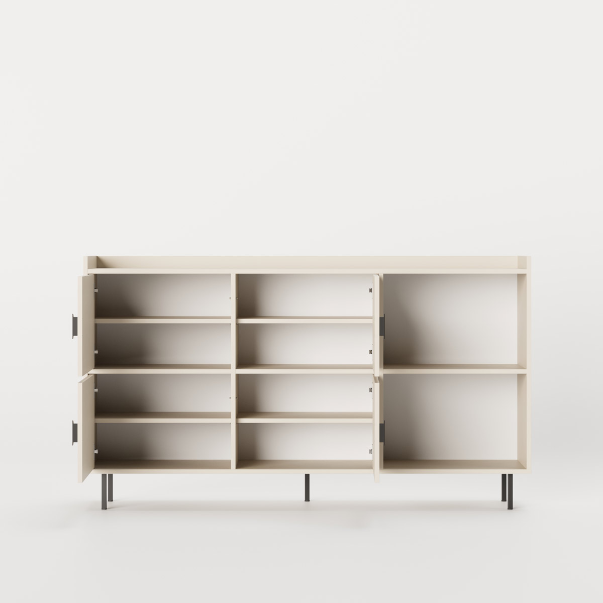 Tolv flyttbare hyller totalt gir tilpasset oppbevaring for alt fra servise til dokumenter. De karakteristiske frontene er trukket diskret tilbake. Fem solide ben løfter møbelet elegant fra gulvet.