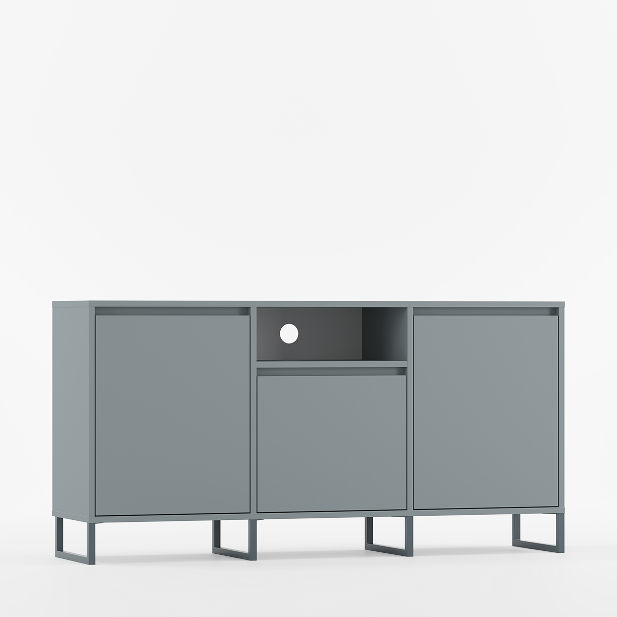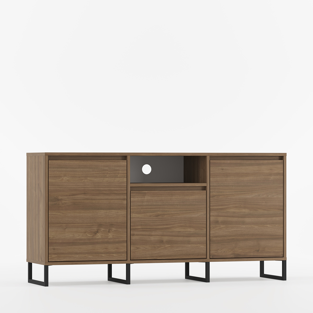 BJORN BTV3K kombinerer skandinavisk enkelhet med industrielt design i et romslig møbel skapt for større stuer og tv-rom. Tre seksjoner med to store sideskap og et midterste skap med justerbare hyller gir optimal organisering, mens en åpen hylle under bordplaten skaper fleksibel bruk.