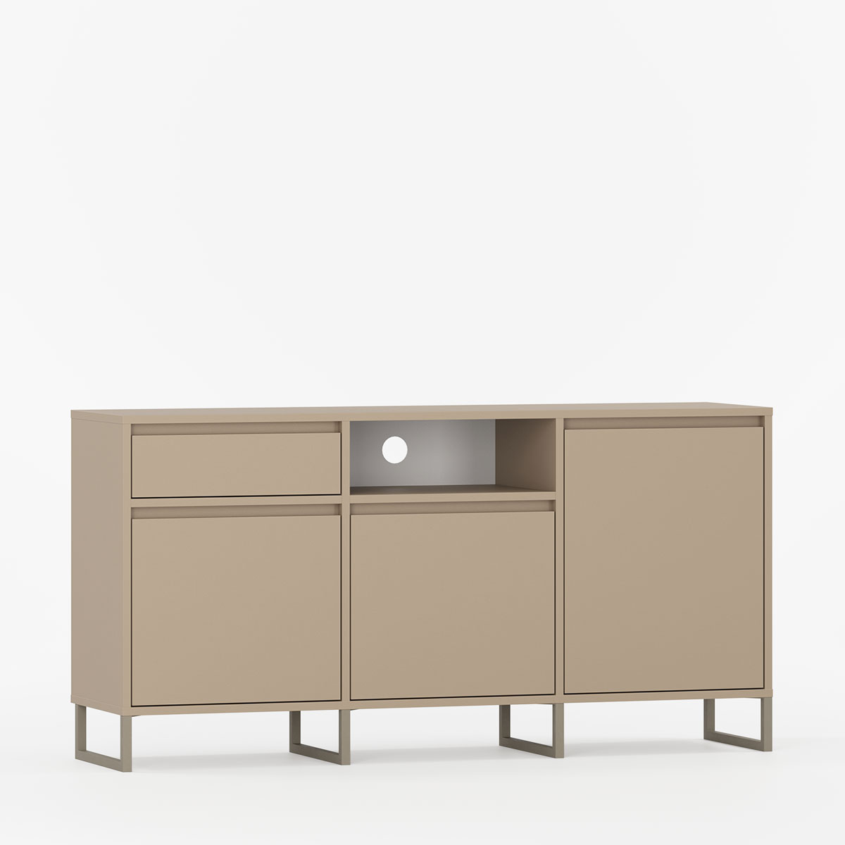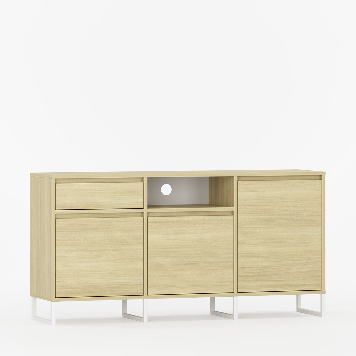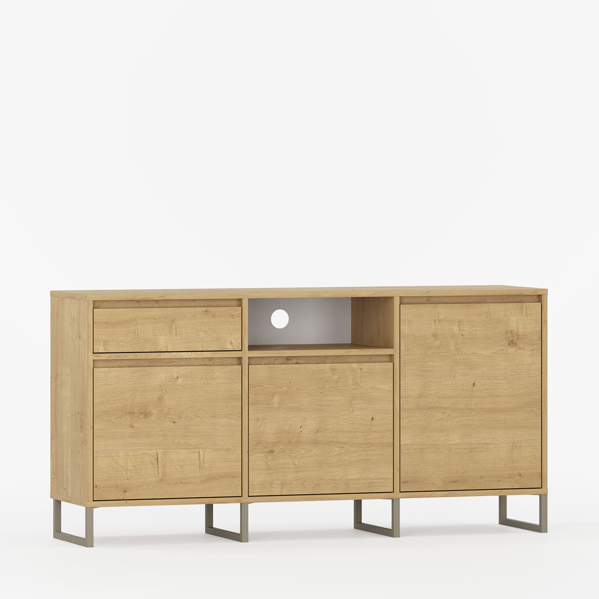 BJORN BTV3S kombinerer skandinavisk estetikk med industriell stil i et interessant møbel skapt for stuer, soverom og tv-rom. Tre komplementære seksjoner – skuff med sidehengslet skap, åpen hylle med klassisk åpnende skap, og fullt lukket rom med sidehengslet dør – gir optimal organisering.