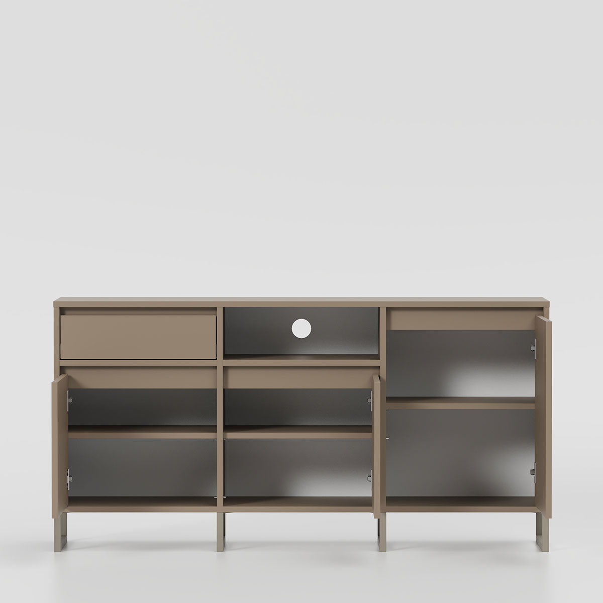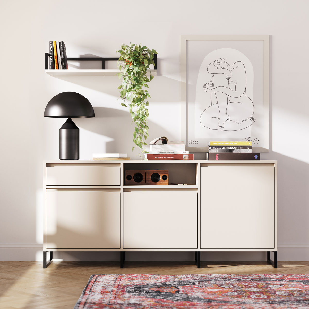Bordplaten gir romslig plass til musikk-utstyr eller dekorasjoner. Kombinasjonen av skuffer, åpne hyller og lukkede skap skaper fleksibel oppbevaring og ryddig uttrykk. Subtile innsnitt erstatter synlige håndtak og gir ren, moderne estetikk.
