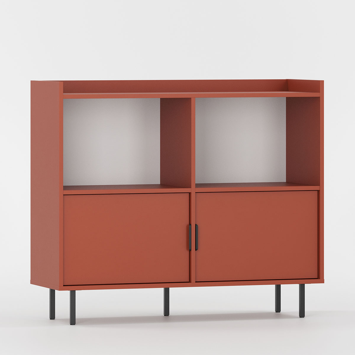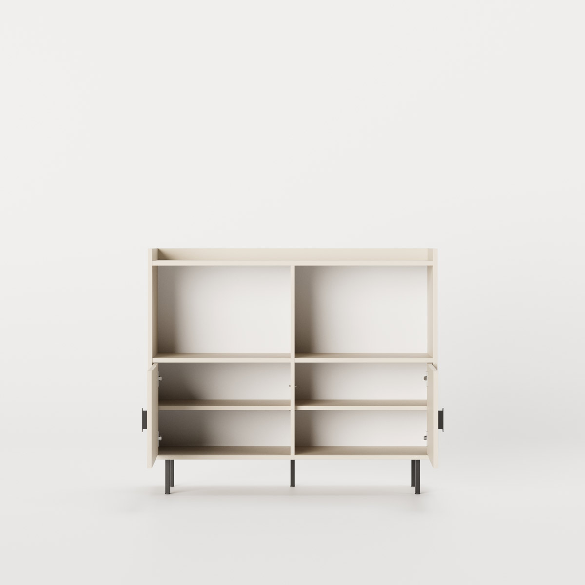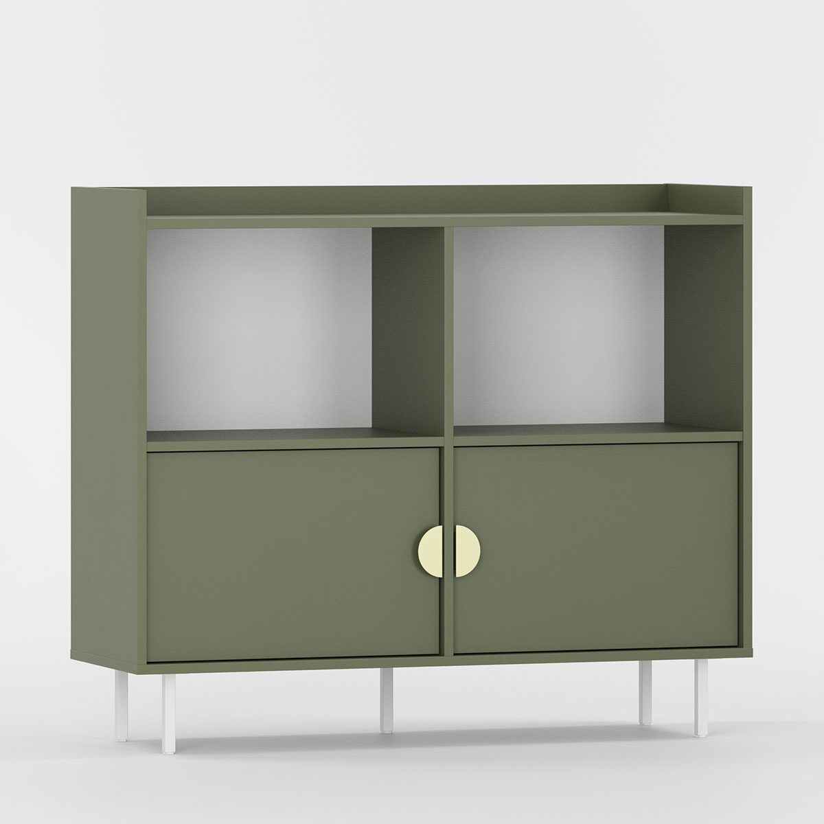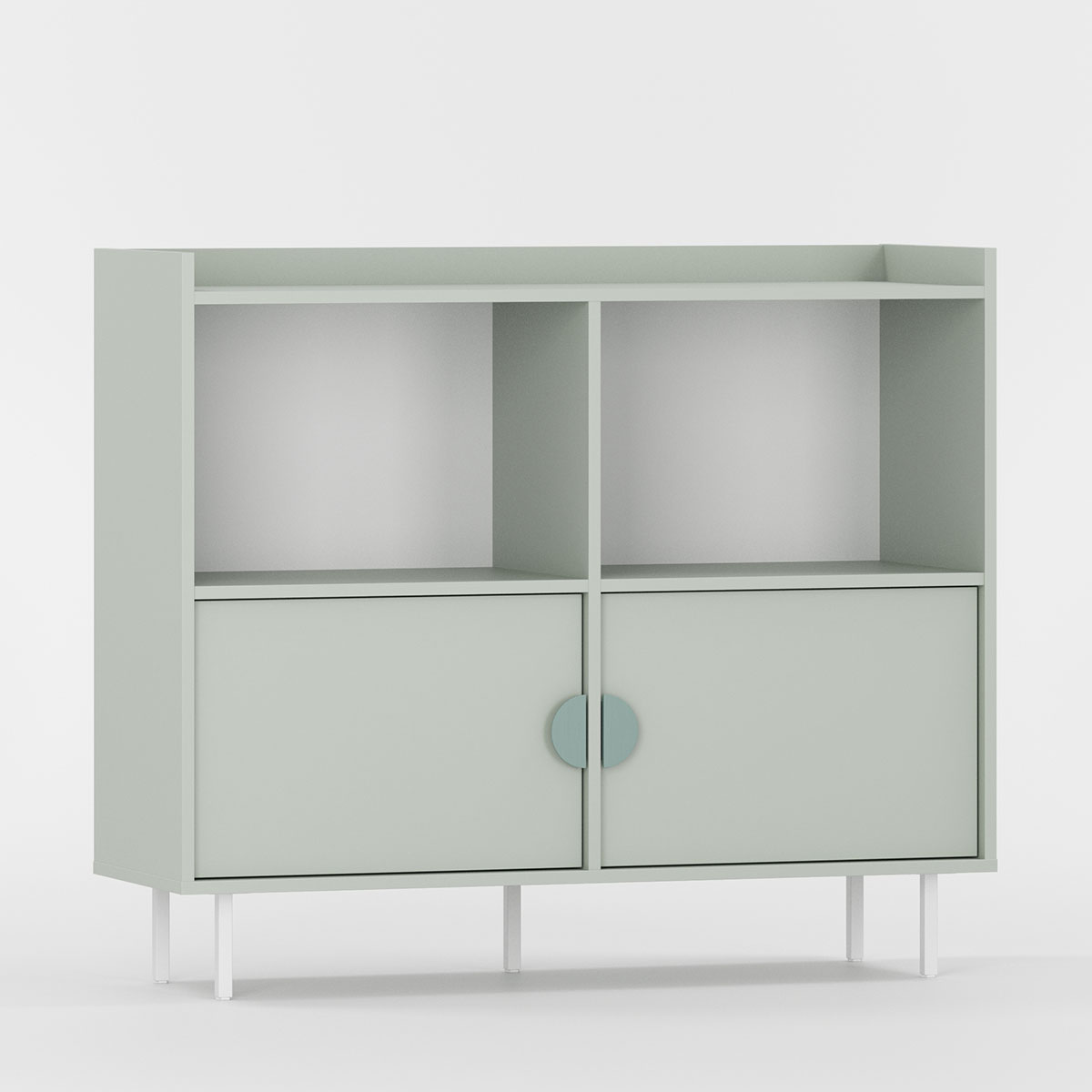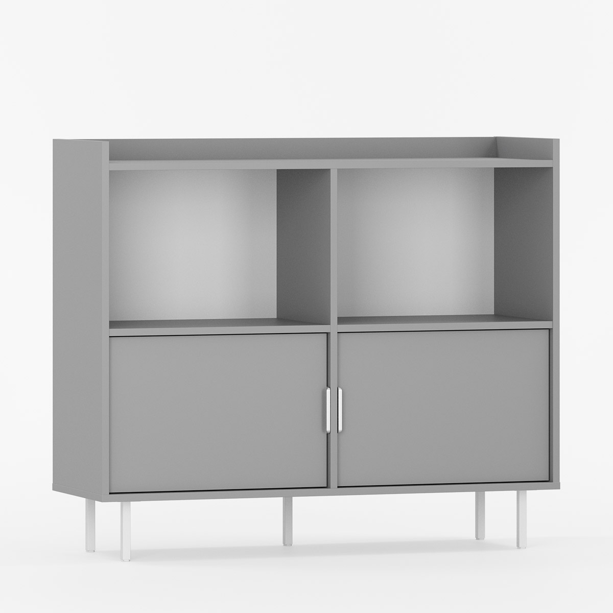 To identiske rom har hver sin faste hylle og én flyttbar hylle for tilpasset organisering. De karakteristiske frontene er trukket diskret tilbake. Fem ben løfter møbelet for enkel rengjøring.