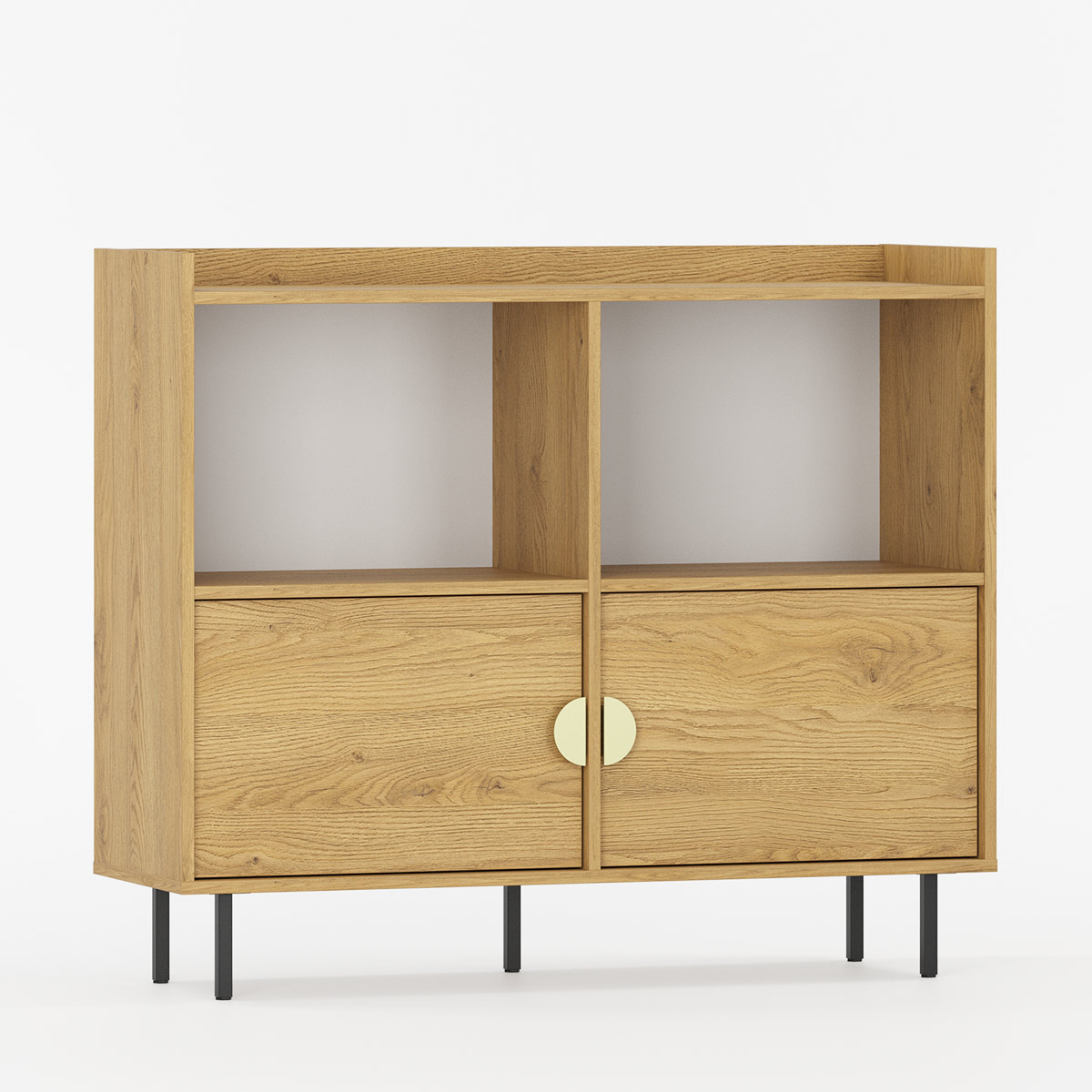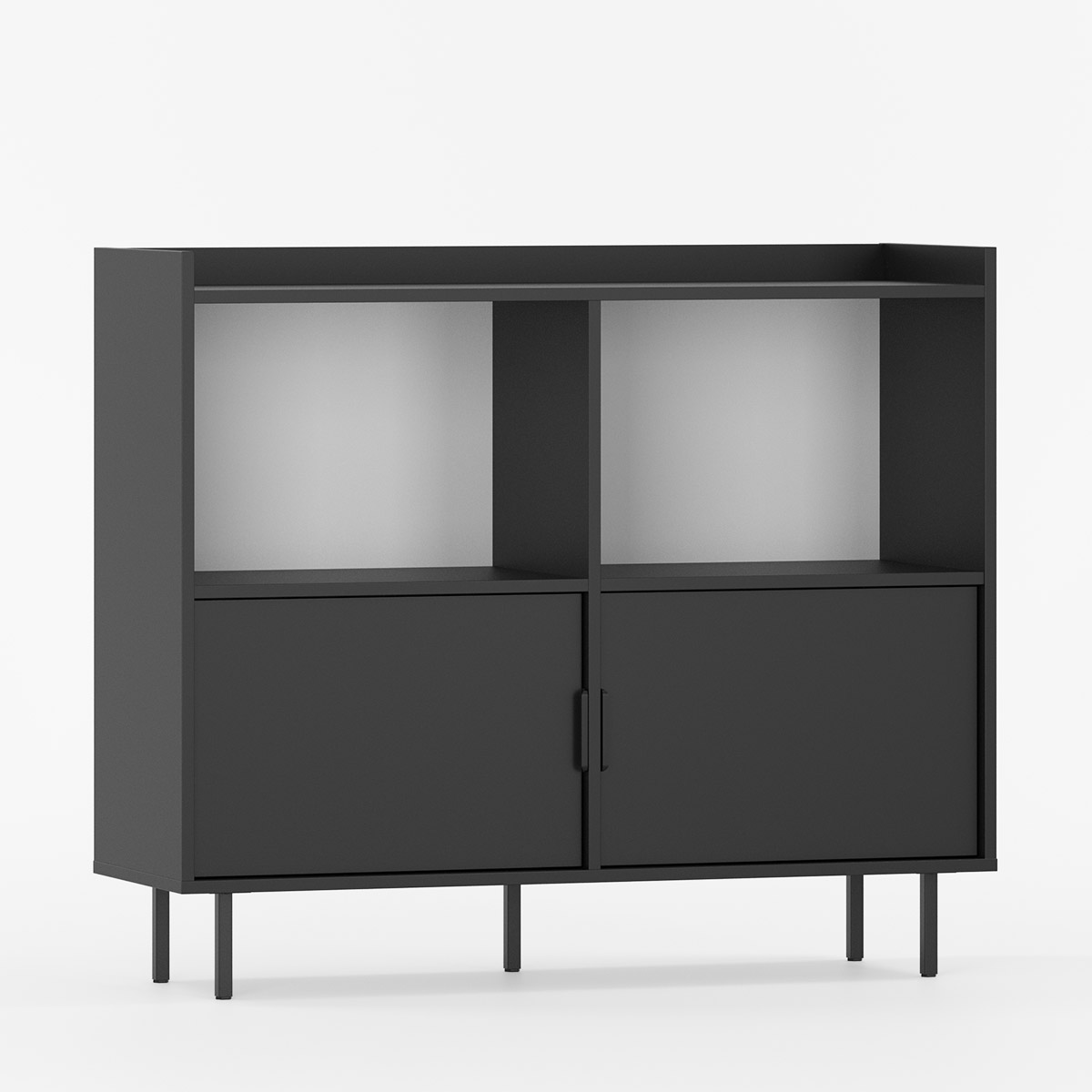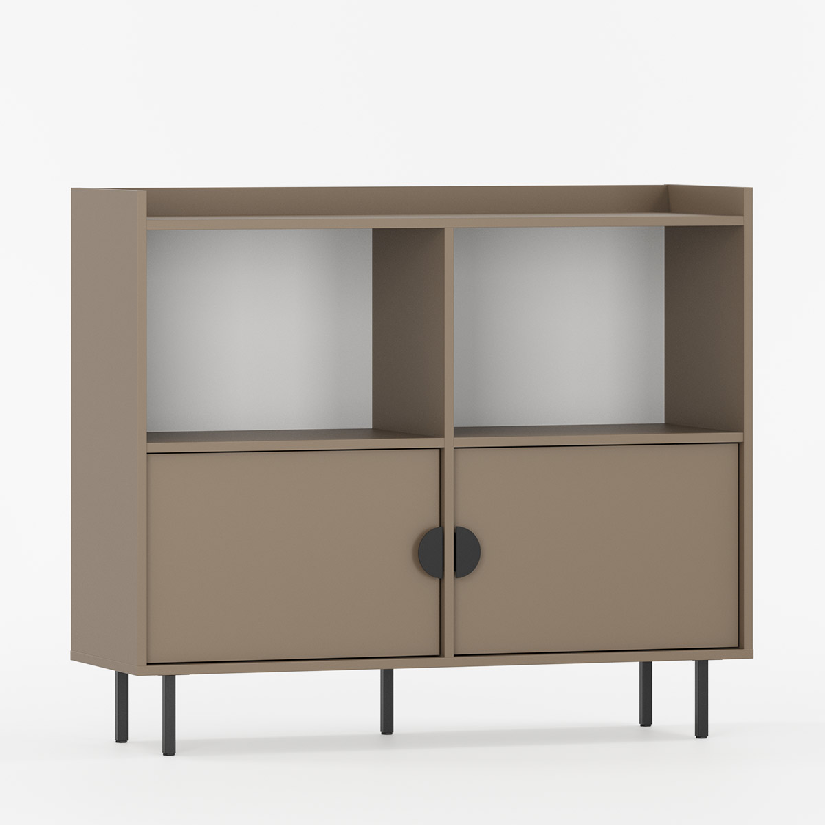 SIGI SRPRO1 er et allsidig og kompakt møbel med symmetrisk 2-seksjons design. Kombinerer åpne hyller og lukkede rom bak sidehengte dører for fleksibel oppbevaring.