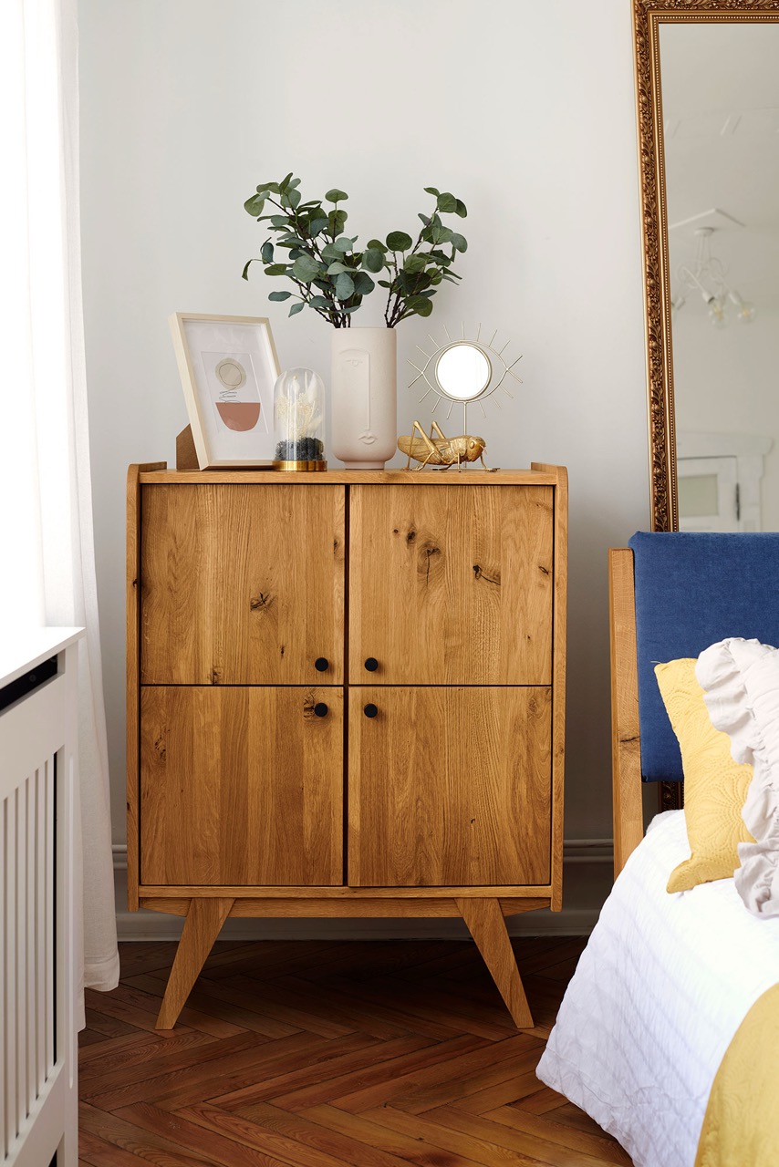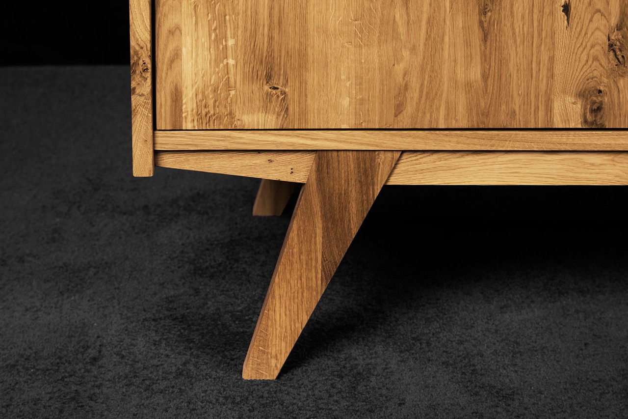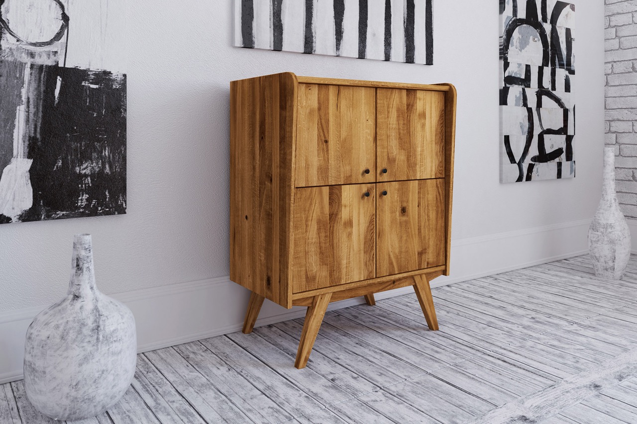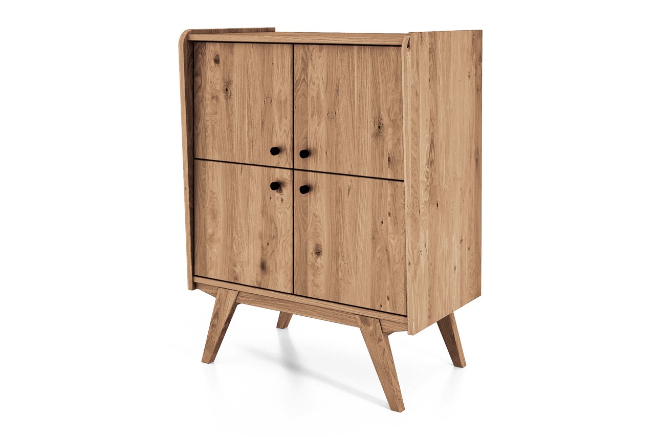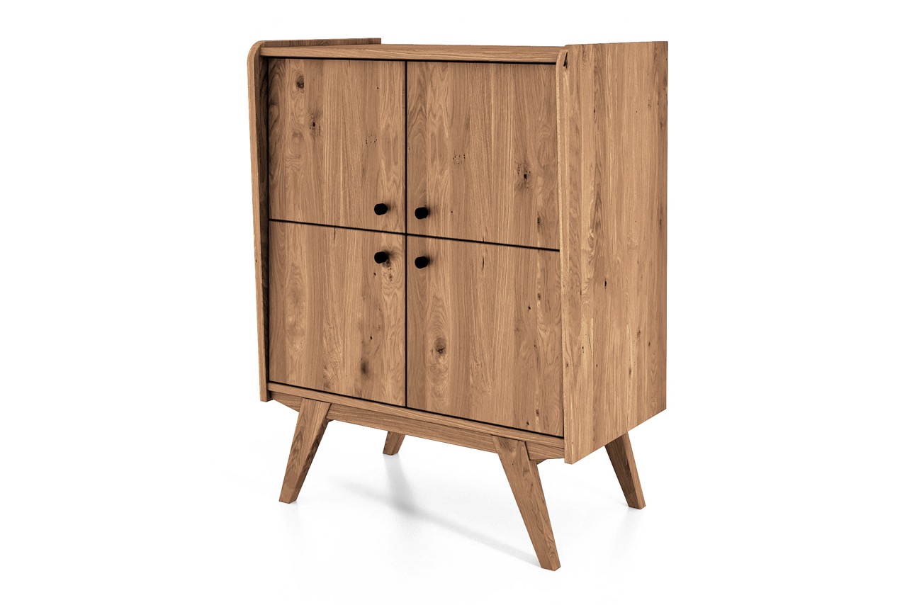 Denne særlige skjenken fra RETRO-serien forener klassisk symmetri med moderne funksjonalitet. De fire dørene skaper en ren og balansert front, mens det massive, oljede treet og de skråstilte benene tilfører varme og letthet.