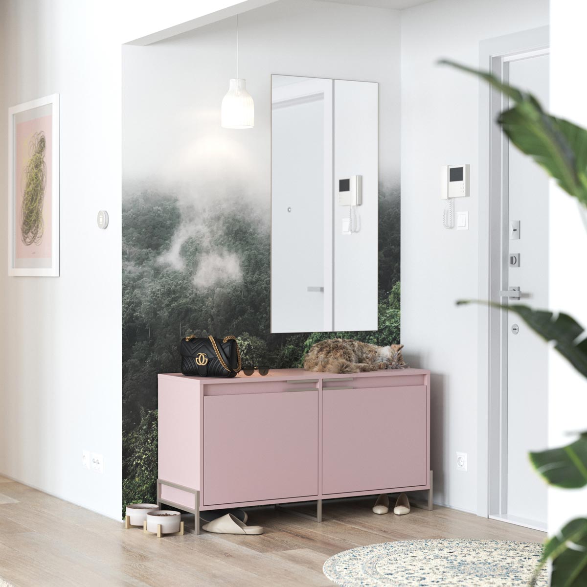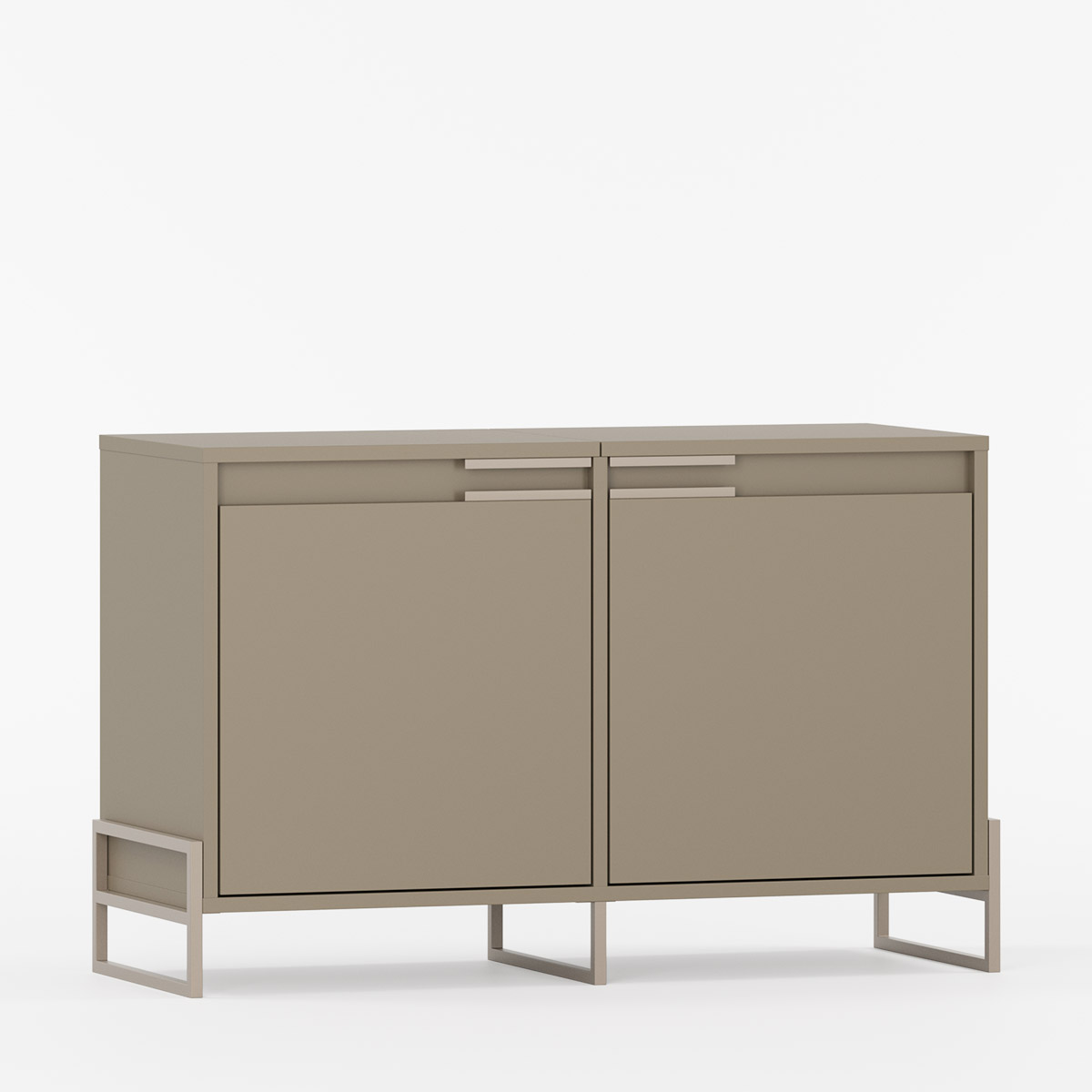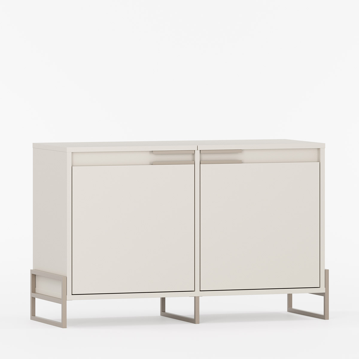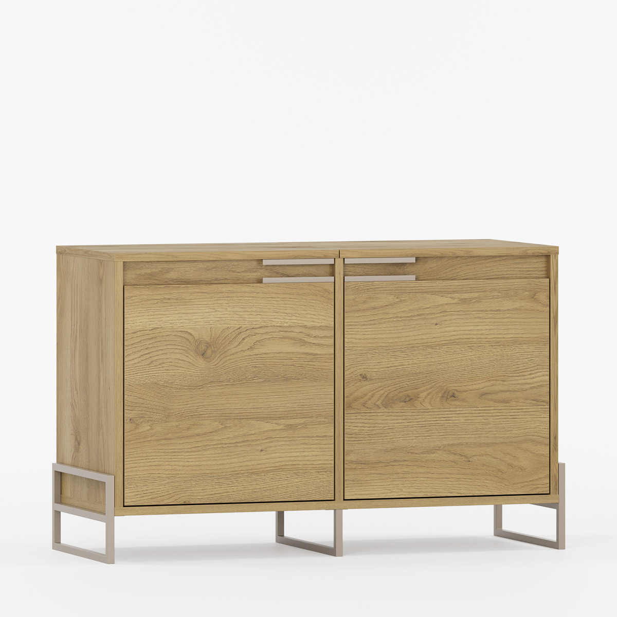 Topplaten består av to dører som skjuler oppbevaringsrom til småting som skopleie eller tilbehør. Under finner du to seksjoner for sko eller andre eiendeler, hver med justerbare hyller for fleksibel bruk. De karakteristiske håndtakene gir en helhetlig finish, mens metallprofilene som erstatter benene gir både stabilitet og et moderne uttrykk. Modellen kan bestilles i ønsket bredde og farge, slik at den passer sømløst inn sammen med andre møbler i INEA-serien.