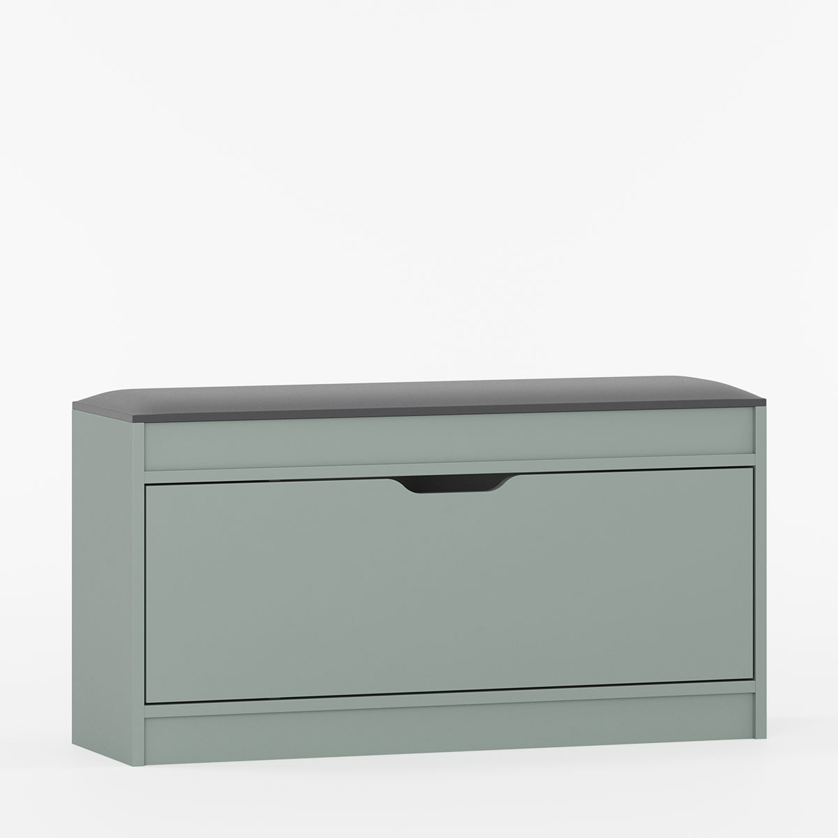 Bak døren skjuler det seg et rom med justerbar hylle, perfekt for å organisere sko og tilbehør. Det utfreste grepet fungerer både som håndtak og ventilasjon, og bidrar til å holde fottøyet tørt og friskt. Sokkelkonstruksjonen gir benken et rent preg uten synlige ben, samtidig som den står stødig på gulvet.