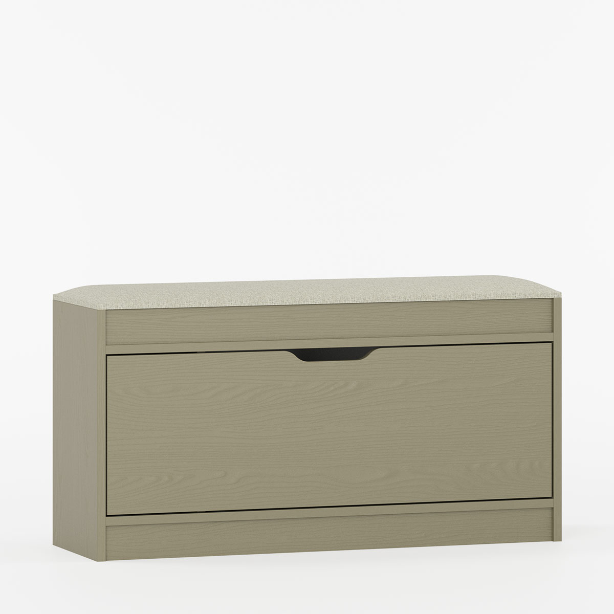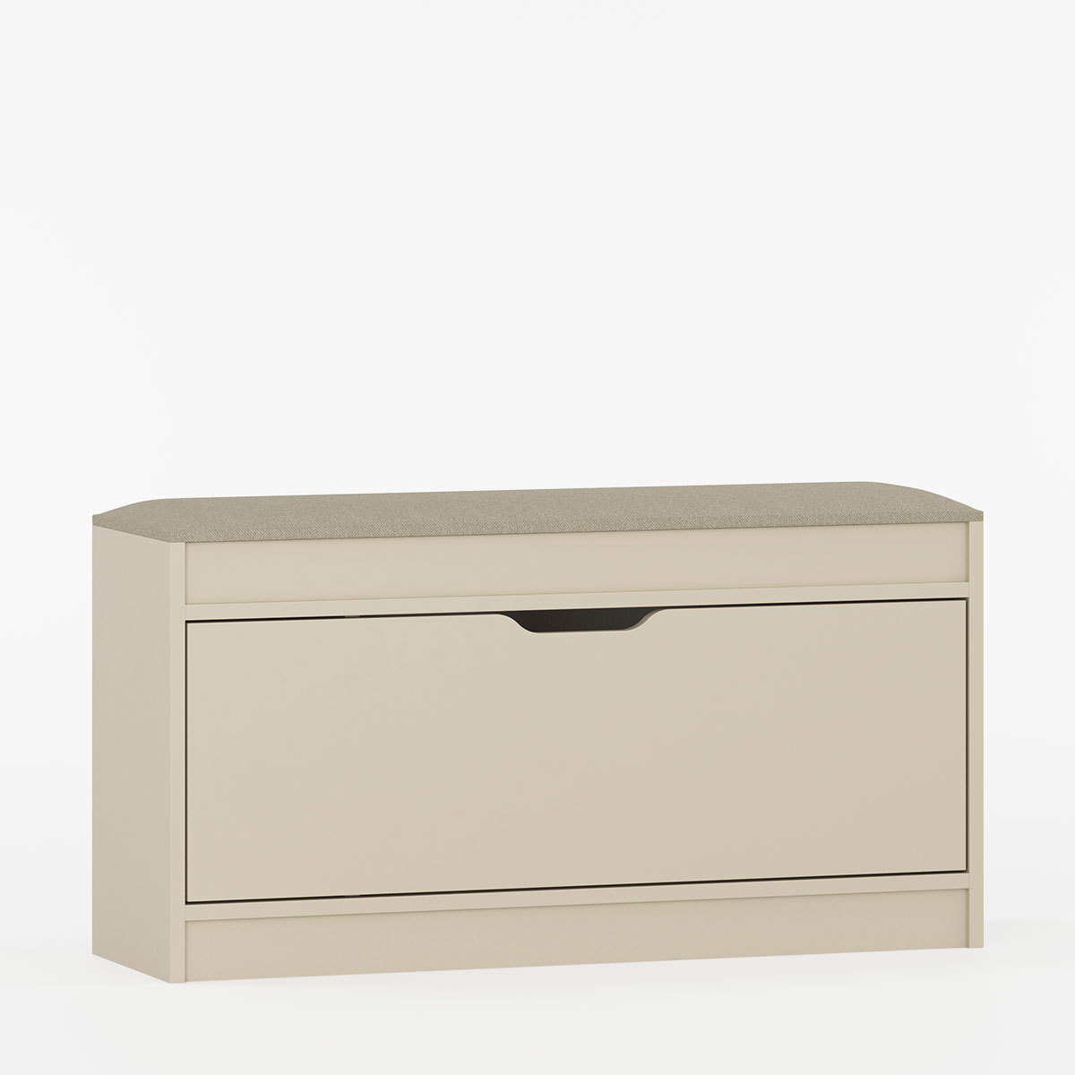 FINNES SBH1 er en gulvstående skobenk som kombinerer sitteplass og skjult oppbevaring i et rolig, minimalistisk uttrykk. Den polstrede puten kan tilpasses i ulike stoffer og farger, og gir et behagelig sete når du tar av eller på skoene.