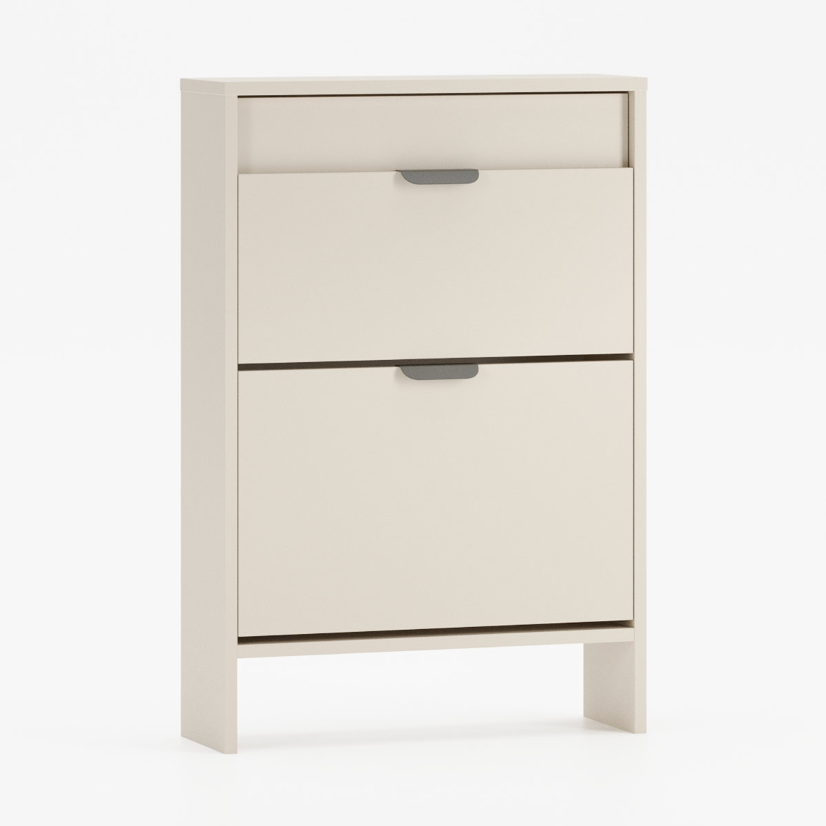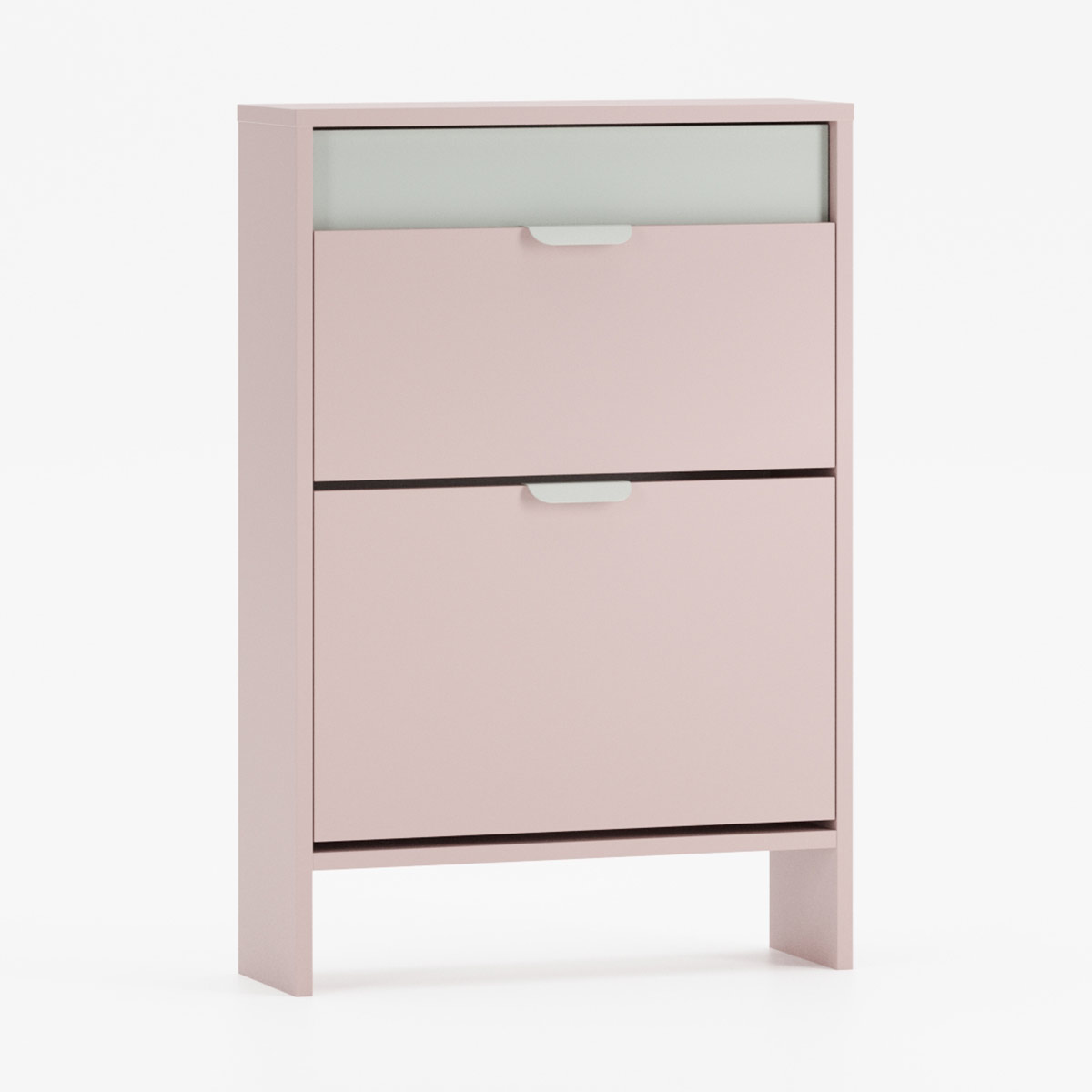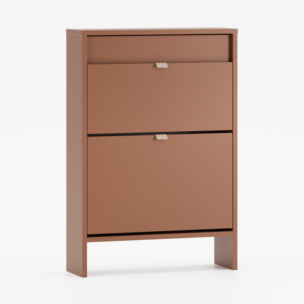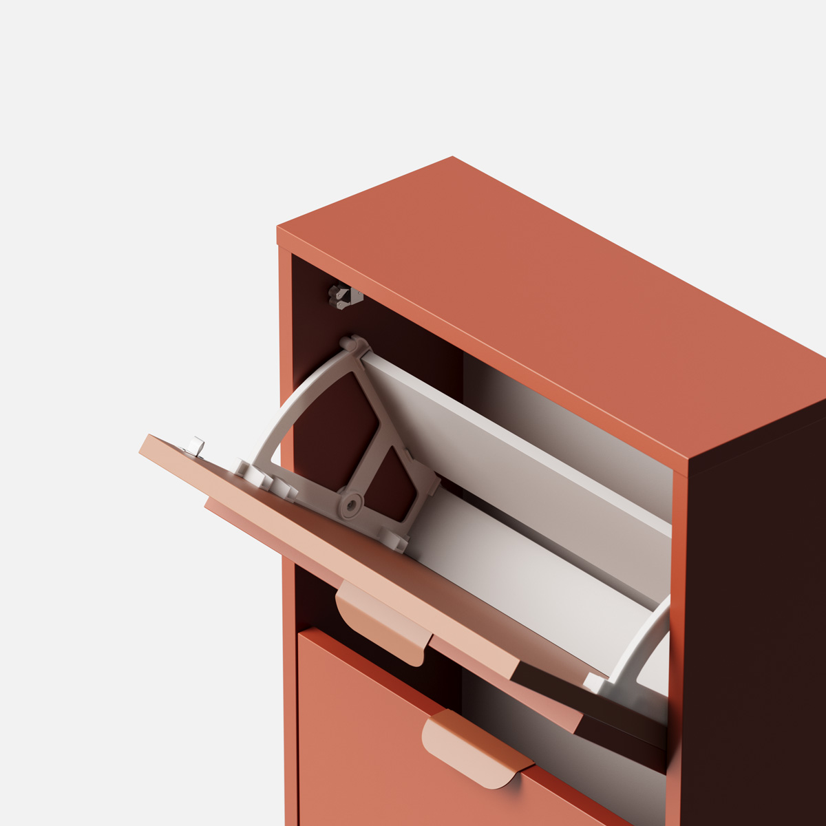 - To rum over hinanden med klaplåger. Hvert rum har plads til en række sko. Den øverste klaplåge har to farver, og begge har pæne håndtag