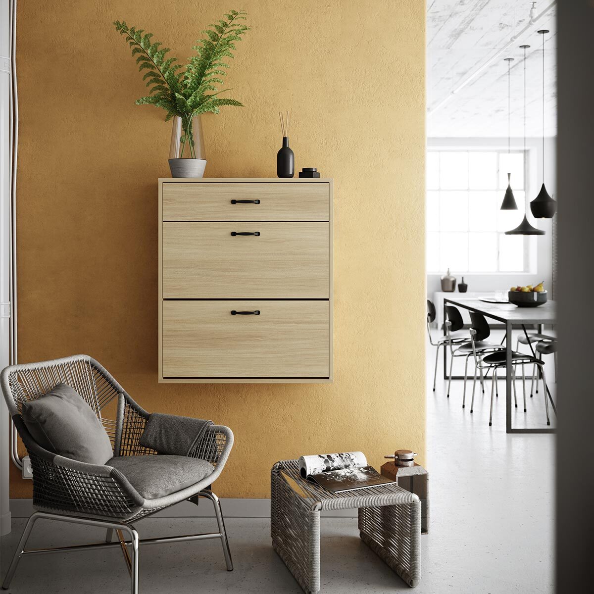 LANEA SBK4 kombinerer smart oppbevaring med praktisk funksjonalitet. To romslige kurver til sko og en funksjonell oppbevaringsboks til hverdagsgjenstander som nøkler, hundesnorer eller papirer skaper orden i entréen. Muligheten for veggmontering gir fleksibilitet i plasseringen.