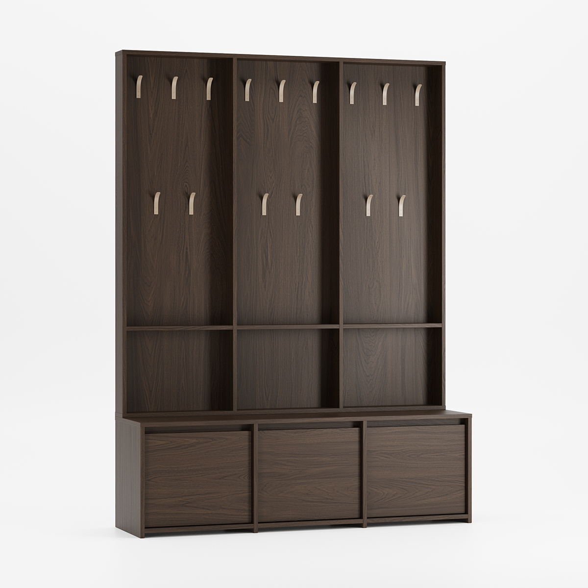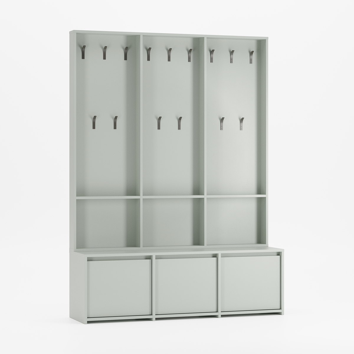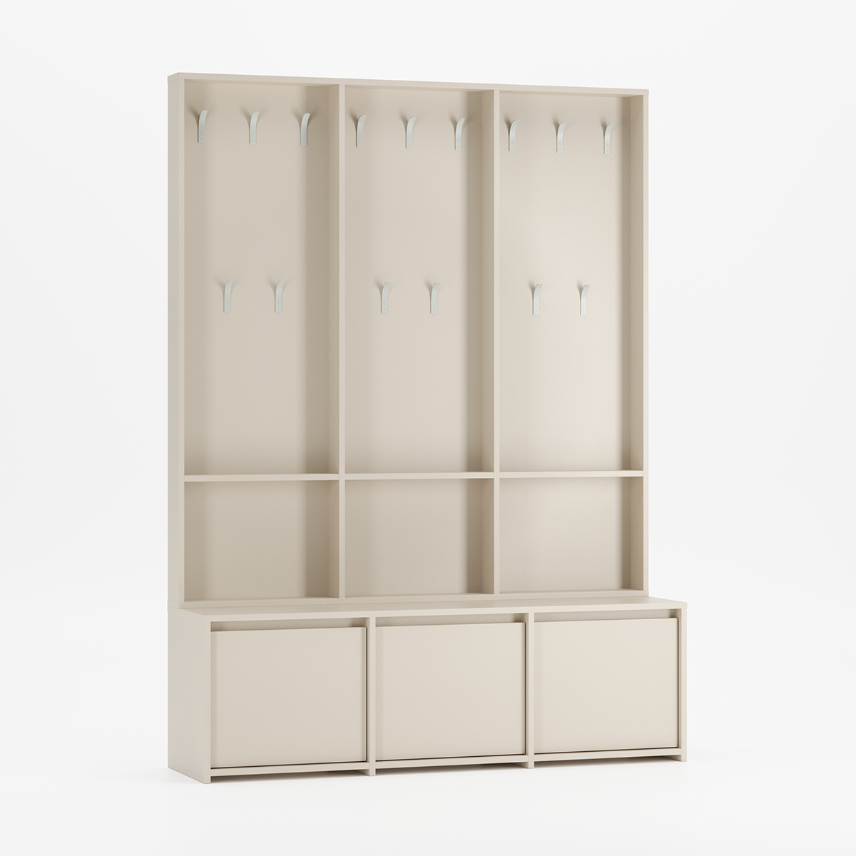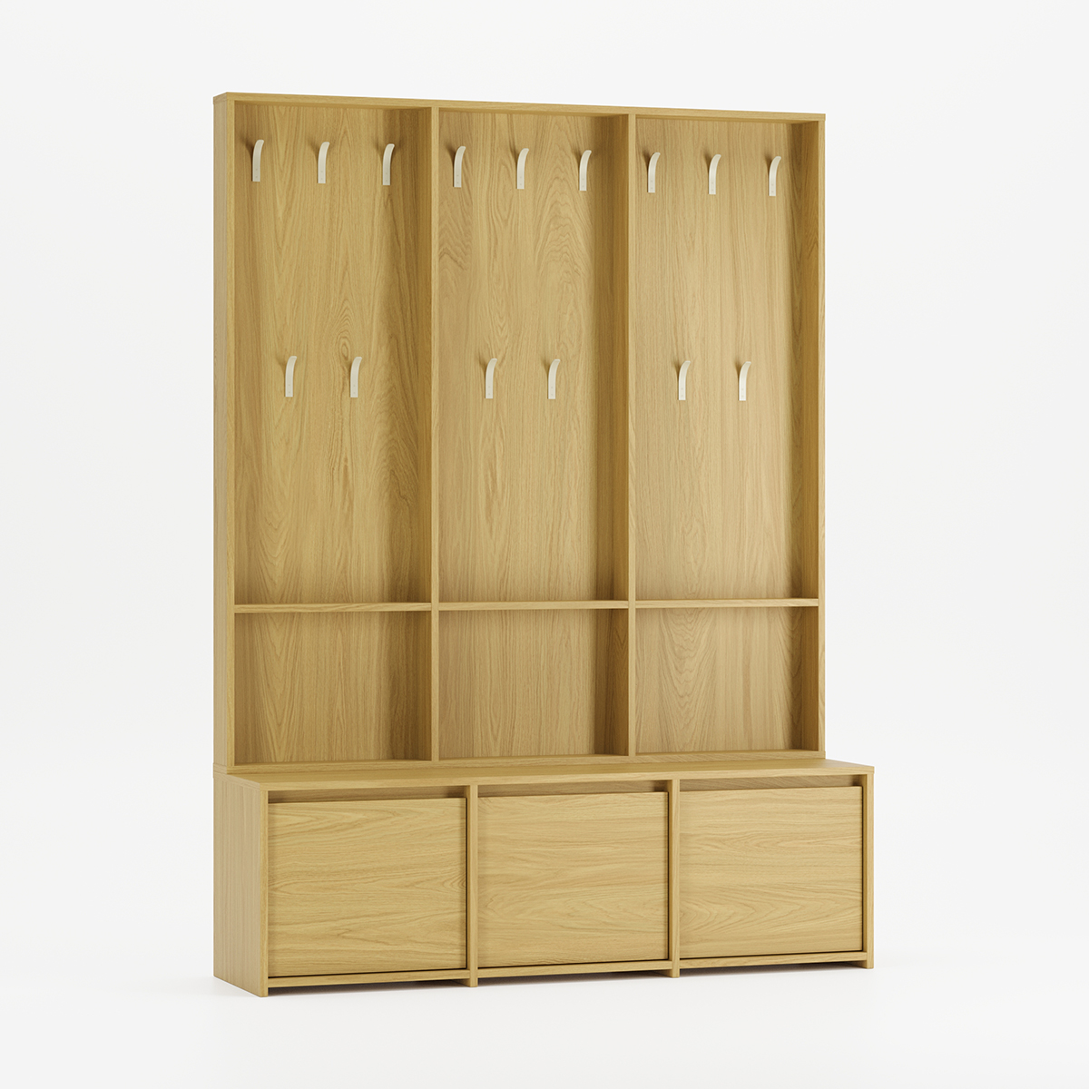 RAGNAR entresett kombinerer et tredelt skoskap med treseksjons knagerrekke i en rommelig løsning for store entréer. Tre separate rom med hydrauliske dempere gir rikelig plass til alle skoene, mens knaggrekken med hyller i hver seksjon holder klær og vesker organisert for hele familien.