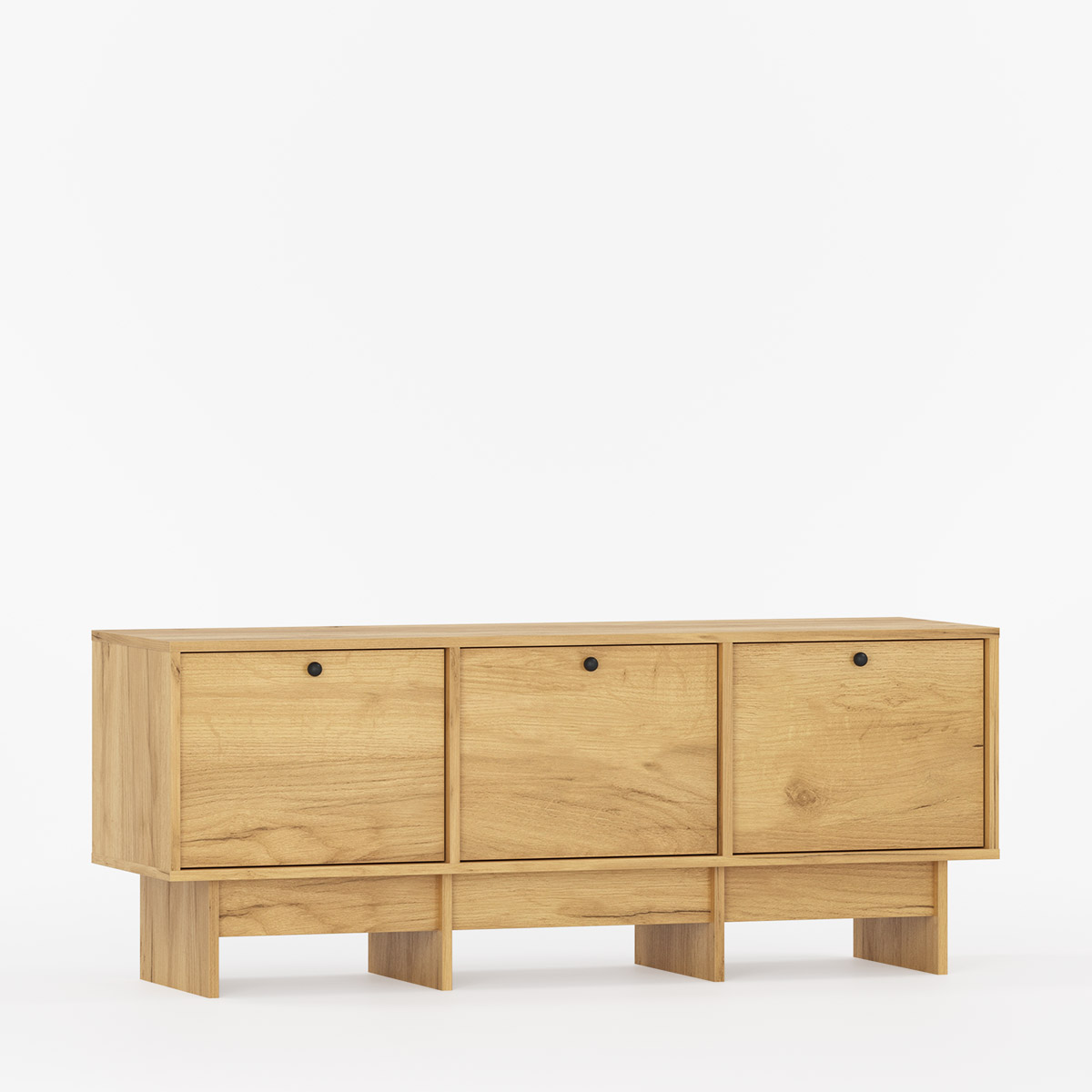Bak de tre dørene skjuler det seg generøs plass med justerbare hyller, perfekt for ulike typer sko gjennom hele året. Den solide konstruksjonen gir trygg sitteplass for opptil tre personer, mens håndtakene gjør åpning lett for både voksne og barn.