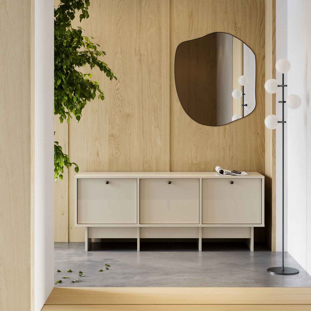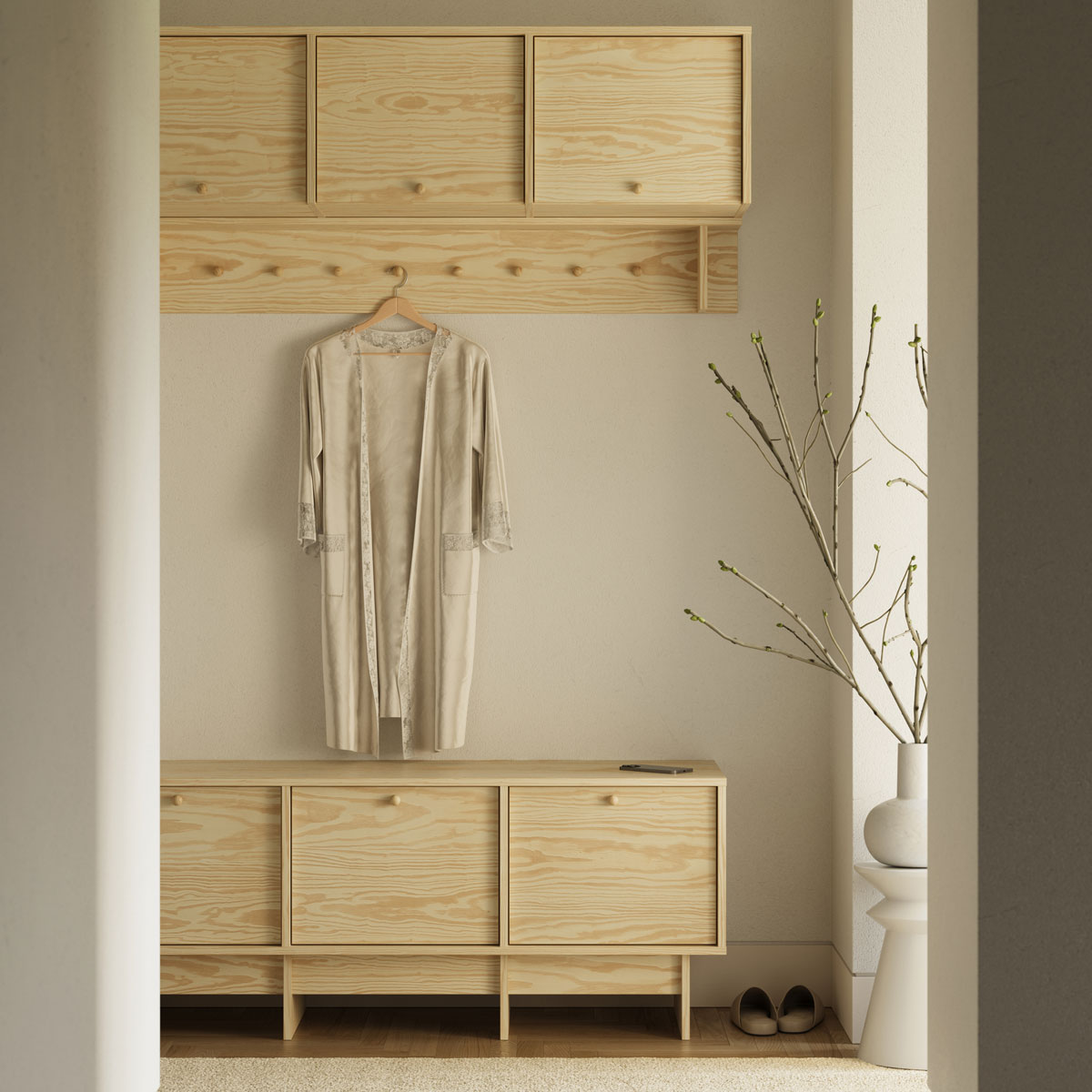 Denne modellen kombinerer japansk-inspirert estetikk med funksjonell oppbevaring for romslige entréer. De rene linjene og den balanserte silhuetten gjør den til et naturlig midtpunkt nær inngangspartiet, hvor den gir både orden og et innbydende preg.