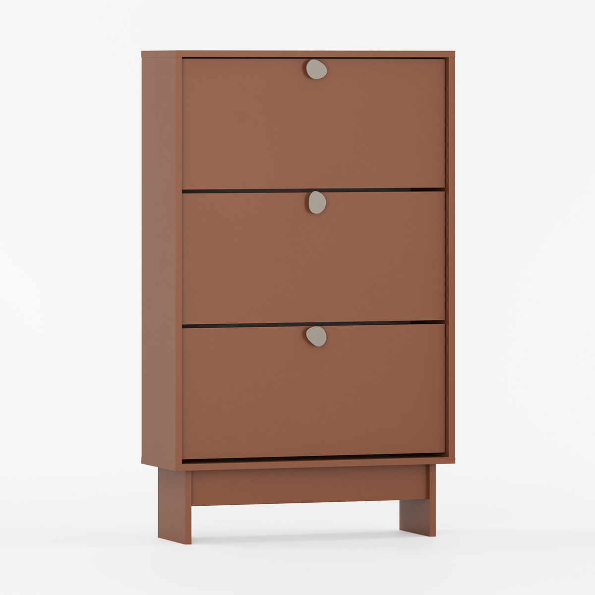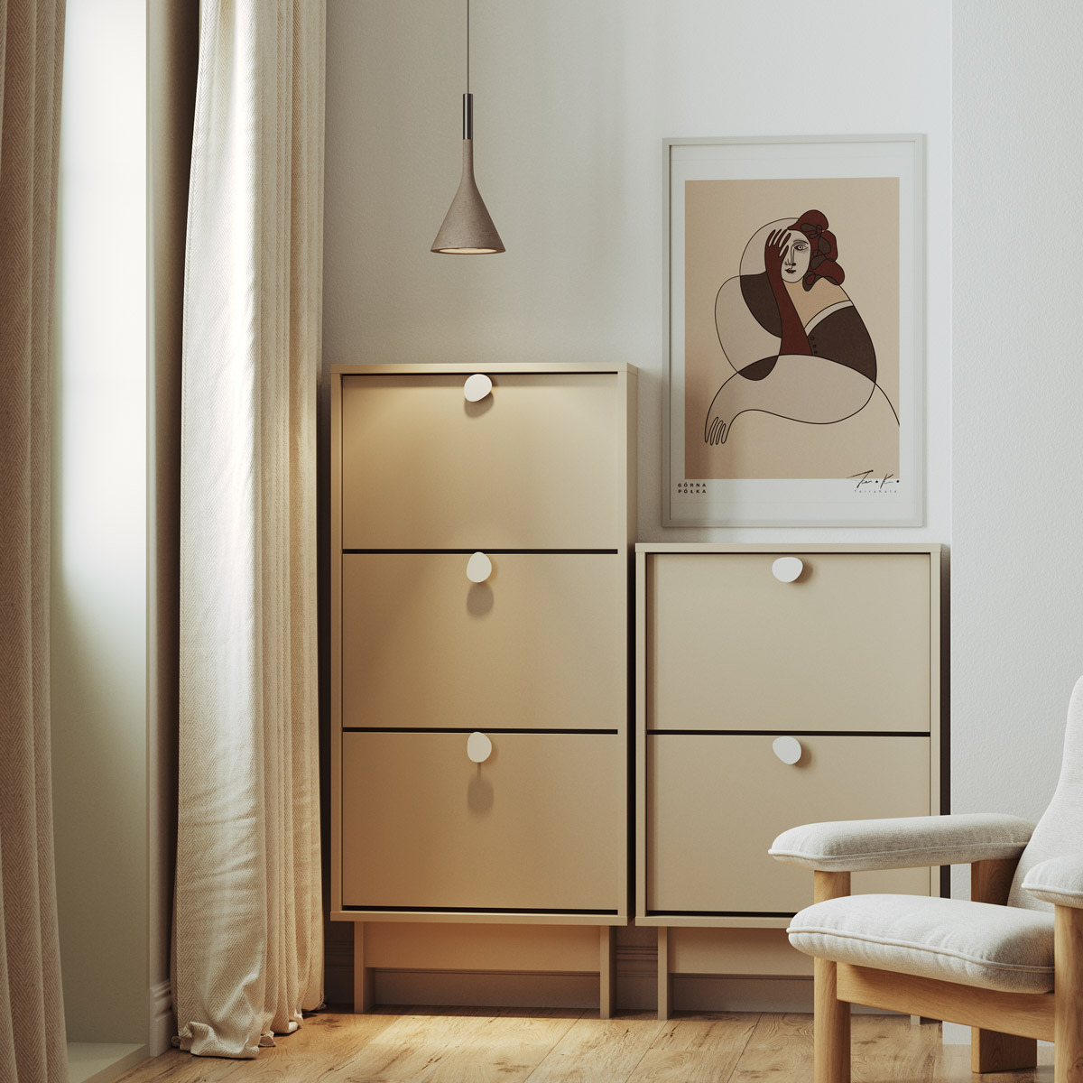 Skapets rene linjer og tilbaketrukne fronter skaper en rolig rytme i rommet. Den geometriske formen og de karakteristiske håndtakene gir møbelet en tidløs karakter som passer naturlig inn i moderne hjem.