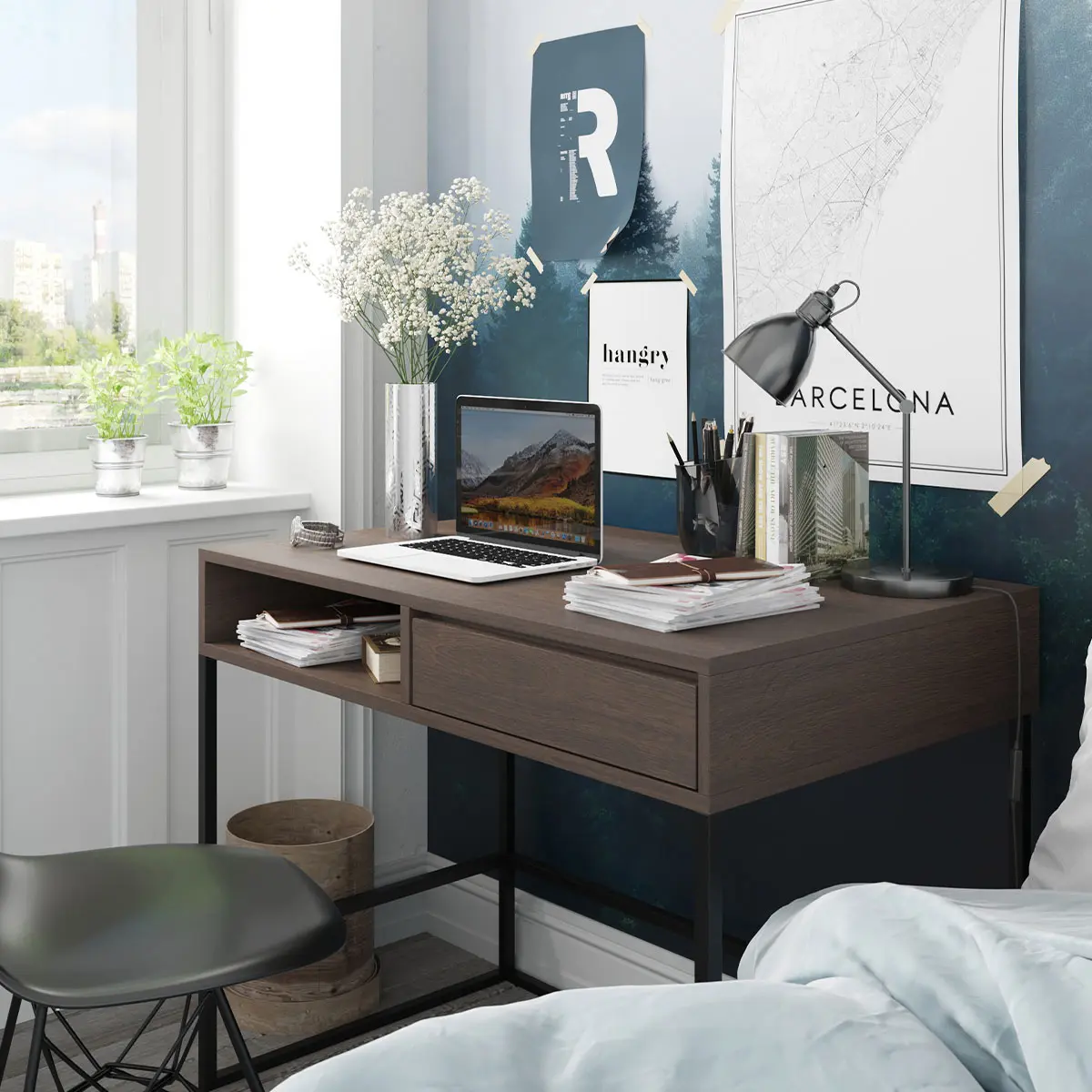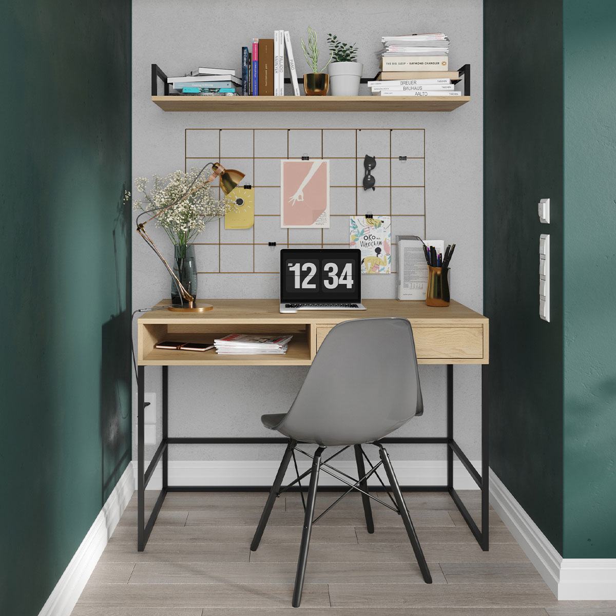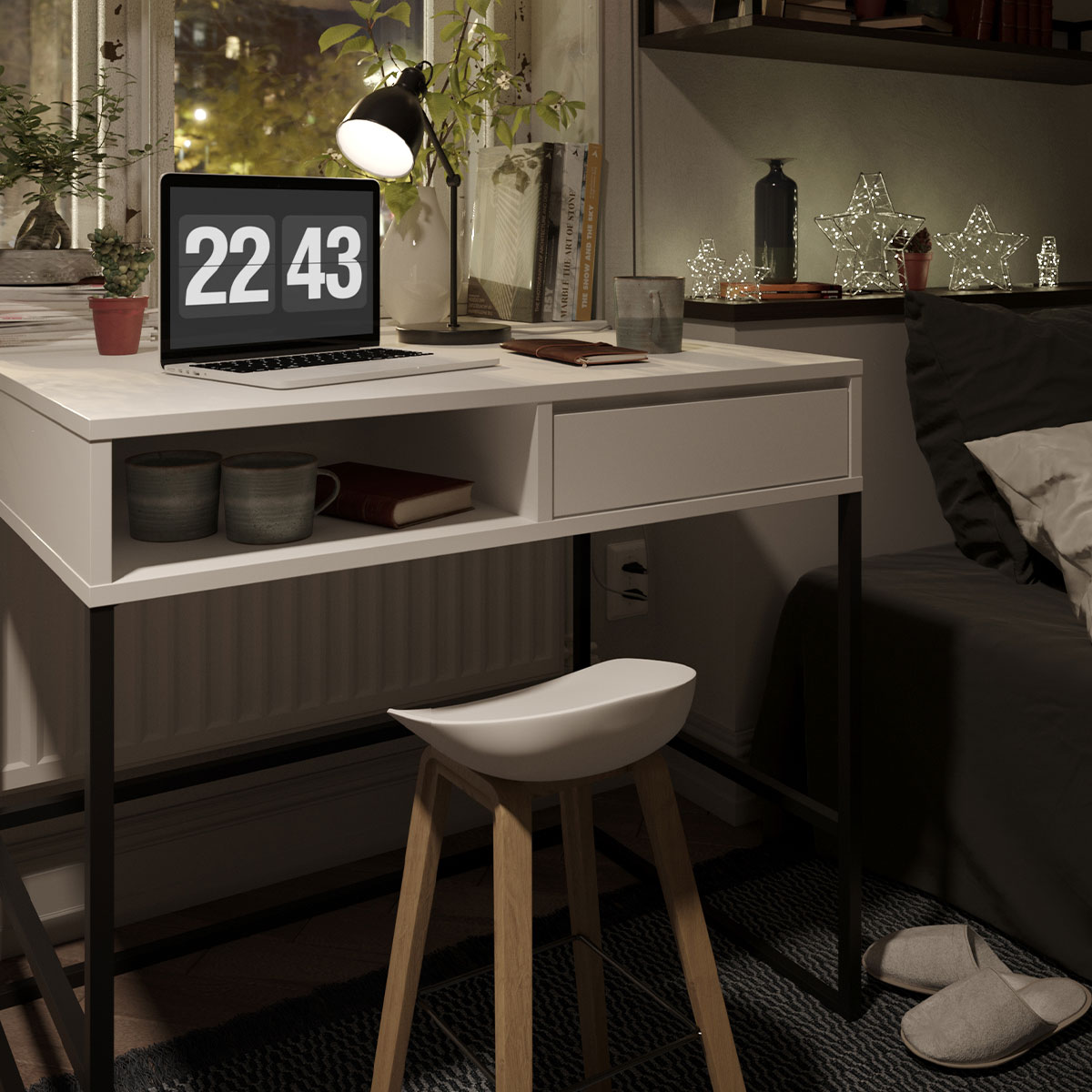 Den lett fremskutte bordplaten gjør det mulig å plassere skrivebordet tett mot veggen selv med gulvlister, og under platen finnes en delt hylle og en skuff – ideelt for tilbehør eller småting du vil ha innen rekkevidde.