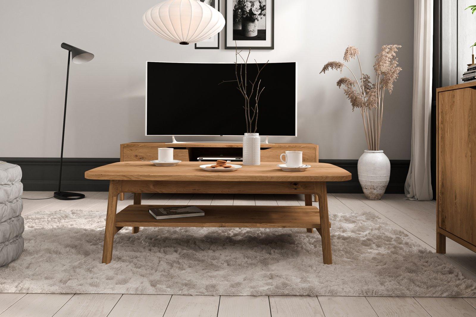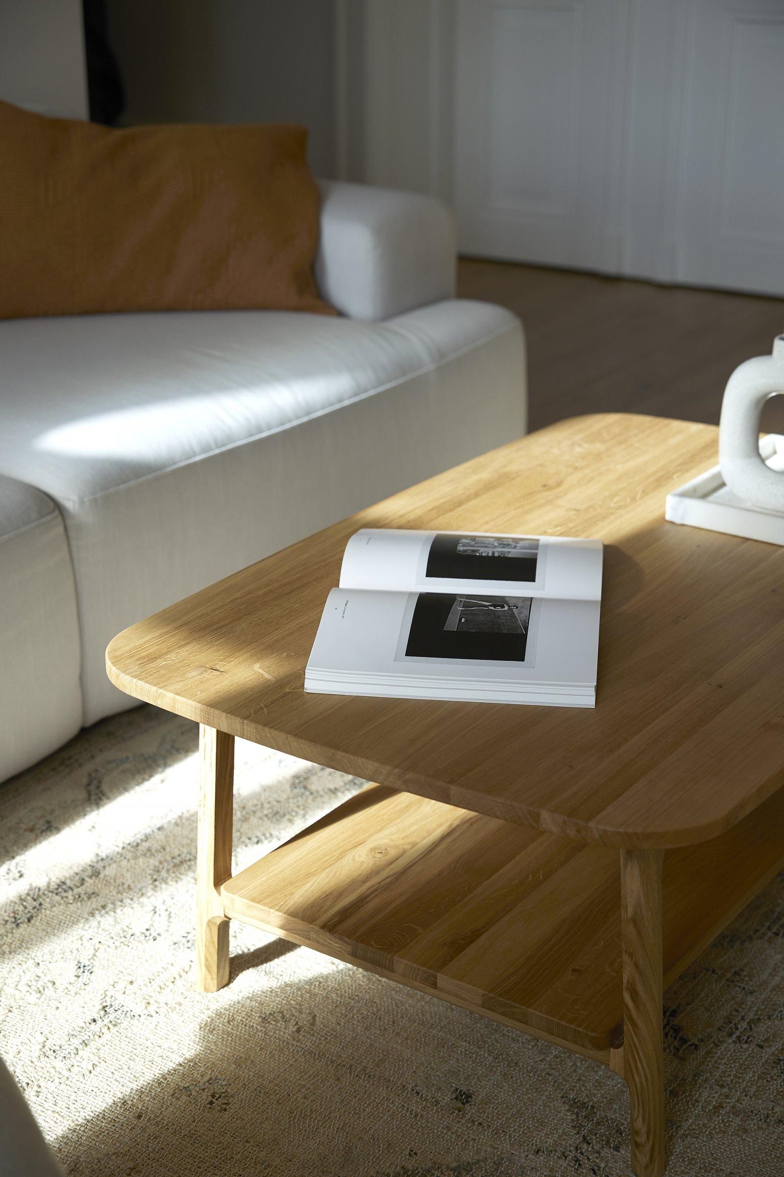 Med myke, avrundede kanter og en praktisk hylle til favorittbøkene eller magasinene dine, bringer dette bordet både funksjonalitet og varme inn i hjemmet. Det massive treet og de naturlige formene forener estetikk og ro – akkurat som naturen selv.