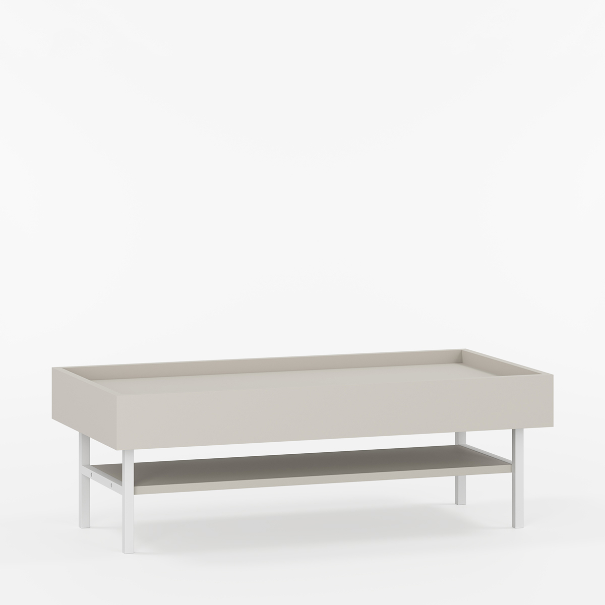 De karakteristiske kantene på både toppplate og hylle beskytter og definerer bordets funksjon, mens 20 mm stålbenene sikrer stabilitet og gjør rengjøring enkel – også med robotstøvsuger. Både bordplate og stell kan tilpasses i farger.