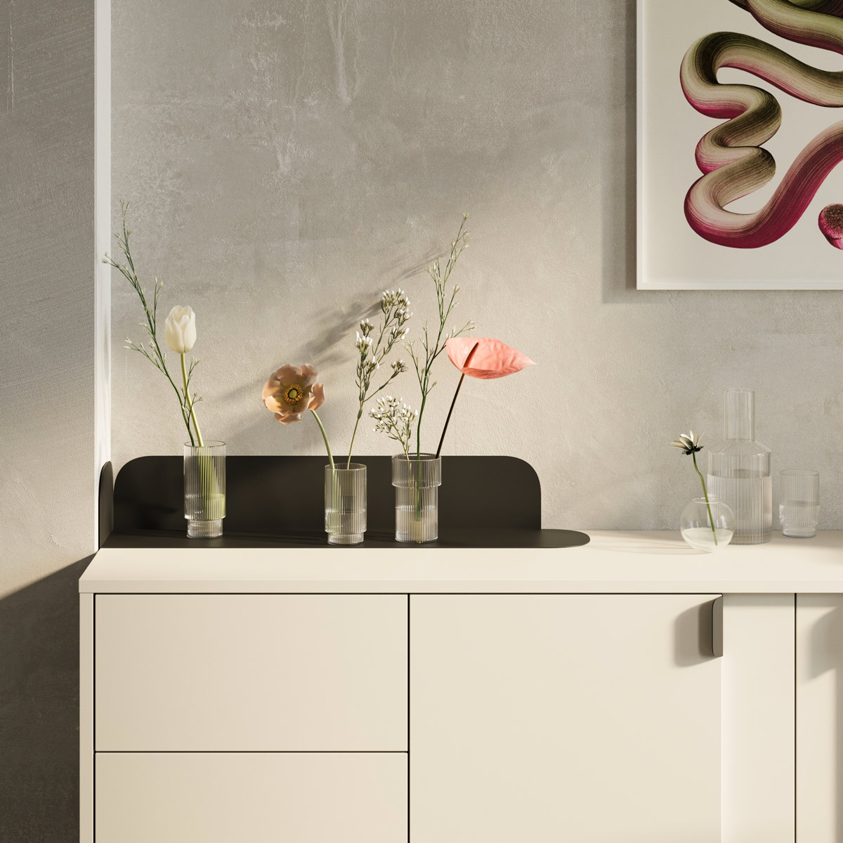 LAYERS LAY81 er en lett og presis stålhylle med myke kanter og grafisk tilstedeværelse. Den fungerer like godt alene som i serie, og gir plass til bøker, gjenstander, små samlinger – eller får stå som form i seg selv.