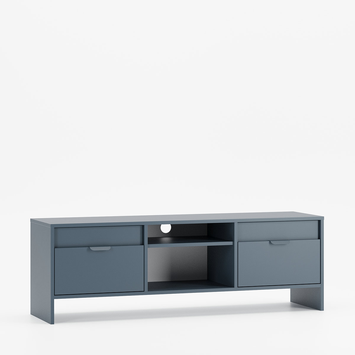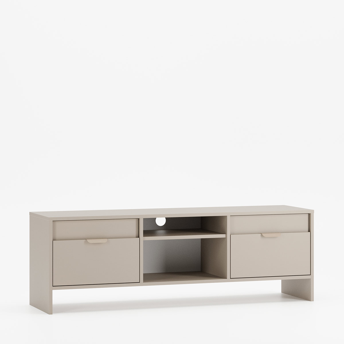 - Tre tydeligt adskilte sektioner under bordpladen – en åben midtersektion med synlig indvendig hylde, og på hver side to lukkede sektioner med låger med matchende håndtag – der åbnes nedad som klapper, hver med en justerbar indvendig hylde