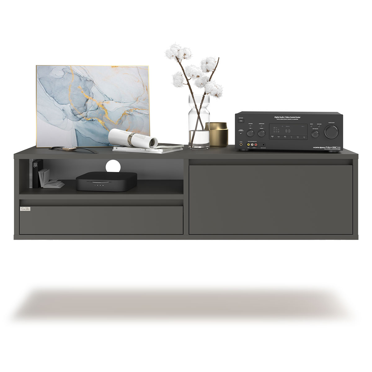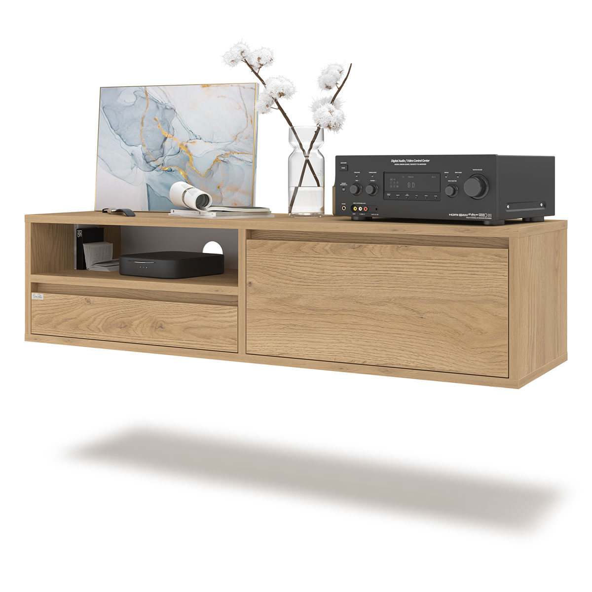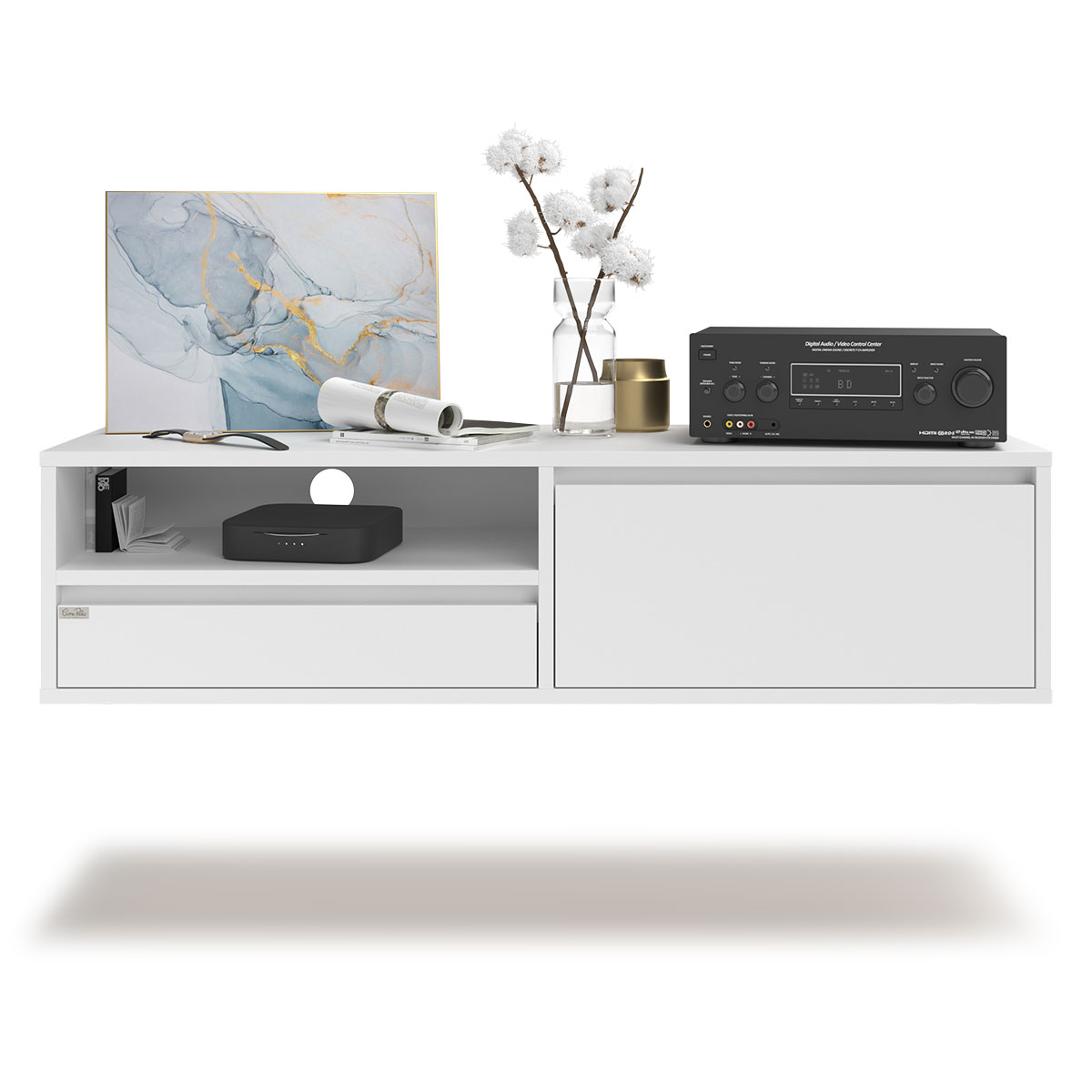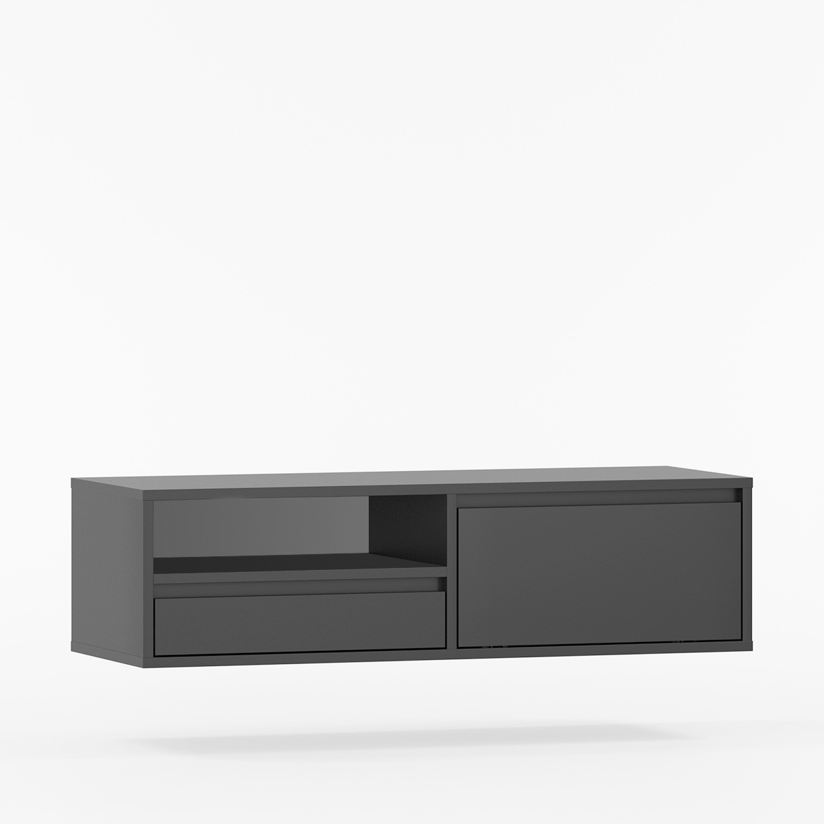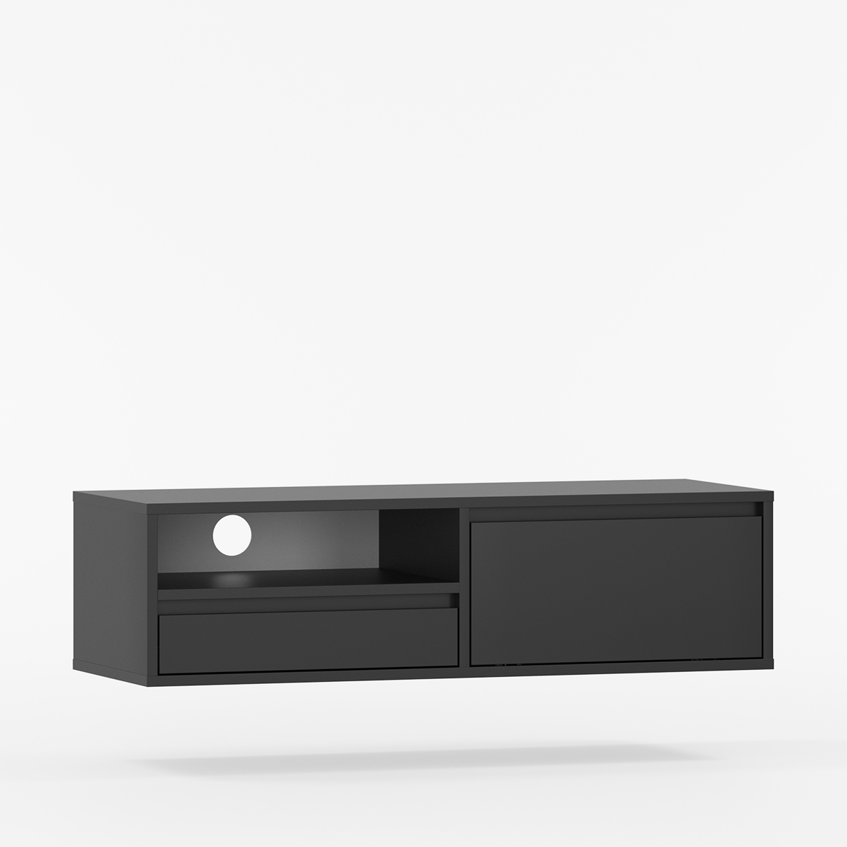 UBBE WTV1 gir små rom maksimal funksjon med minimalt fotavtrykk. To seksjoner med åpen hylle, praktisk skuff og skap med dør skaper fleksibel oppbevaring, mens topplaten rommer TV, elektronikk og dekorasjoner.