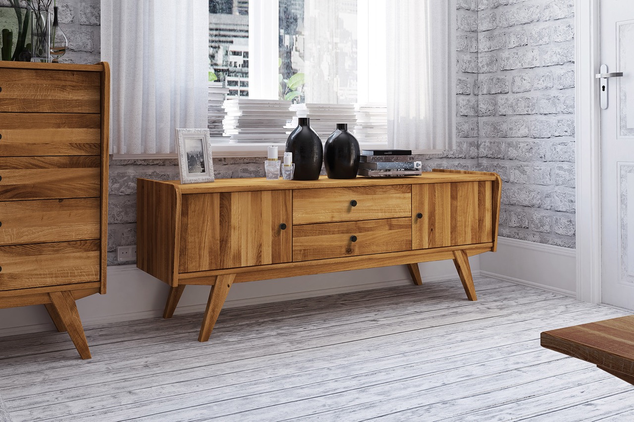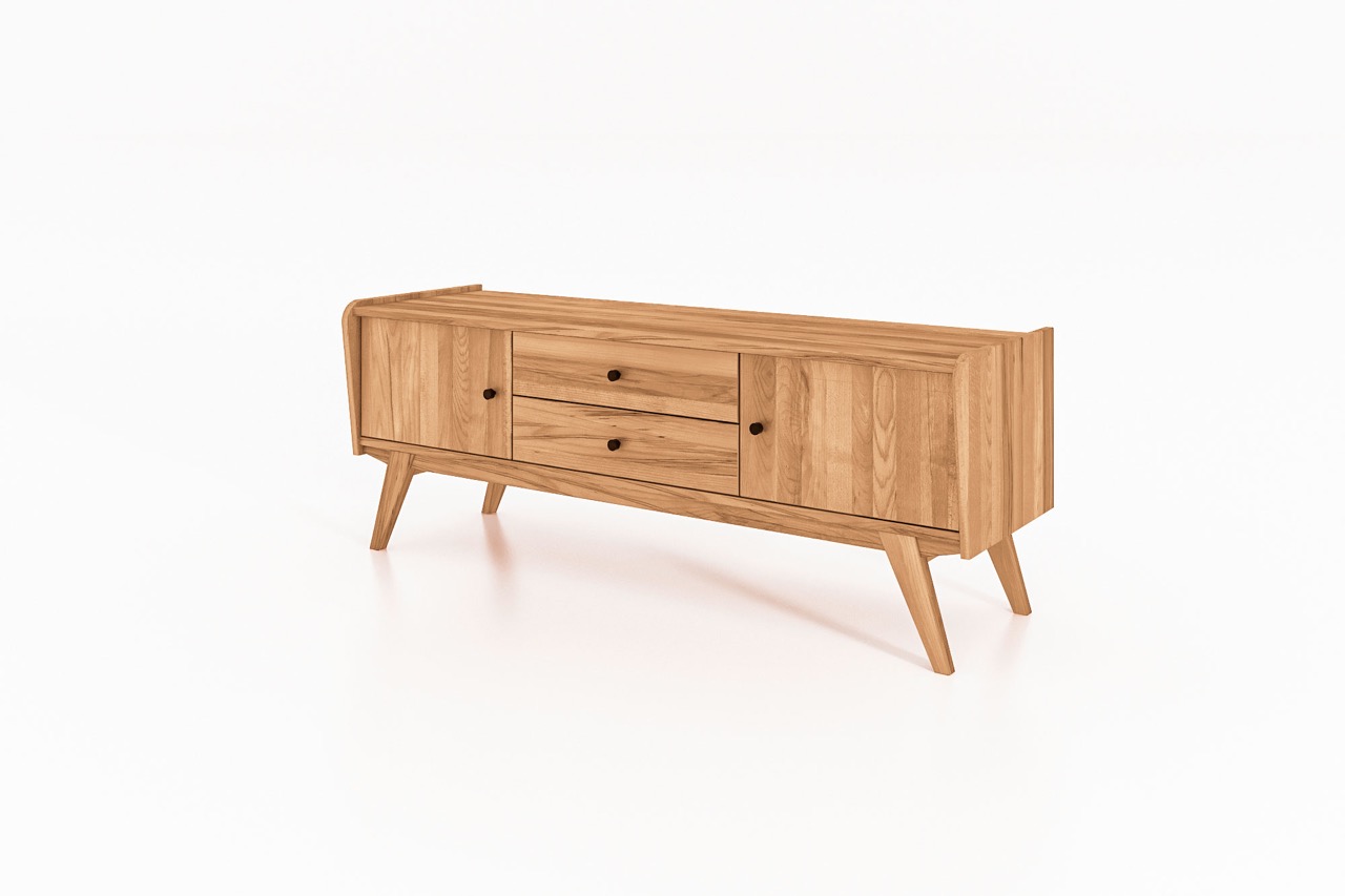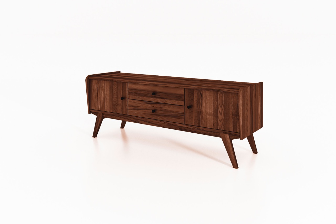 En TV-benk som forener praktisk oppbevaring med retroeleganse – designet for Windes’ filosofi om harmonisk funksjonalitet og naturlig skjønnhet.