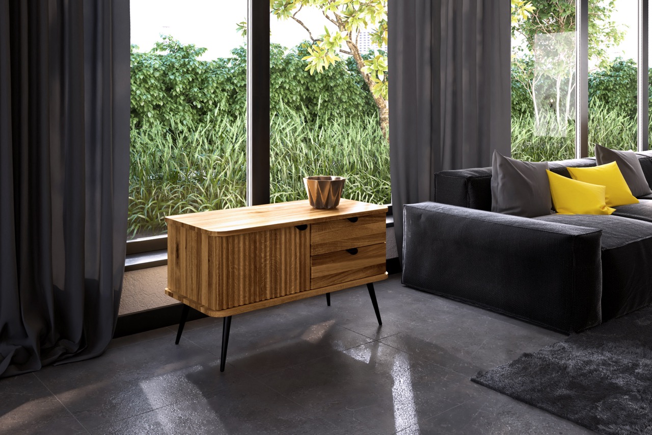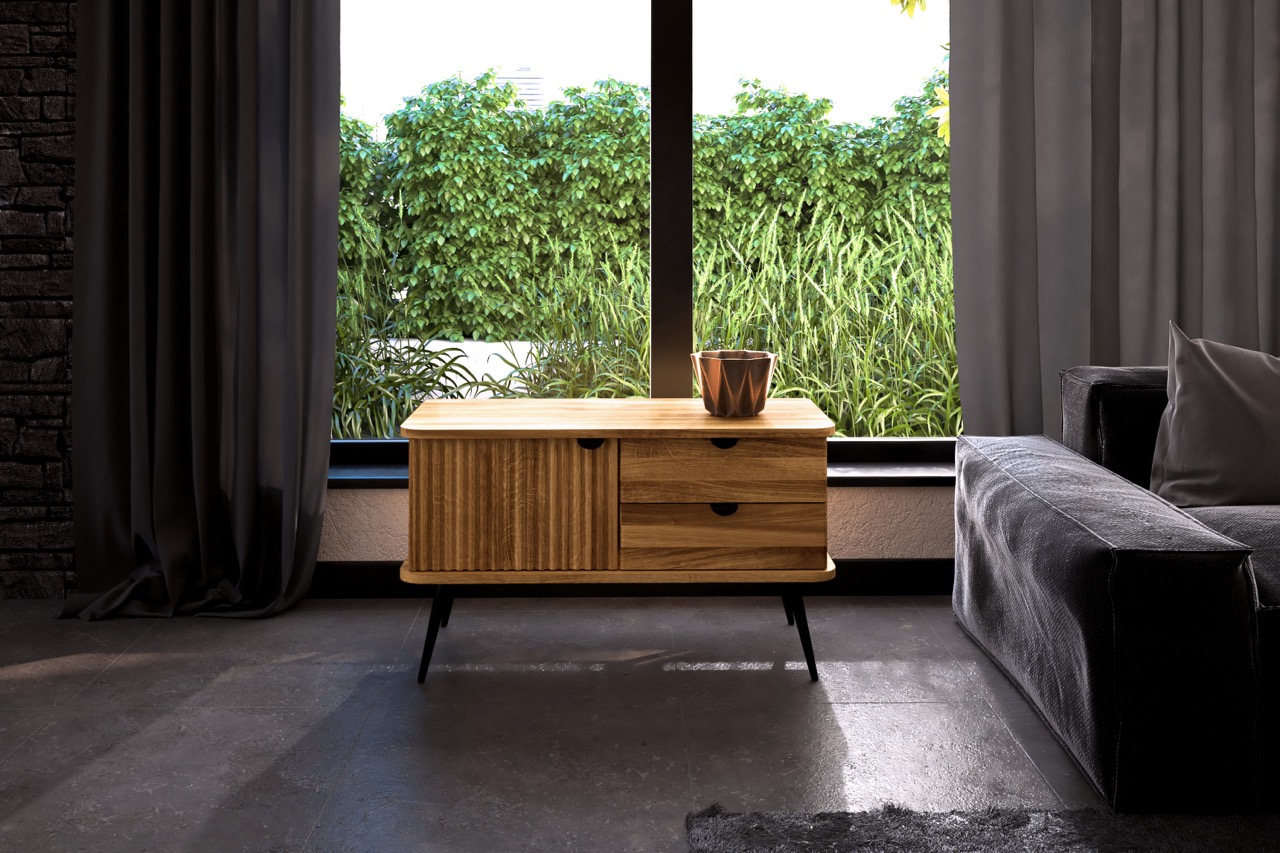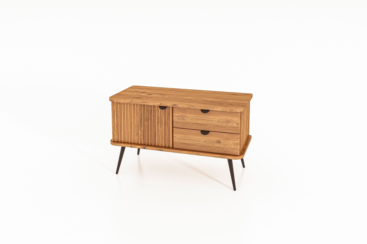 Denne kompakte modellen fra KULA-serien kombinerer funksjon og finesse i et balansert uttrykk. Til venstre en karakteristisk riflet dør, til høyre to skuffer – alt utført i massivt tre med sorte metallben og diskrete grep som gir letthet og ro.