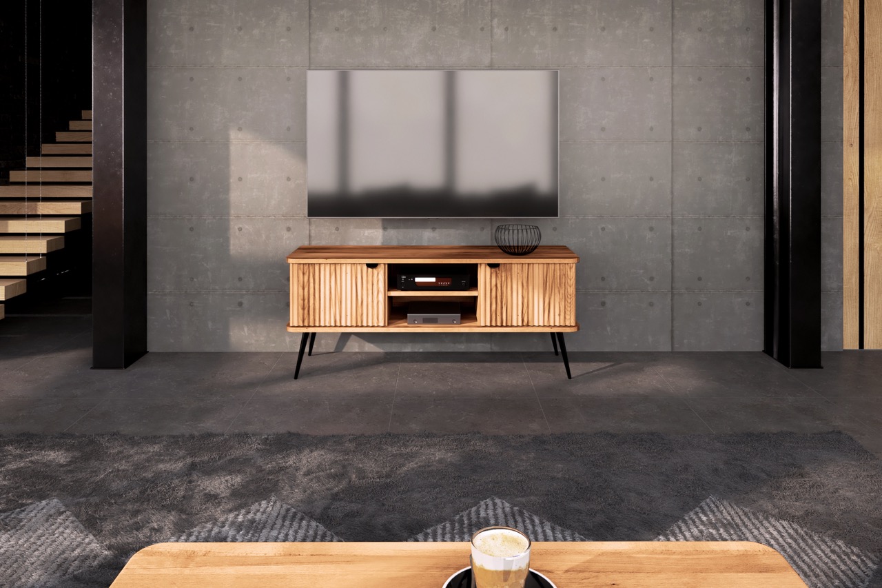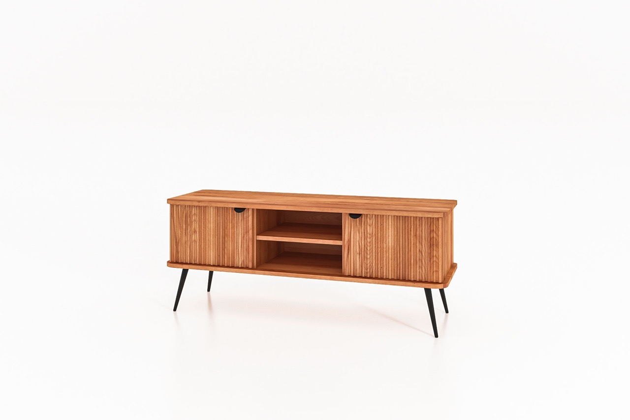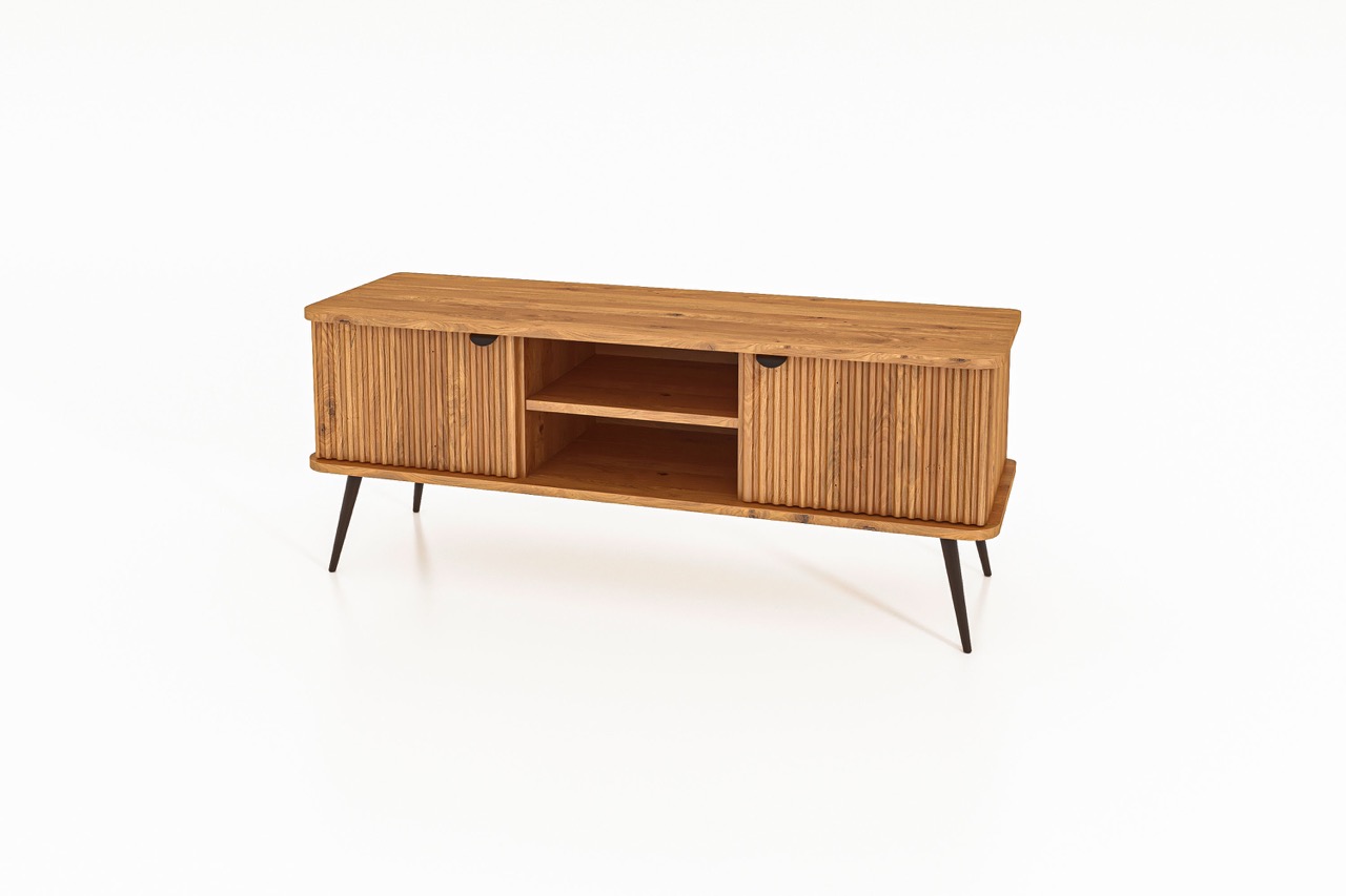 Denne kompakte modellen fra KULA-serien er et harmonisk valg for mindre stuer eller for deg som ønsker et enkelt og balansert uttrykk. De riflede frontene skjuler praktisk oppbevaring på sidene, mens midtpartiet med to åpne hyller gir plass til medieutstyr, bøker eller dekorasjoner.