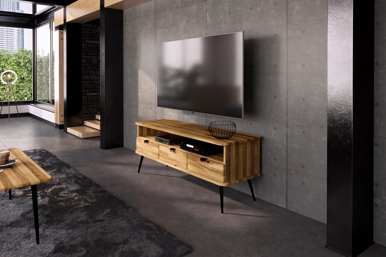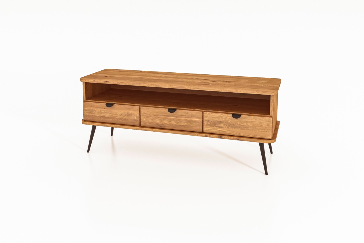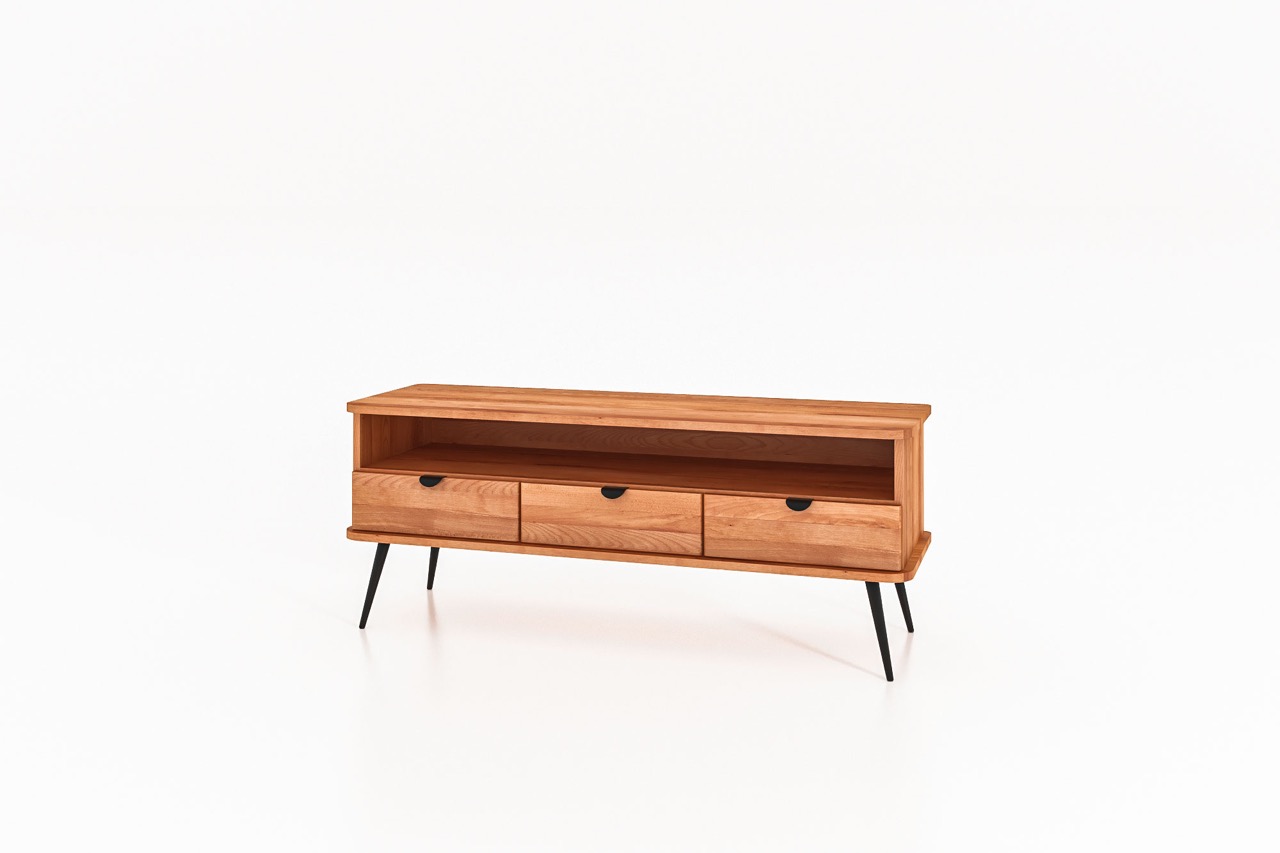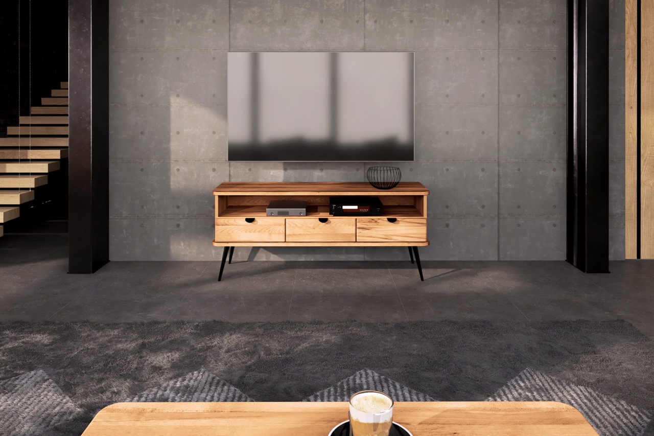 TV-benken kombinerer åpen funksjonalitet med skjult oppbevaring i et harmonisk formspråk. Den brede hyllen øverst gir enkel tilgang til medieutstyr eller dekorative gjenstander, mens de tre skuffene under gir plass til fjernkontroller, ledninger og alt du vil ha ute av syne.