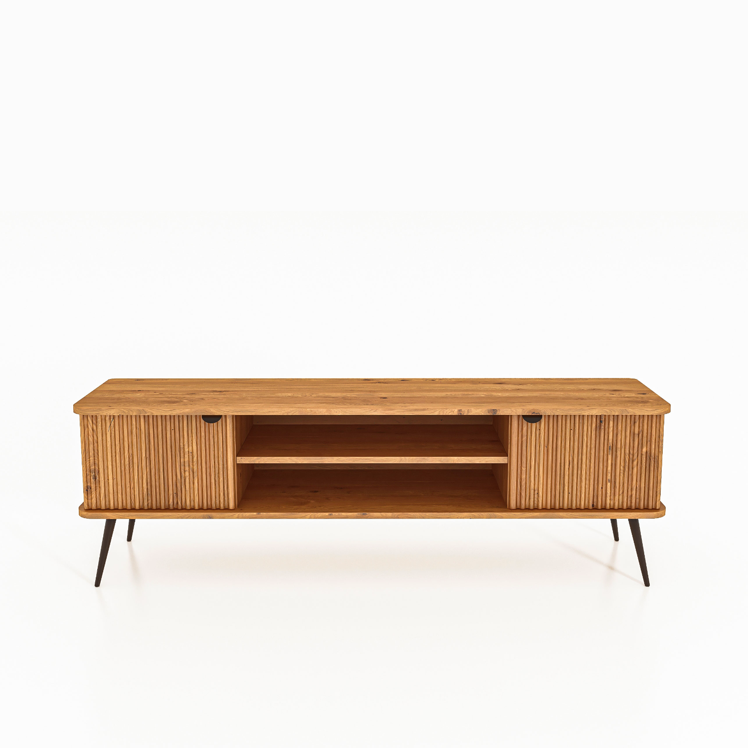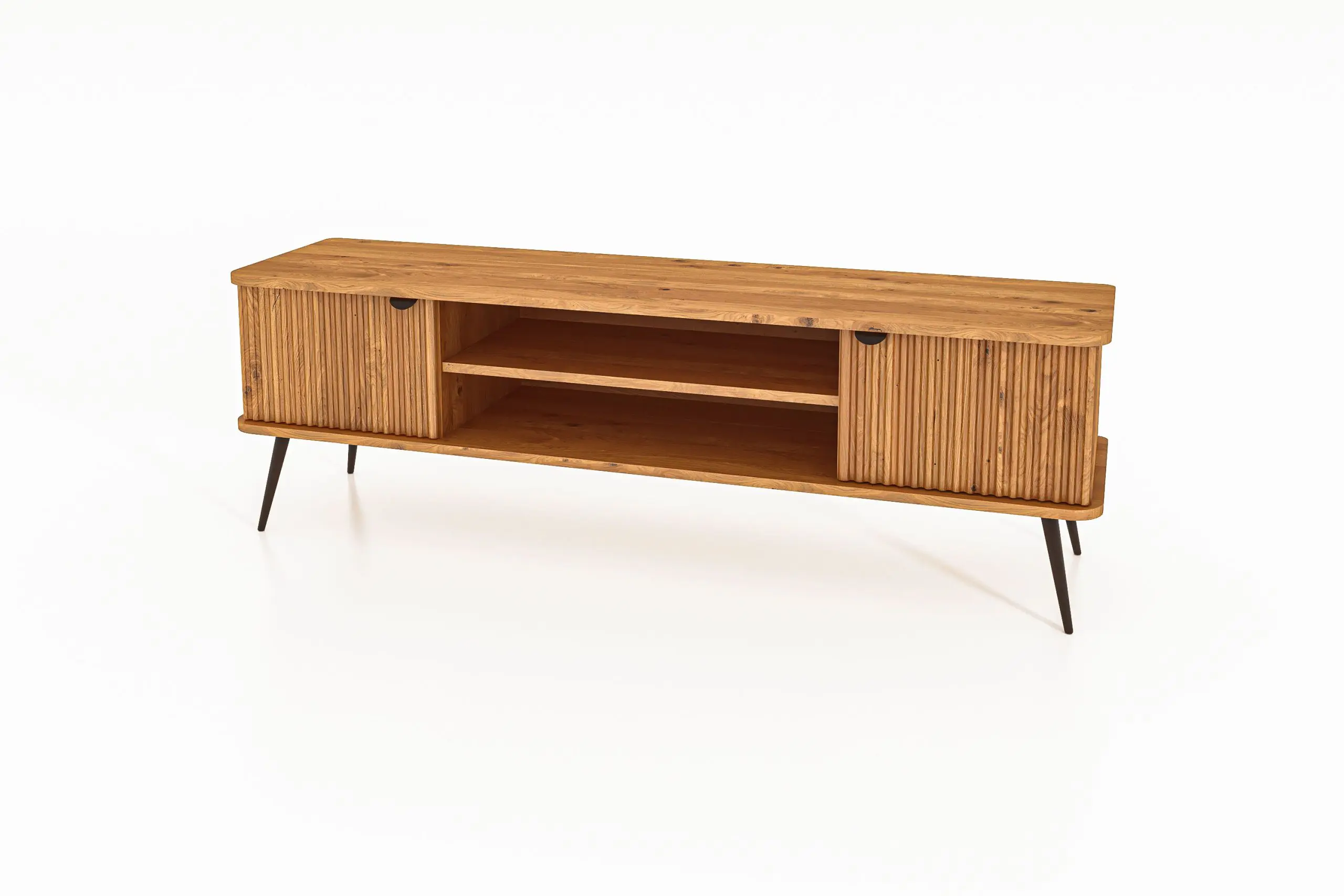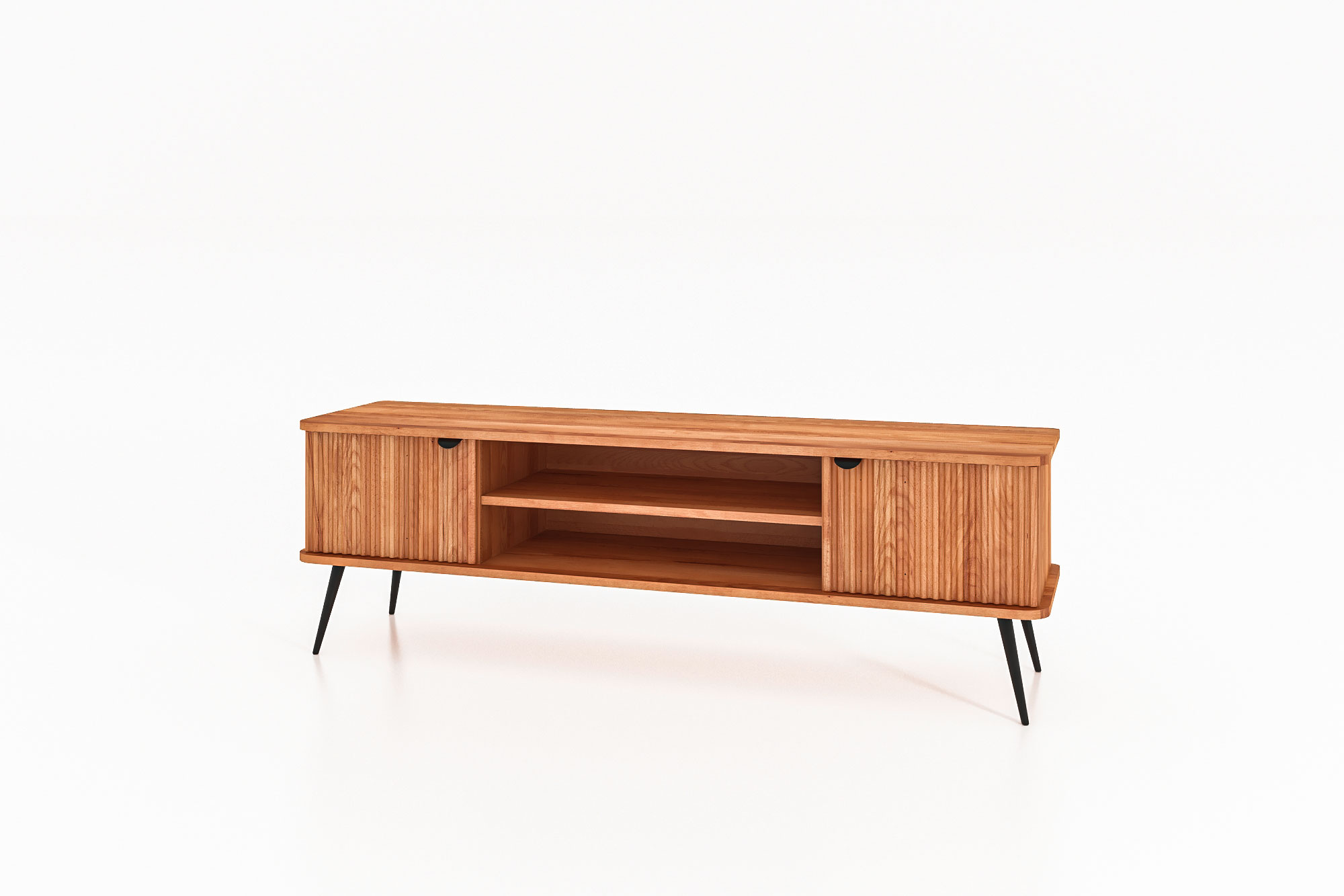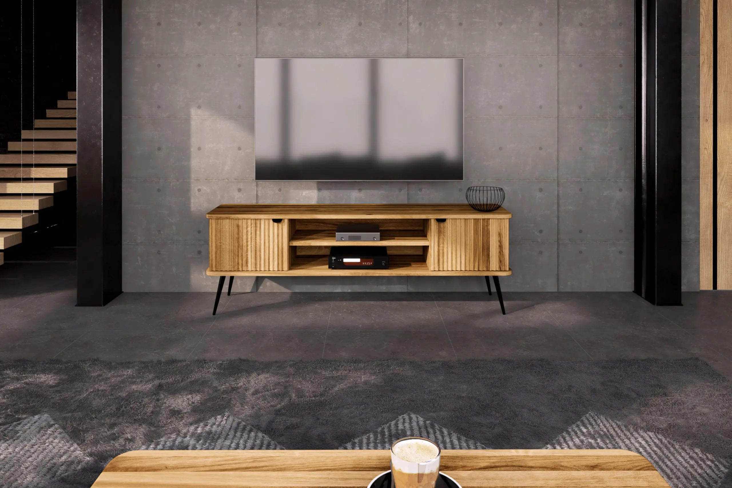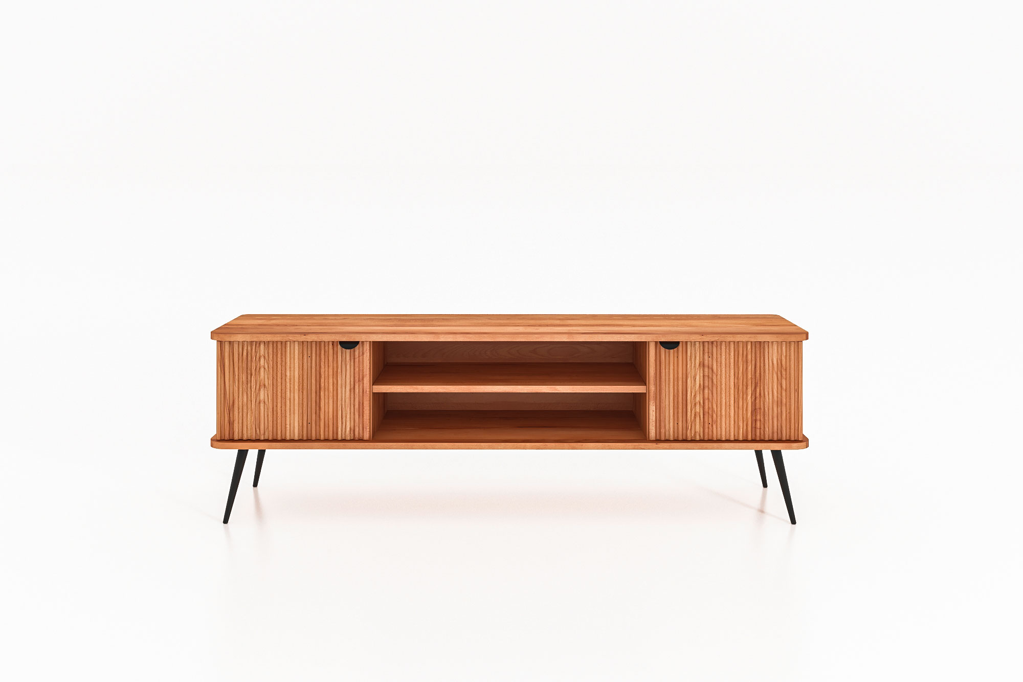 TV-benken er skapt for deg som ønsker et lett og balansert uttrykk i stuen, uten å gi slipp på funksjon. De riflede frontene skjuler praktisk oppbevaring på sidene, mens de åpne hyllene i midten gir plass til elektroniske enheter, bøker eller dekorative detaljer.
