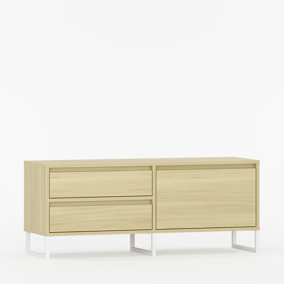 TV-benk med to skuffer, en dør og ben.