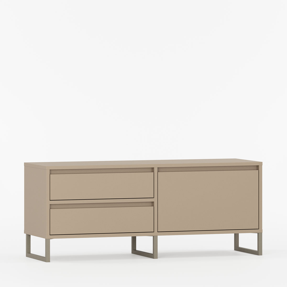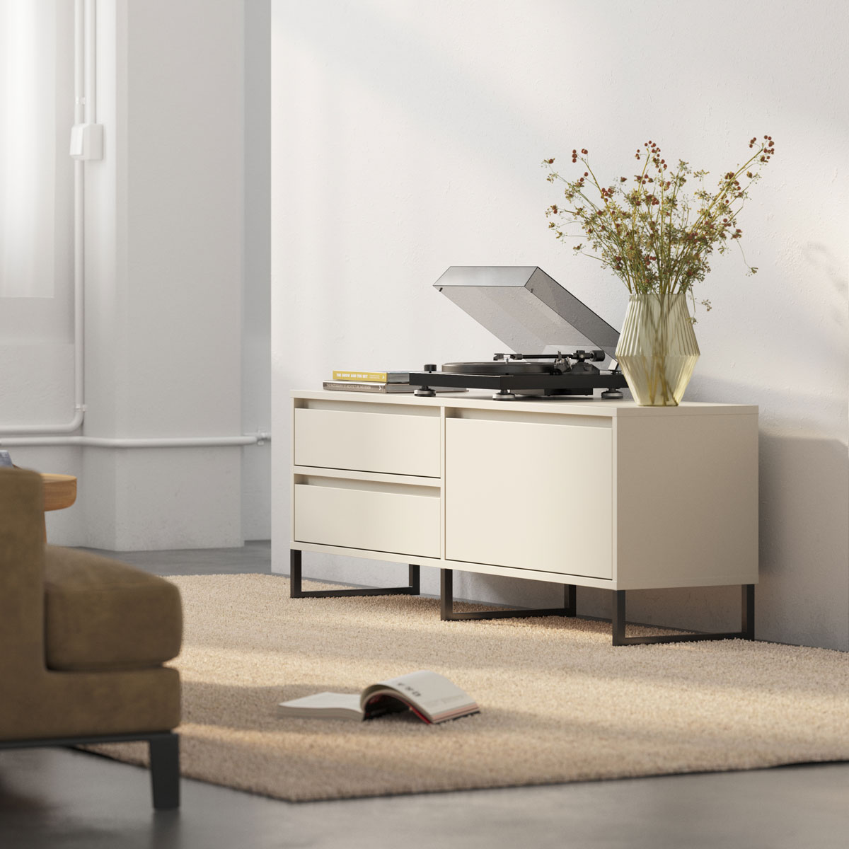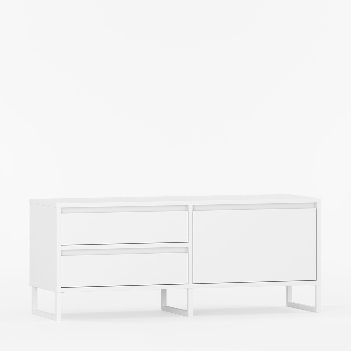 Bordplaten gir romslig plass til musikk-utstyr, elektronikk, spillkonsoller eller dekorasjoner. Kombinasjonen av skuffer og dør skaper fleksibel oppbevaring og ryddig uttrykk. Subtile innsnitt erstatter synlige håndtak og gir ren, moderne estetikk.