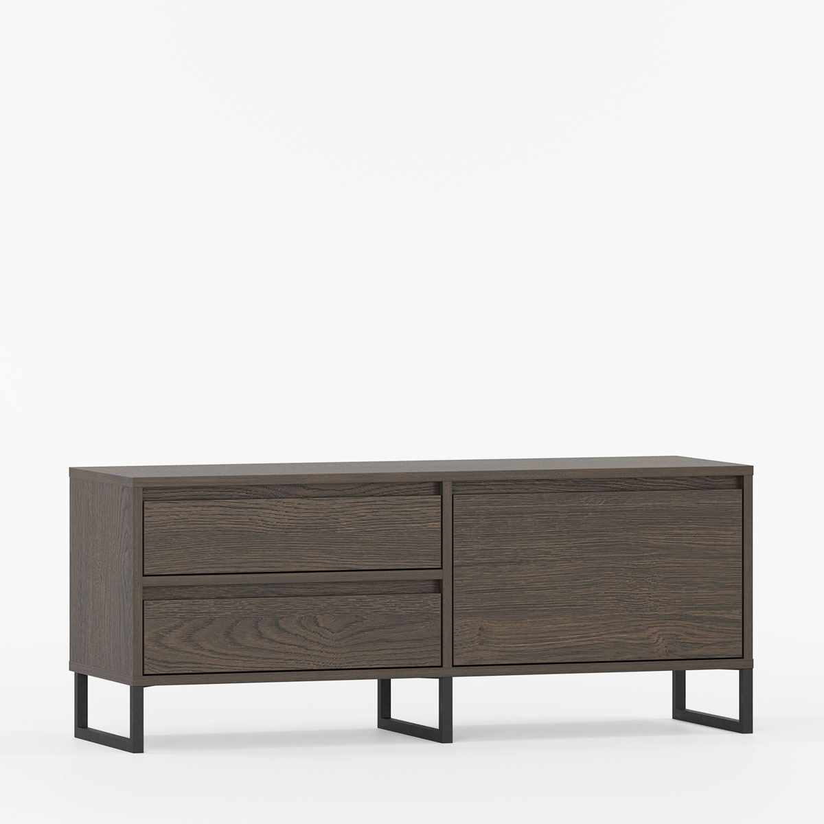 BJORN BTV1S kombinerer skandinavisk estetikk med industriell stil i et kompakt møbel skapt for mindre stuer, soverom og små oppholdsrom. To komplementære seksjoner – to skuffer plassert over hverandre og fullt lukket rom med dør som åpner nedover – gir optimal organisering.