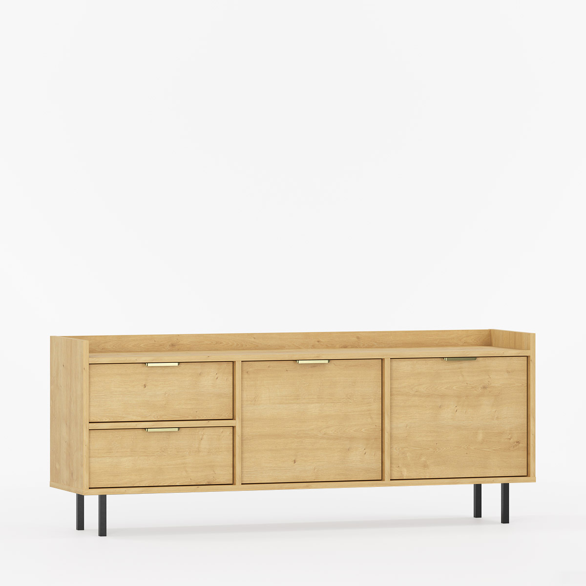 SIGI STV2S er en ryddig og luftig TV-benk som både viser frem og skjuler det som skal være borte. To skuffer og to dører gir god plass til alt fra medier til daglige ting, og kanten rundt toppen holder TV-en og dekorasjonen på plass.