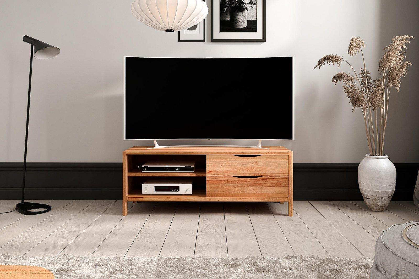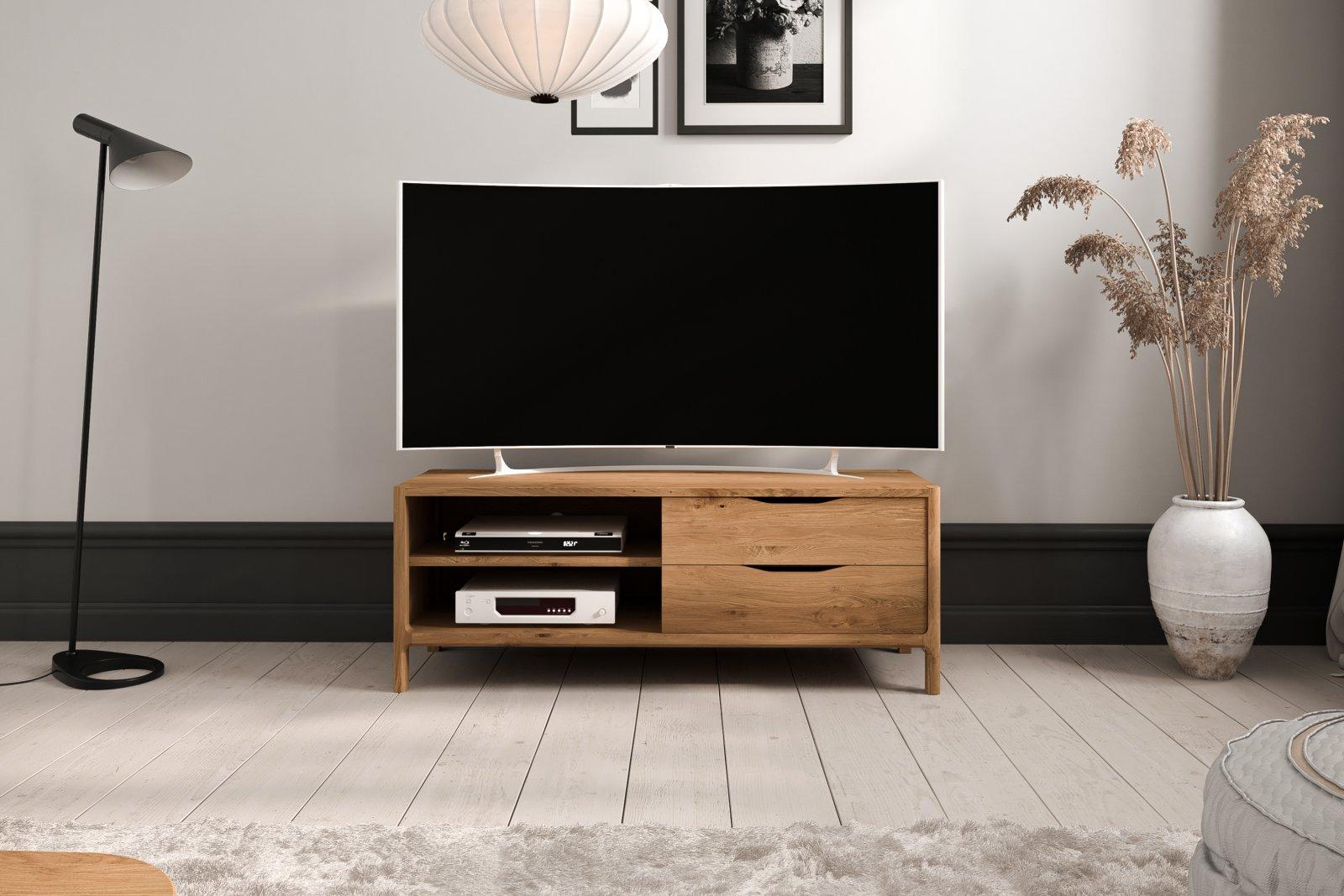 Skapt i massivt tre og behandlet med naturlig olje fremheves hver eneste årering og struktur med ekthet og varme. De to skuffene gir plass til det du gjerne vil gjemme bort, mens de åpne rommene og diskrete kabelhull sikrer at elektronikk kan inngå uten å forstyrre helheten.
