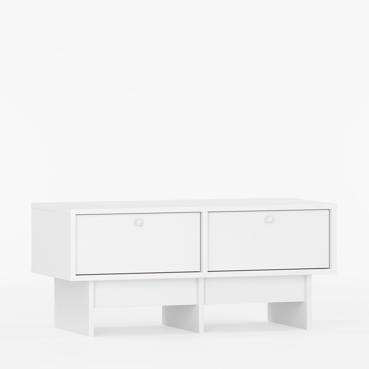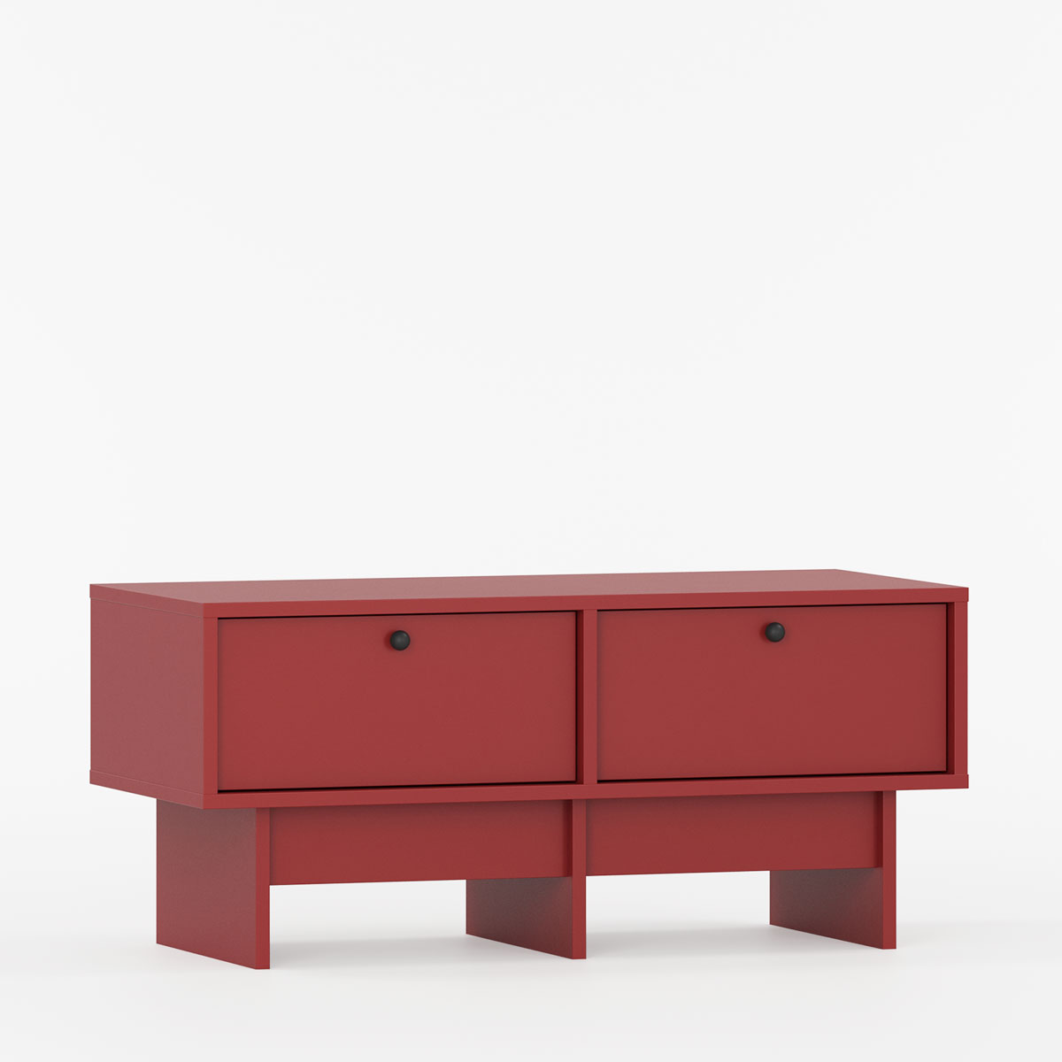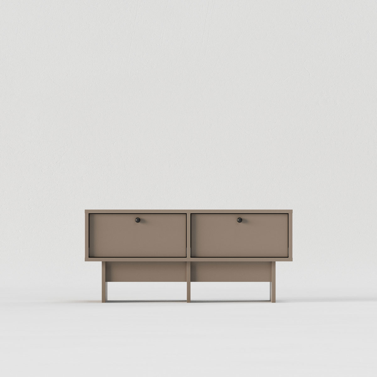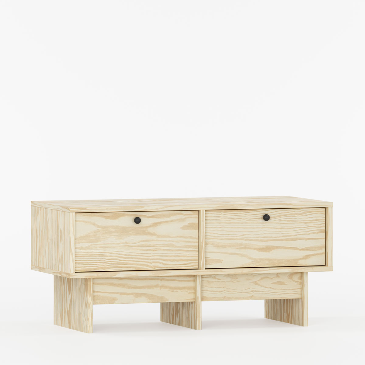 To romslige skuffer holder orden på alt fra TV-tilbehør til bøker og småting, mens topplaten gir plass til både skjerm og dekor. Den karakteristiske basen er utformet for å lette rengjøring, og kan bestilles i ønsket bredde, dybde og farge for å passe sømløst inn i hjemmets øvrige stil.