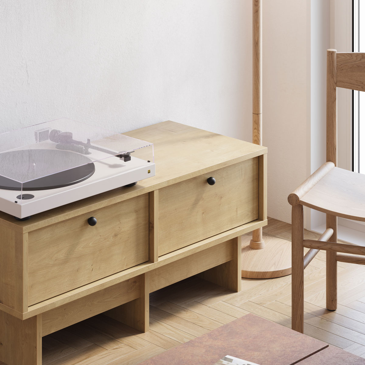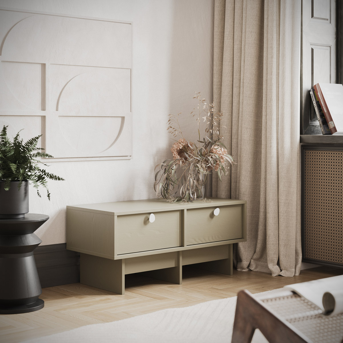 Med et lavt og lett uttrykk passer denne modellen perfekt i mindre stuer, soverom eller kontorer hvor japandi-estetikken står i sentrum. Den minimalistiske konstruksjonen og de subtile håndtakene gir et rent og harmonisk preg, samtidig som møbelet gir praktisk oppbevaring.